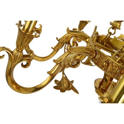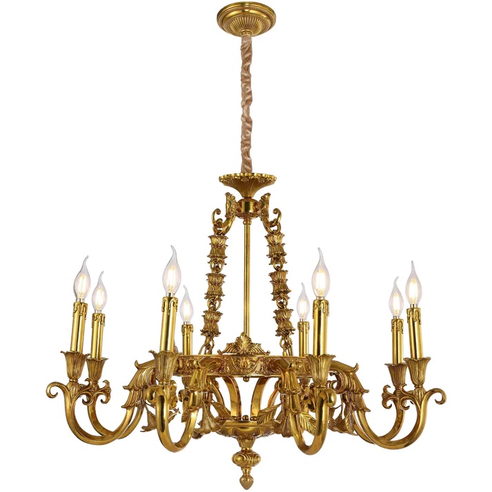 Elevate Your Space with an Exquisite Eight-Arm Brass Chandelier. This gorgeously ornate brass chandelier is a true testament to grandeur and timeless design. With its eight electrified arms, it not only provides ample illumination but also adds a sense of visual weight and sophistication to any space it graces.