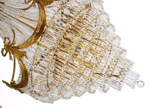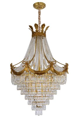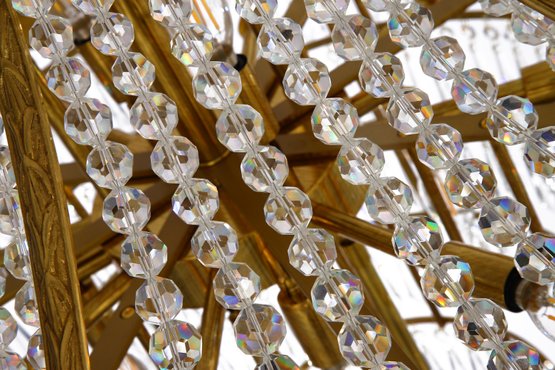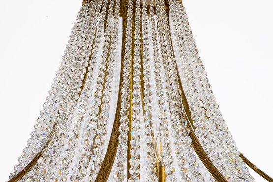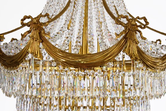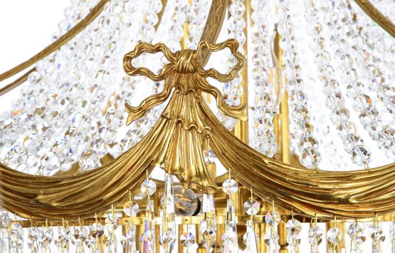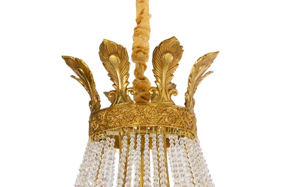 This exquisite chandelier embodies the essence of the Empire style with its flawless symmetry and lavish crystal adornments. Reminiscent of the opulent French Empire era that flourished under the reign of Napoléon I from 1804 to 1815, this chandelier stands as a testament to the era's refined elegance and grandeur.