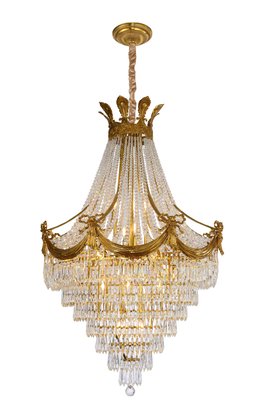 The chandelier's design is a masterpiece of artistry and precision. At its pinnacle rests a peacock feather body dish, reminiscent of a regal crown, serving as a captivating focal point. Every meticulous detail exudes luxury, capturing the essence of the French Empire aesthetic.