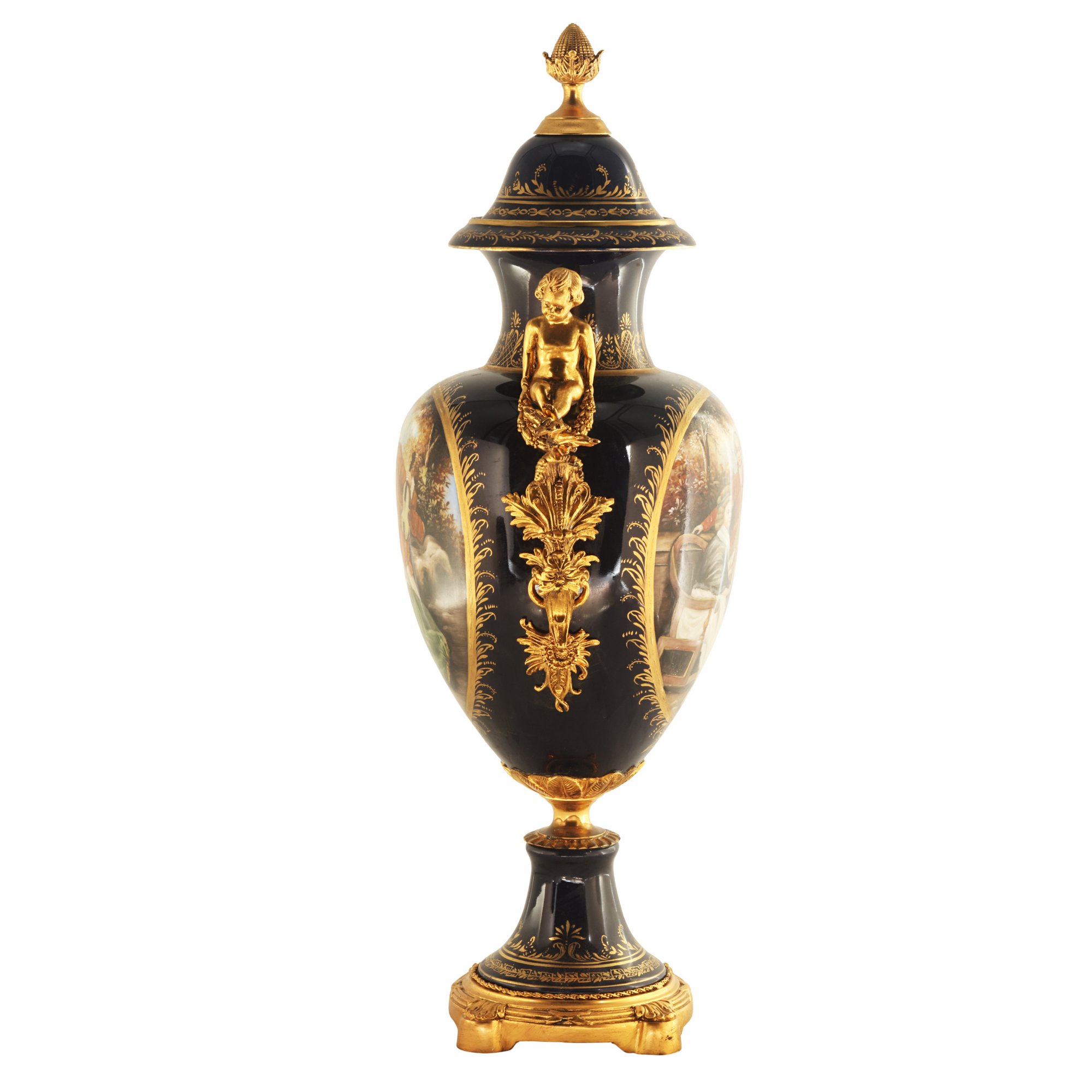 The rich, dark blue hue of the vase serves as a captivating backdrop for the meticulously hand-painted motif. On each side, you'll find a unique Rococo society scene, expertly rendered in shades of green, red, yellow, and blue. These scenes transport you to a bygone era, with individuals dressed in period clothing, engaged in lively interactions within a natural setting.