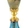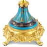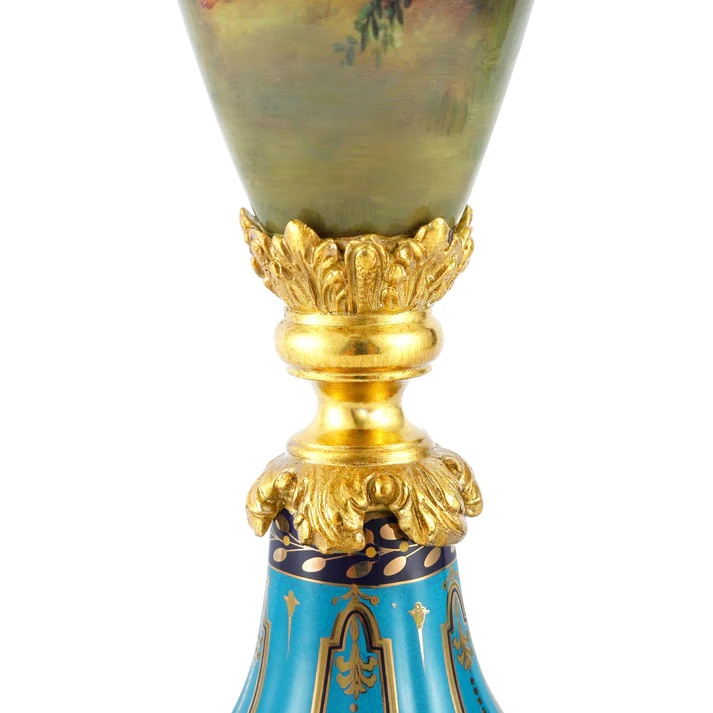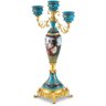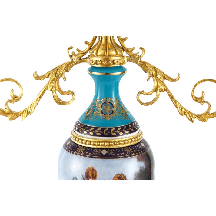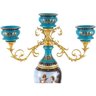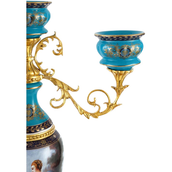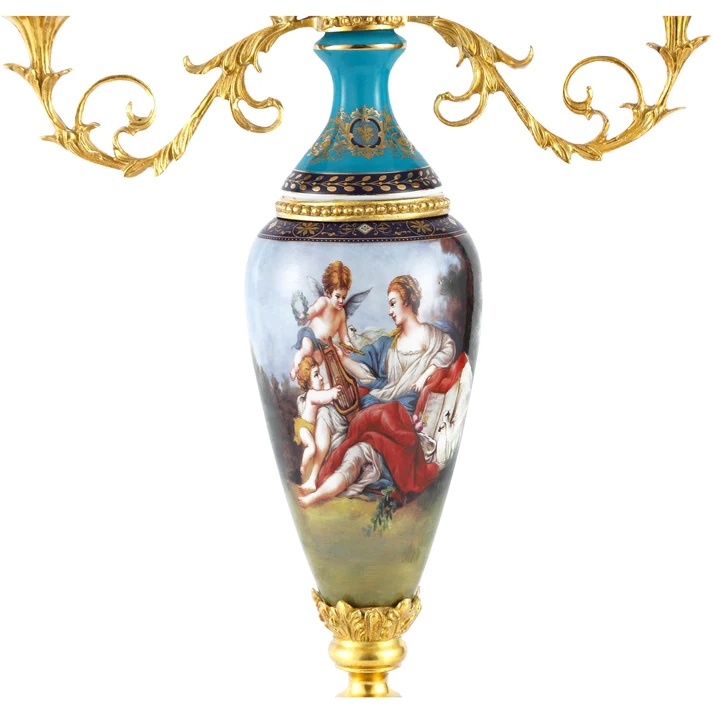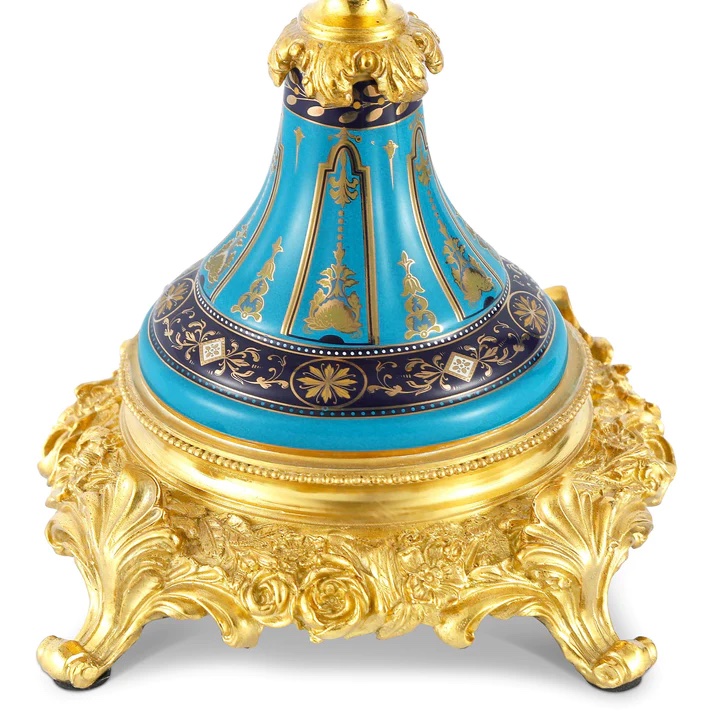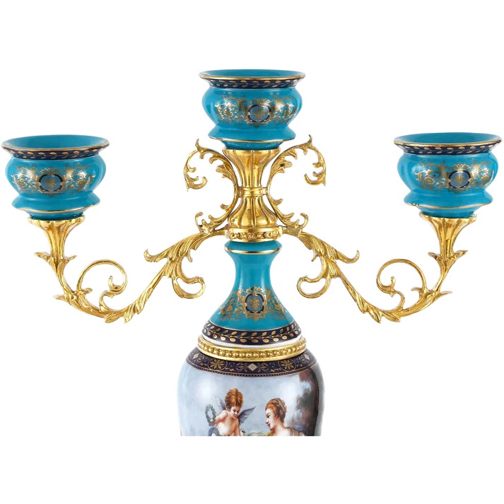 Elegant bronze and porcelain three cup candle holder in a vibrant teal. Every detail in this piece has been thoughtfully designed from the ornate bronze square base with scroll legs to the flared stem. The roses on the base tie in seamlessly with the bronze arms in the shape of vines. The stem features a classical Rococo scene depicting cherubs set against a natural backdrop.