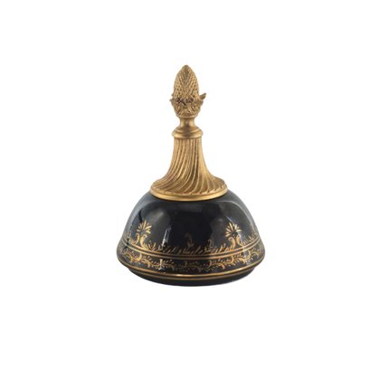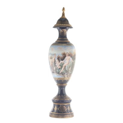 Gorgeous hand-painted porcelain jar in a vibrant teal shade. Every detail in this piece has been thoughtfully designed from the ornate circular base to the flared stem. The jar features a classical Rococo scene depicting people set against a natural backdrop.