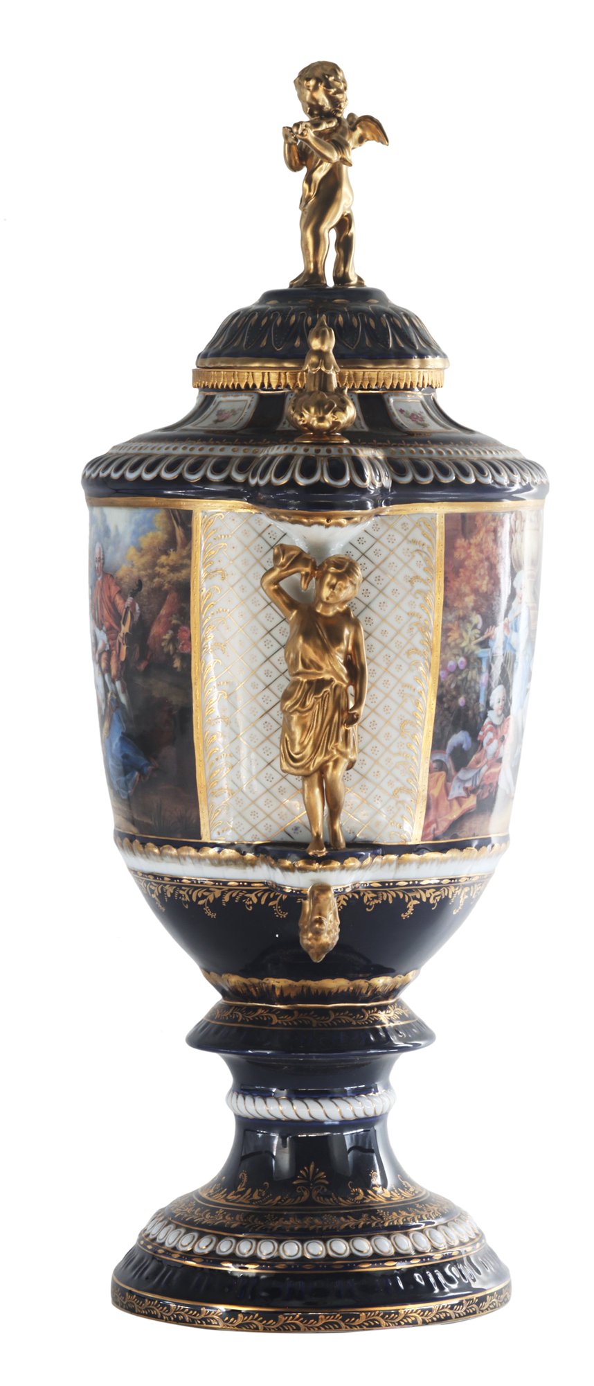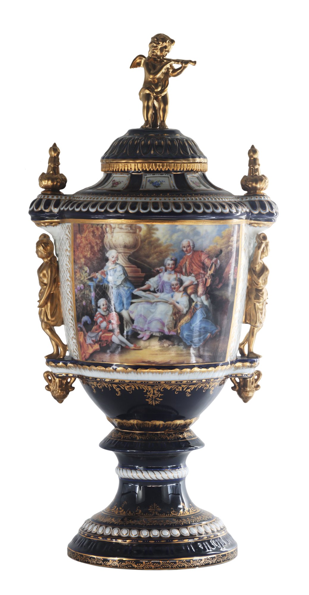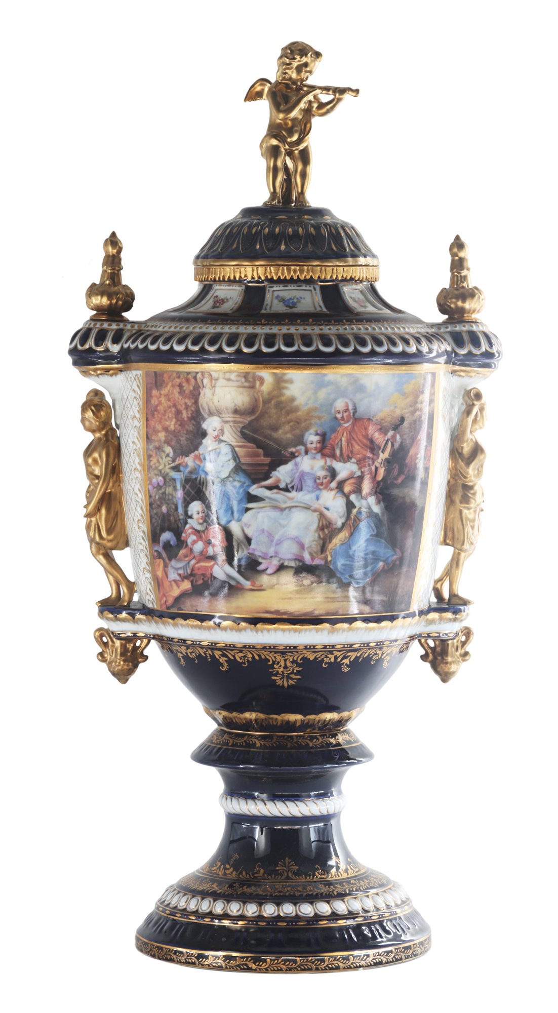 The vase's body sits on top of a flared stem, and a porcelain circular base. This piece is highlighted by the incredibly detailed lady handles. The dark blue color of the vase is striking and sophisticated, creating a vivid backdrop for the piece's hand painted motif. Each side depicts a different classical Rococo Venetian scene. The vase is executed in shades of green, brown, yellow and blue. It's completely painted by hand and composed of porcelain.