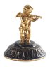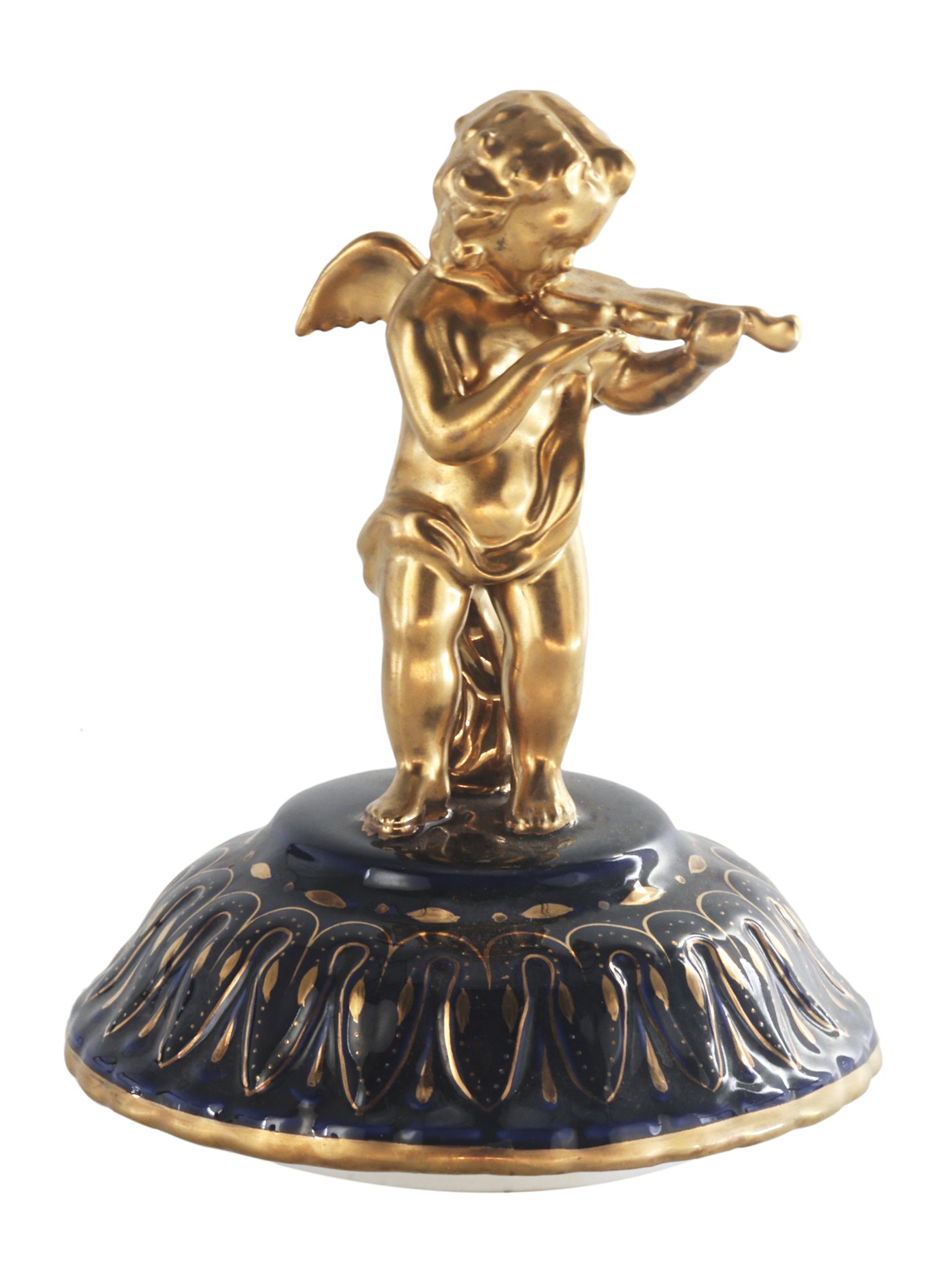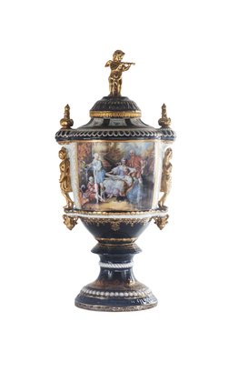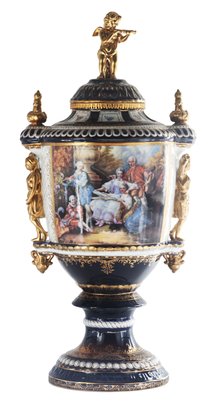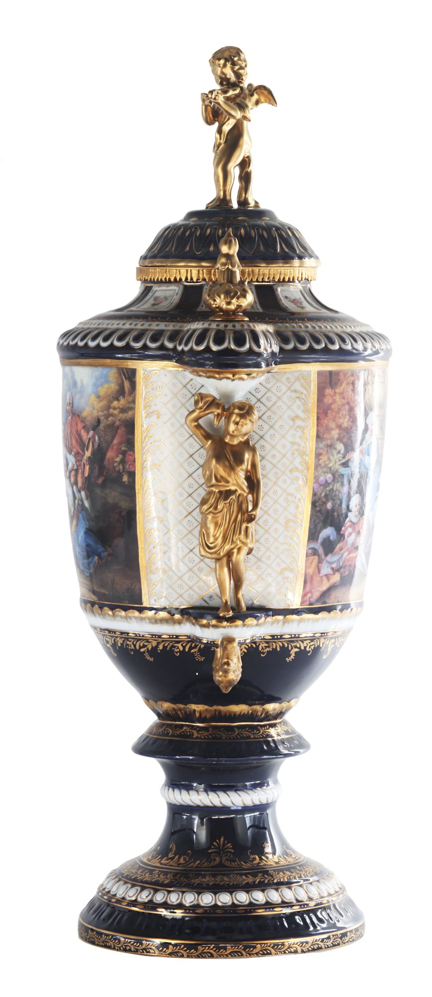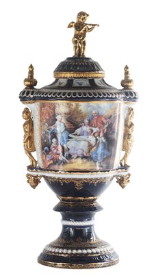 The vase's body sits on top of a flared stem, and a porcelain circular base. This piece is highlighted by the incredibly detailed lady handles. The dark blue color of the vase is striking and sophisticated, creating a vivid backdrop for the piece's hand painted motif. Each side depicts a different classical Rococo Venetian scene. The vase is executed in shades of green, brown, yellow and blue. It's completely painted by hand and composed of porcelain.