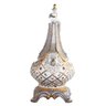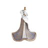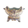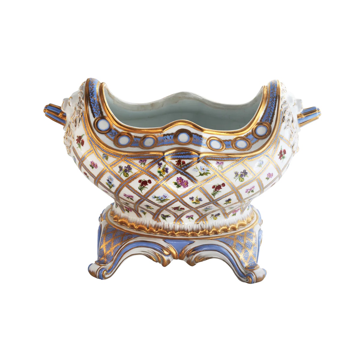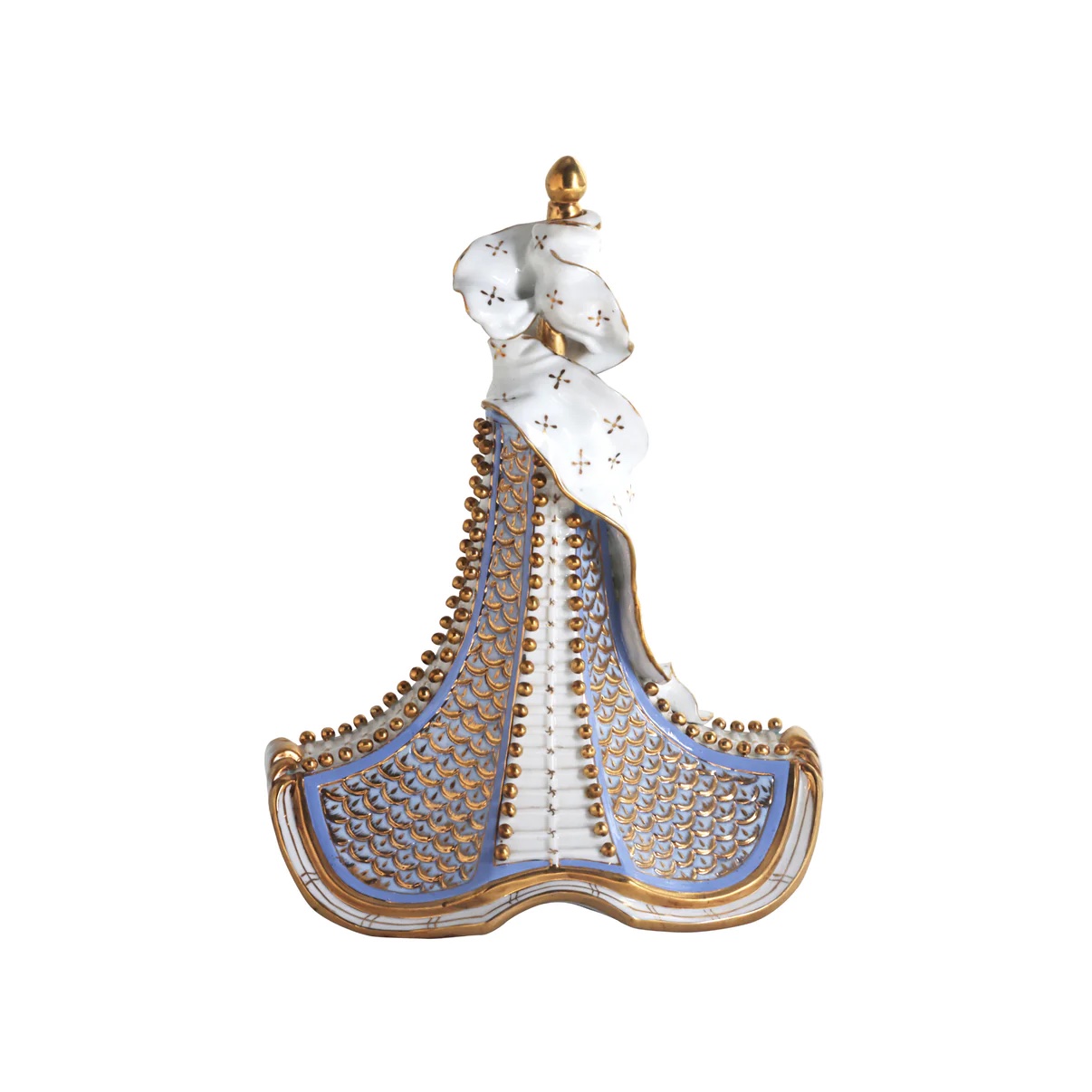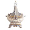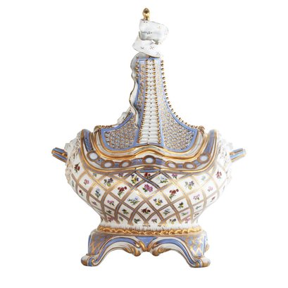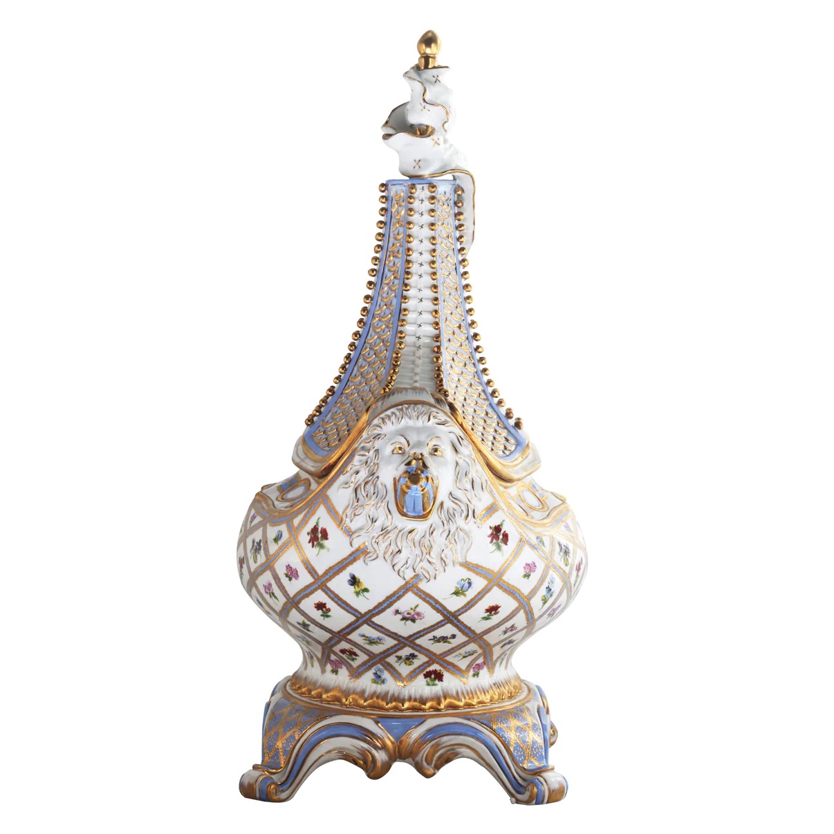 Up for auction is an ornate porcelain jar. The jar’s body sits on top of a porcelain base. This piece is highlighted by its incredibly intricate lid. The white color of the vase is striking and sophisticated, creating a vivid backdrop for the piece’s hand painted motif. Depicting a classical floral scene, this vase shows a still life, executed in shades of blue, purple, and green. It’s completely painted by hand and composed of porcelain. The vase has never been used and measures 18 inches in height, by 16 inches wide and 10 inches in depth.