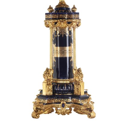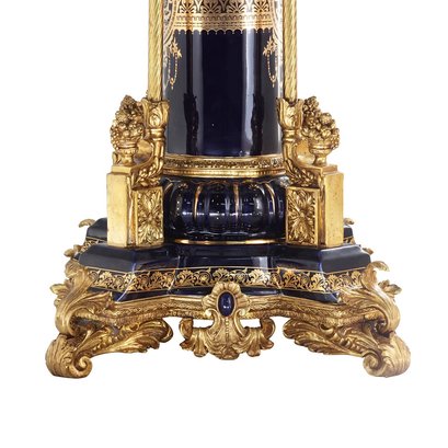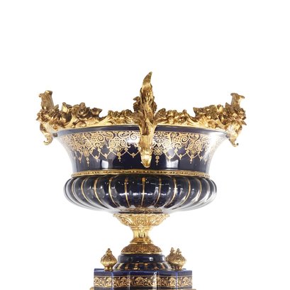 The bowl is gracefully supported by an elaborately crafted bronze and porcelain stem, showcasing the intricate artistry and attention to detail. The stem not only adds structural stability but also serves as a visual delight, with its delicate curves and ornate embellishments.