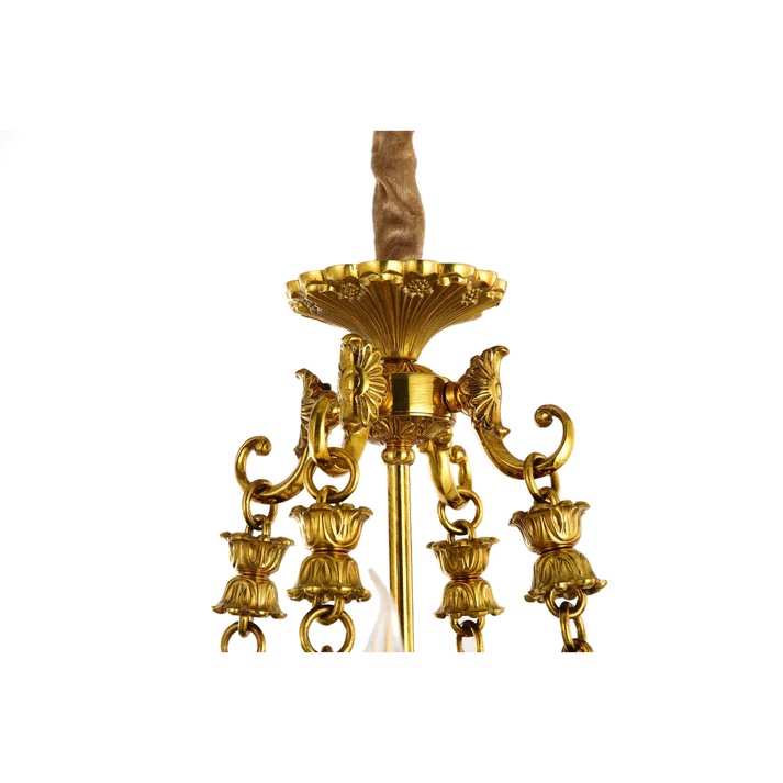 Discover the epitome of elegance with this gorgeous chandelier, distinguished by its captivating large crystal prisms and delicate chains gracefully draping from its arms. This chandelier's defining feature, these elements not only catch and refract light beautifully but also infuse a sense of luxury and opulence into any space.