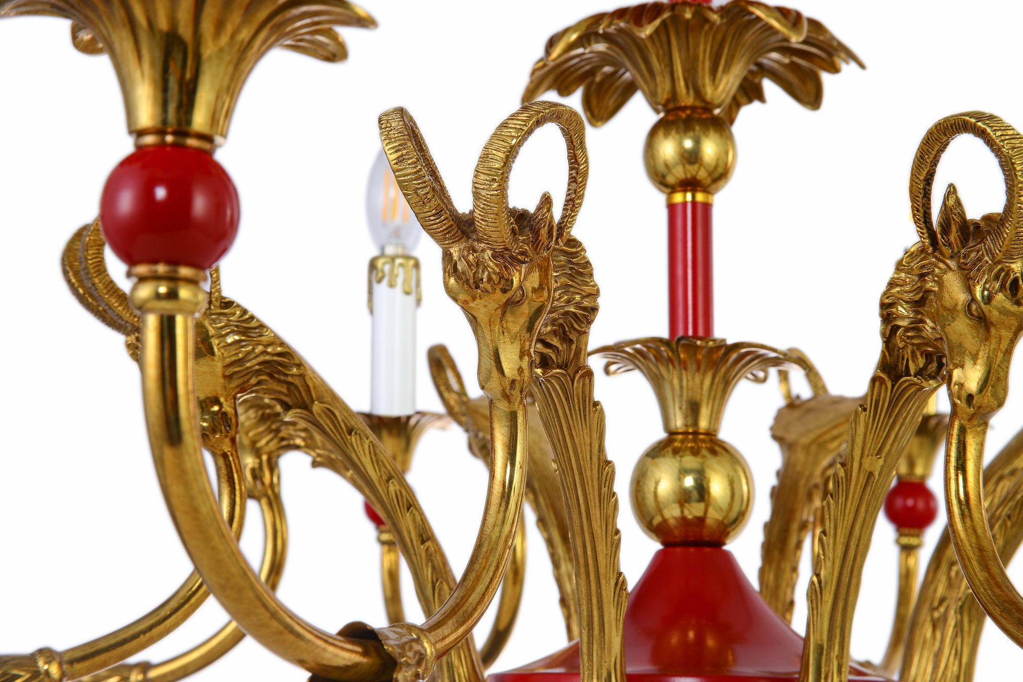The chandelier is a visual marvel with its two tiers—six electrified arms in the first tier and eight in the second. Emerging from each arm is an incredibly detailed brass rams head, a testament to meticulous craftsmanship that adds a touch of regality to the piece.