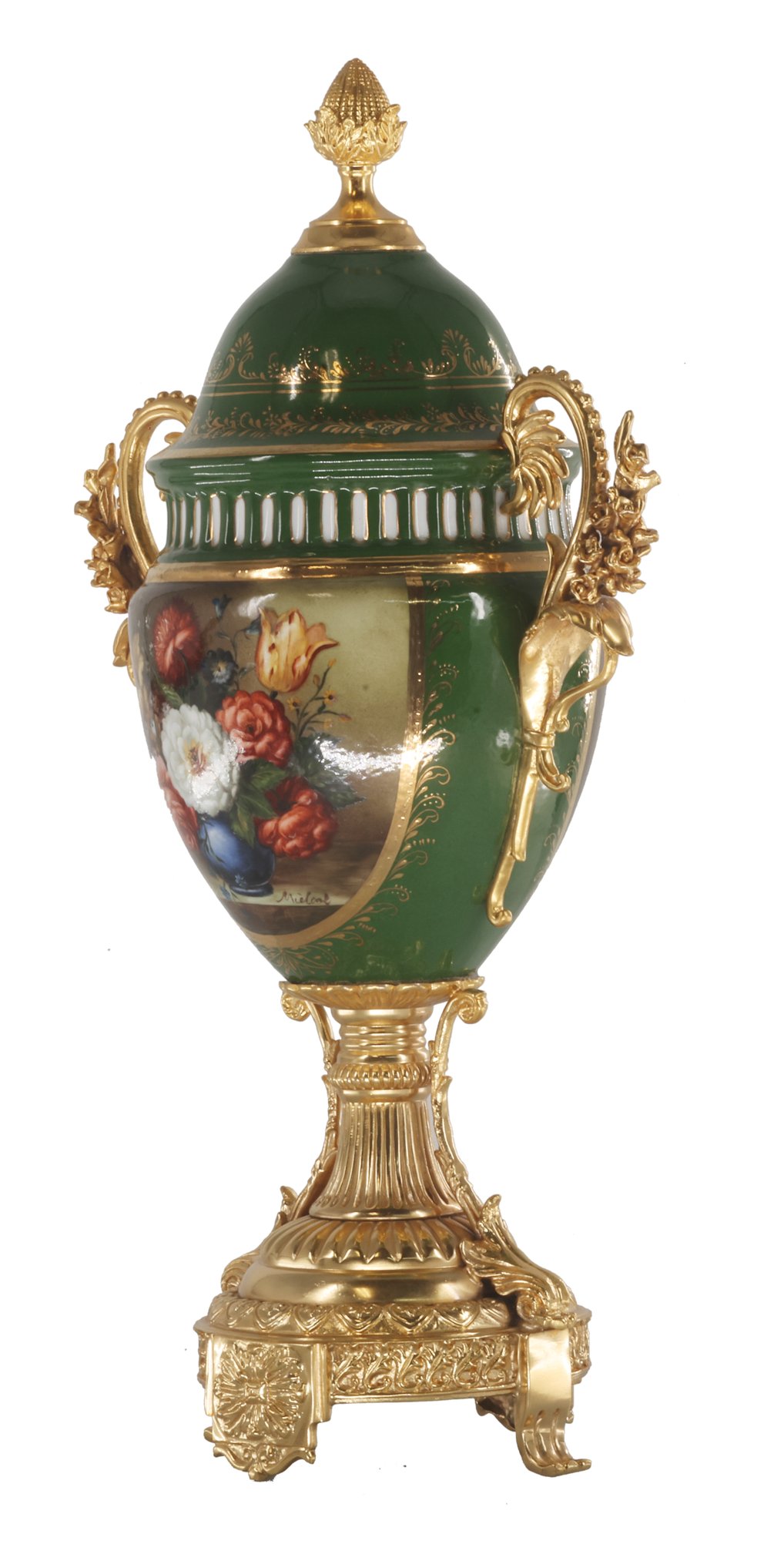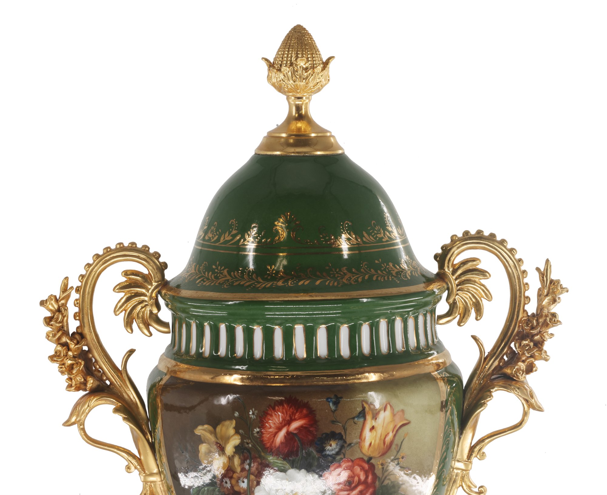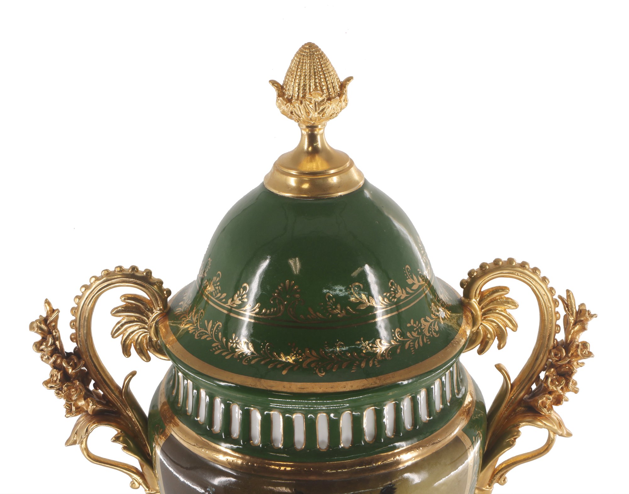 Indulge in the timeless elegance of this exceptional porcelain covered jar, a true masterpiece that will elevate any space. Resting on an ornate bronze flared stem and a circular base, this jar exudes sophistication and artistry.