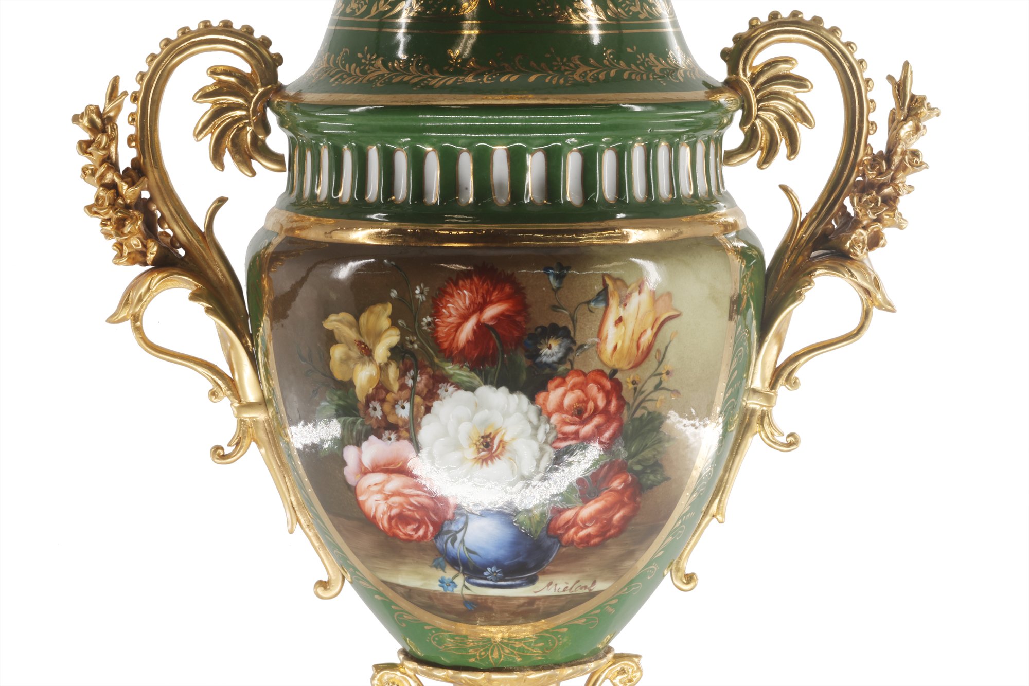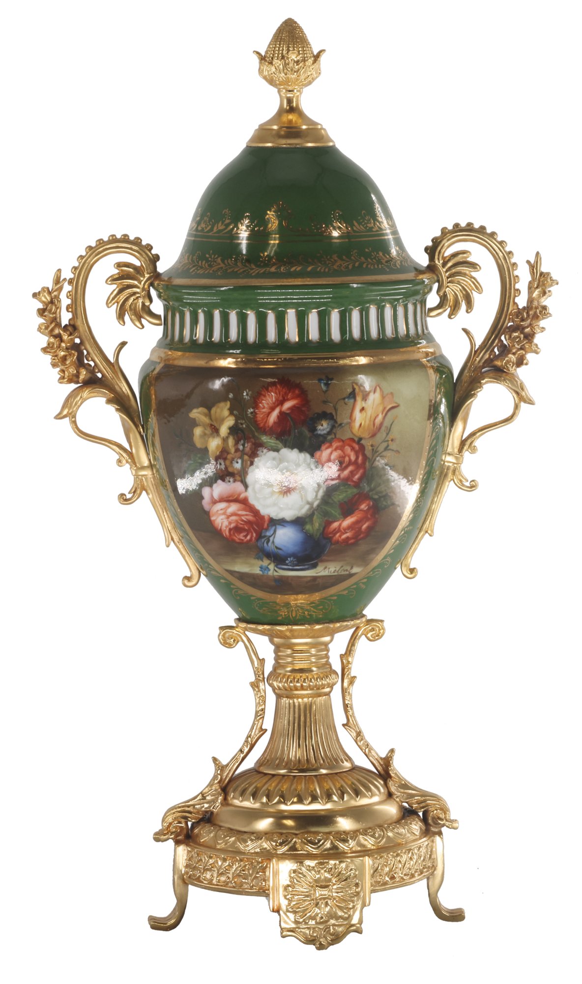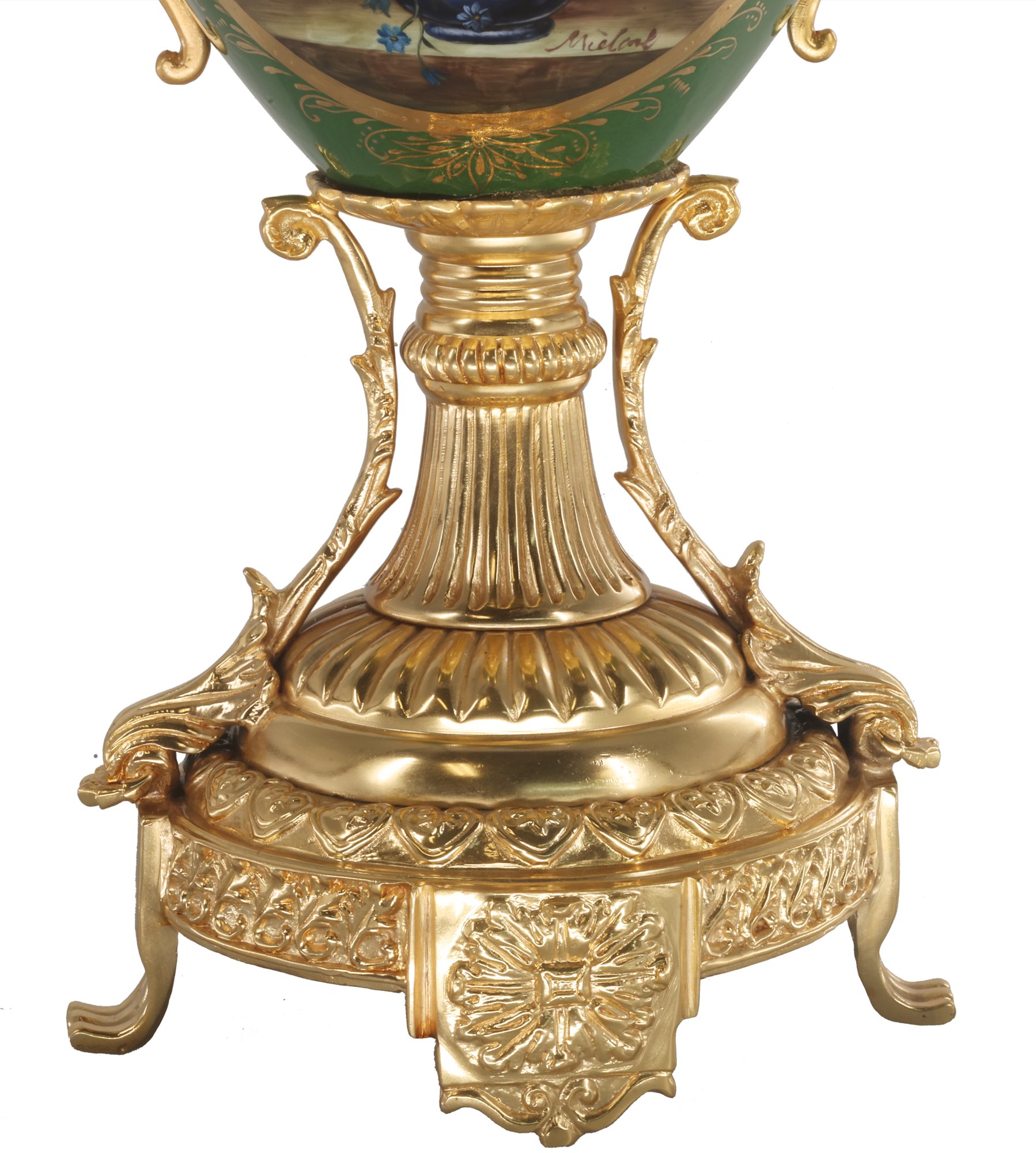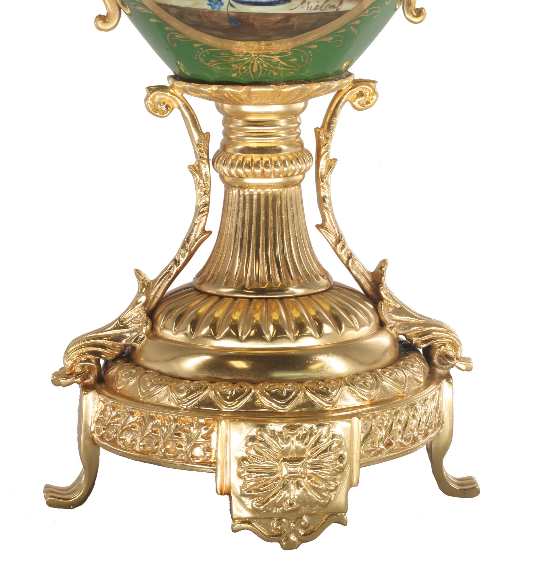 Indulge in the timeless elegance of this exceptional porcelain covered jar, a true masterpiece that will elevate any space. Resting on an ornate bronze flared stem and a circular base, this jar exudes sophistication and artistry.