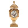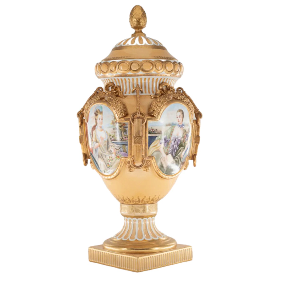 The vase's resplendent gold color commands attention, evoking a sense of sophistication that is both striking and inherently classic. This opulent hue provides a sumptuous backdrop for the hand-painted motif that graces the surface, a visual narrative that encapsulates the essence of classical Rococo artistry.