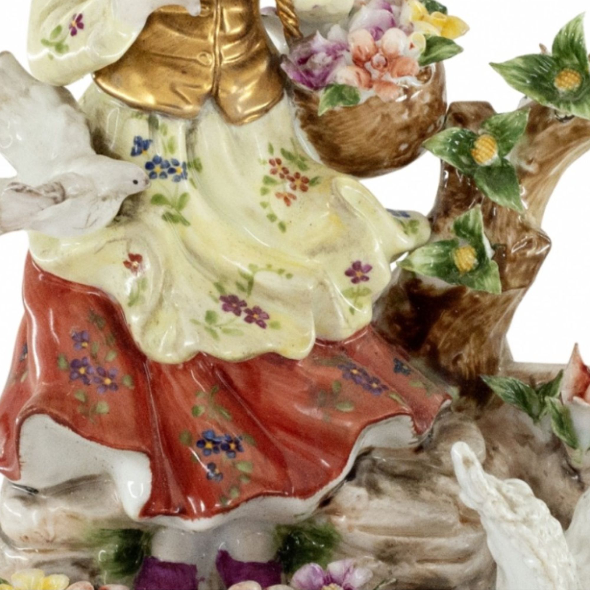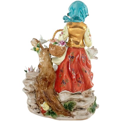 Up for auction is a hand painted porcelain figure depicting a girl with a dove. Created in a classic Rococo style, this figurine is brand new and stands 10 inches in height by 8 inches in width.