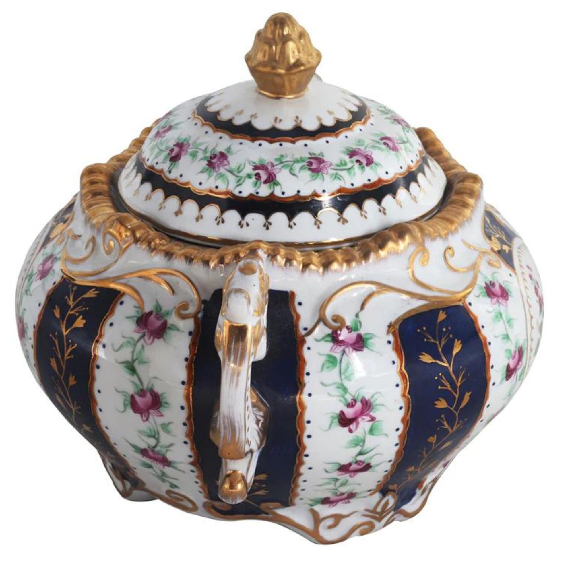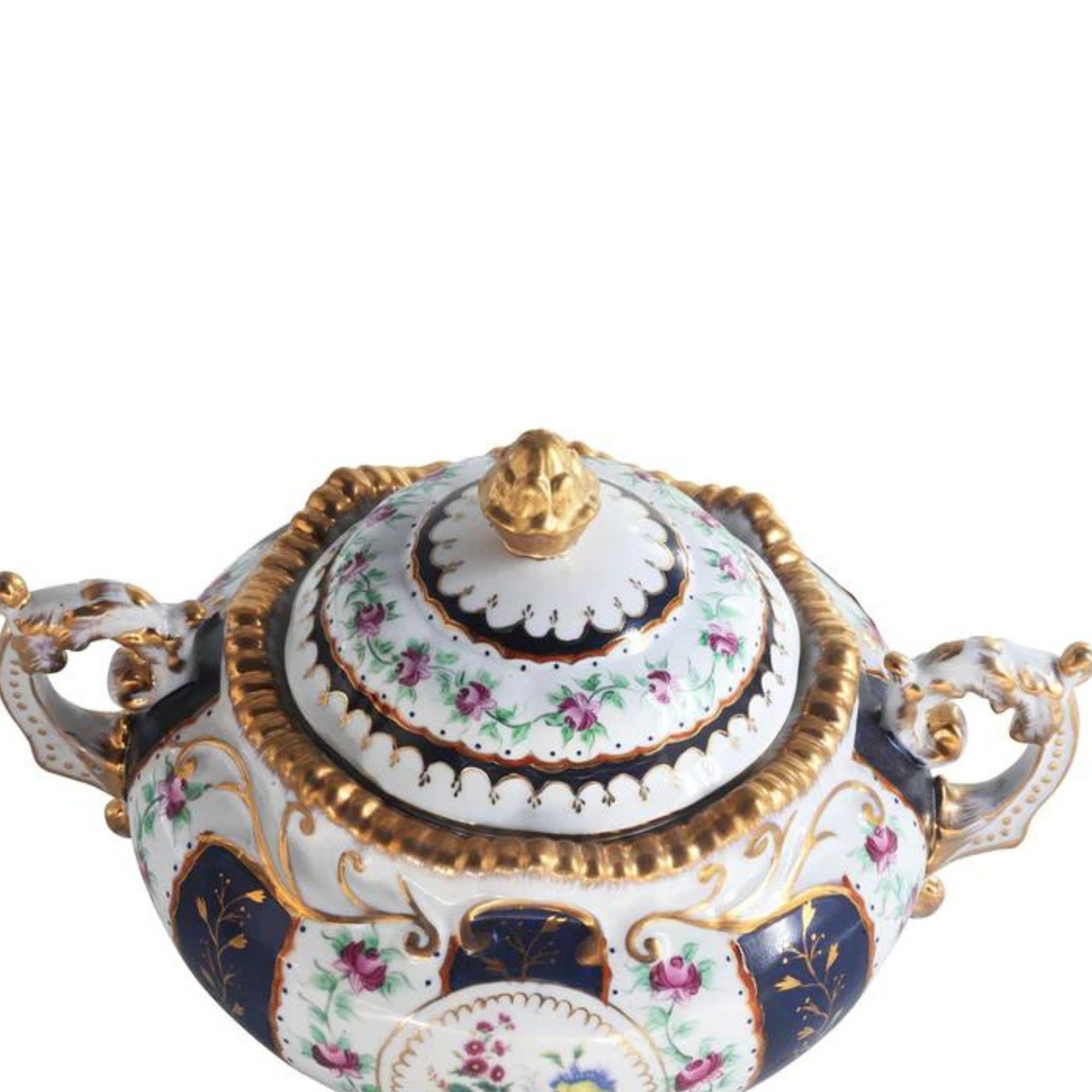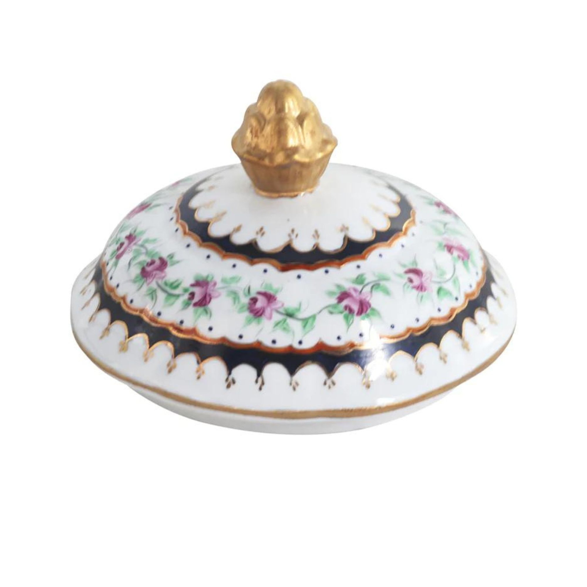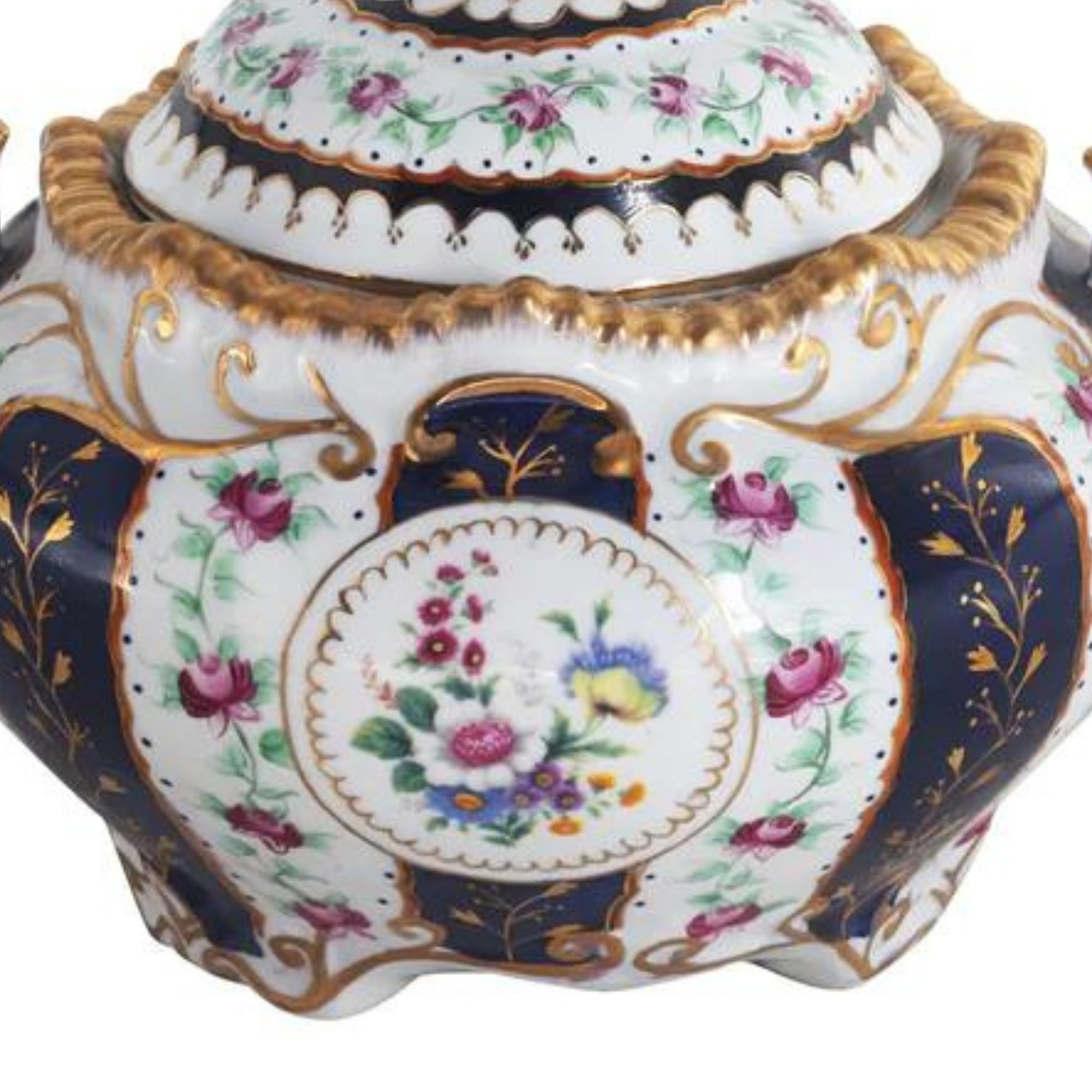 The classic dark blue color of this jar exudes an air of elegance and sophistication, setting the stage for the intricate hand-painted floral motif that graces their smooth porcelain surfaces. This motif is a symphony of delicate blooms and intricate foliage, where each brushstroke is a testament to the artisan's skill and unwavering dedication.