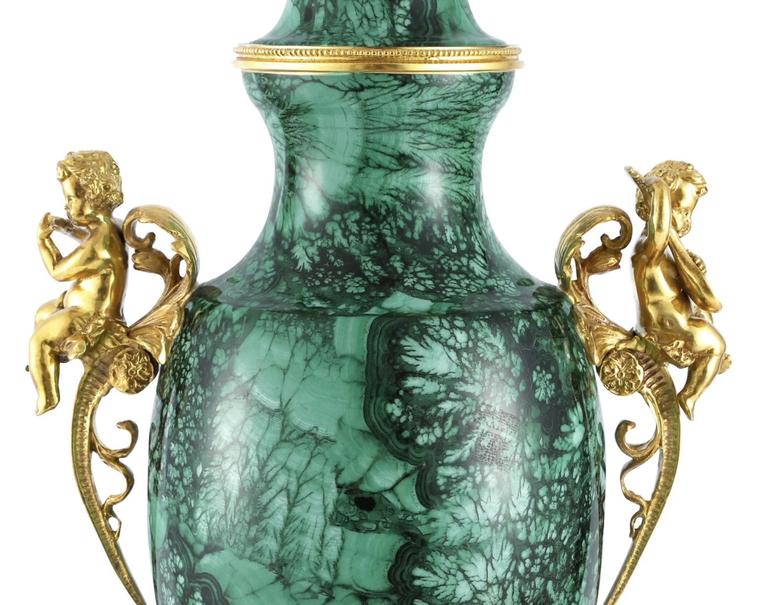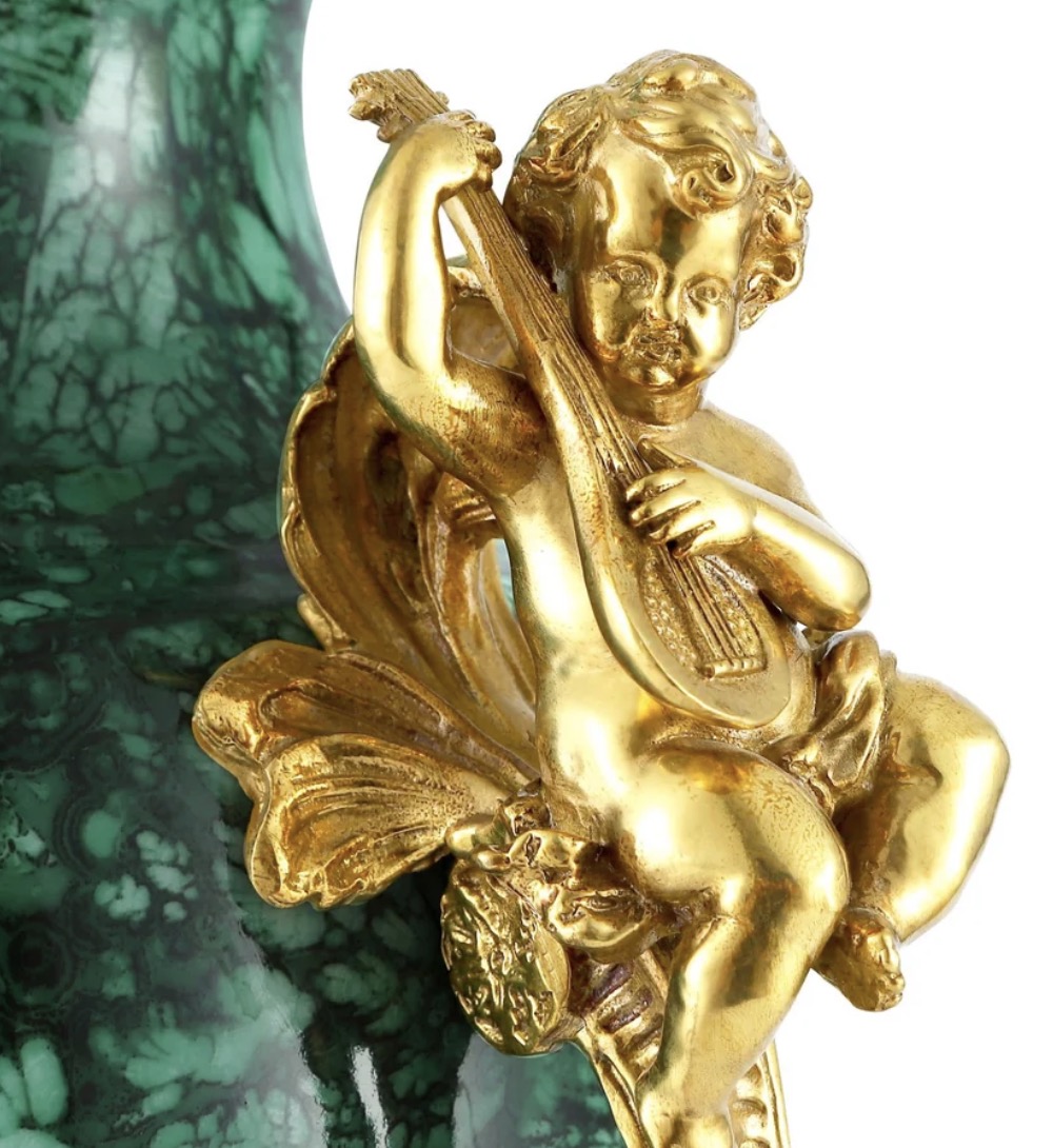 The handles of this piece are adorned with cherubs, each gracefully holding musical instruments, adding a delightful and elegant dimension to the composition. These cherubs harmoniously complement the overall design, evoking a sense of grace and beauty.