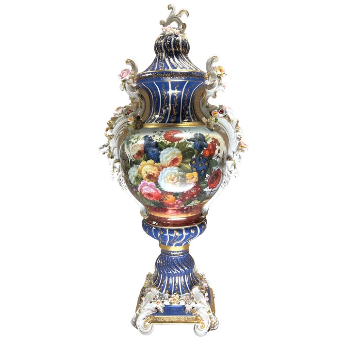 Steep yourself in the magnificence of bygone eras as you behold this Rococo-inspired porcelain urn, an epitome of artistic finesse and detailed craftsmanship. Rising gracefully from a porcelain square base through a flared stem, the urn exudes an aura of sophistication and grandeur.