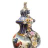 What instantly captures the eye are the intricately designed three-dimensional porcelain flowers that adorn this masterpiece, creating a tangible bridge between the viewer and the rich Rococo artistry. The deep shades of purple juxtaposed with soft whites serve as a canvas for classical Rococo scenes that unfold on the vase, narrating tales of romance, drama, and elegance.