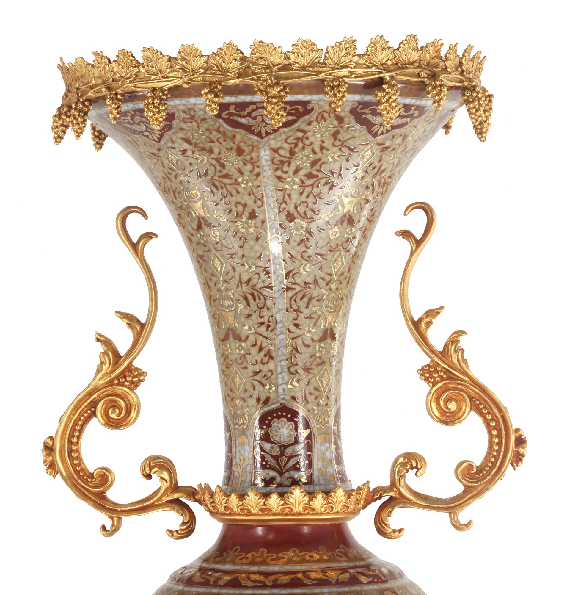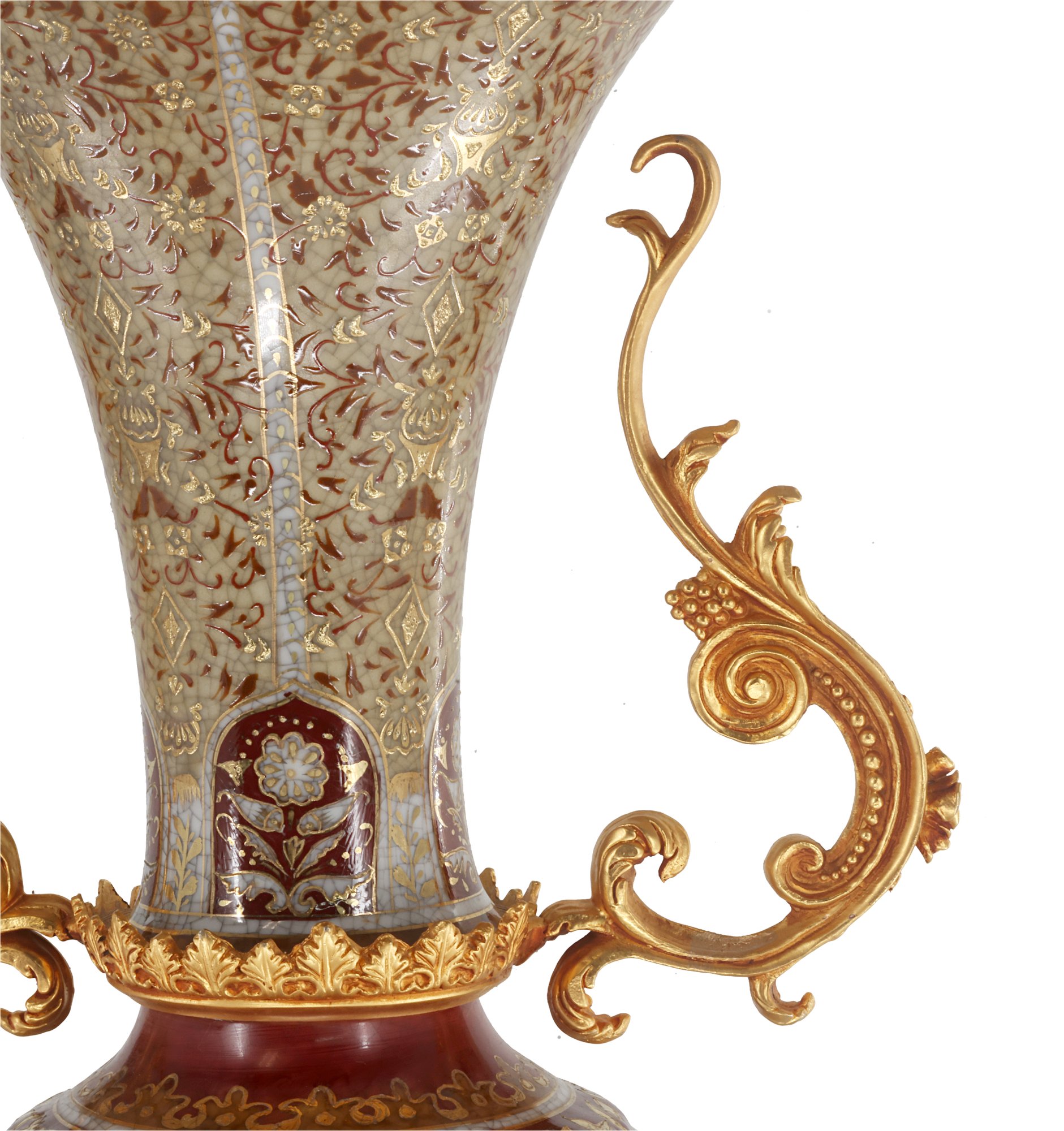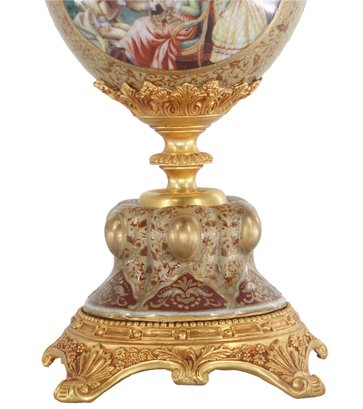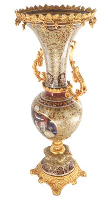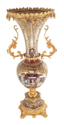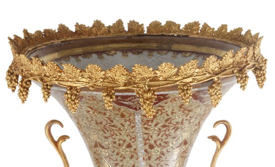 Crafted with care, the vase boasts a harmonious palette of gentle gold and brown tones that elegantly frame its intricate Rococo-style floral motif. The delicate detailing exudes a sense of refinement, while the addition of lustrous bronze handles enhances its visual allure, creating a perfect balance between opulence and understated beauty.