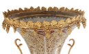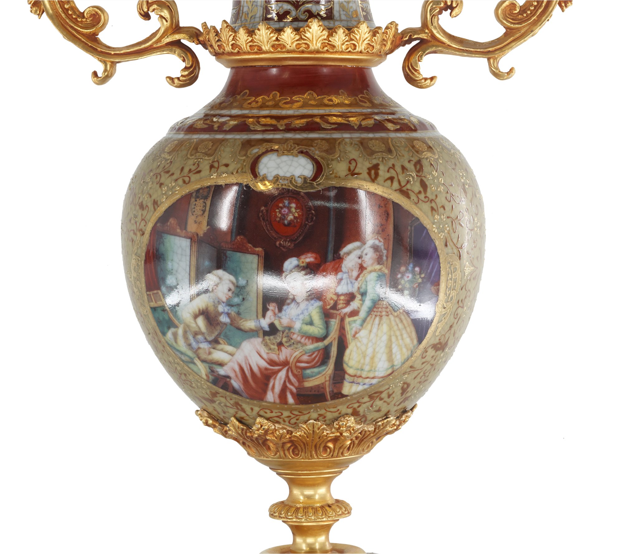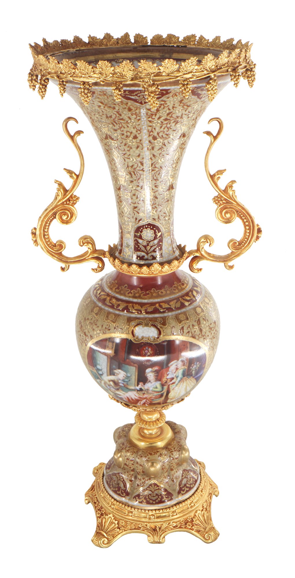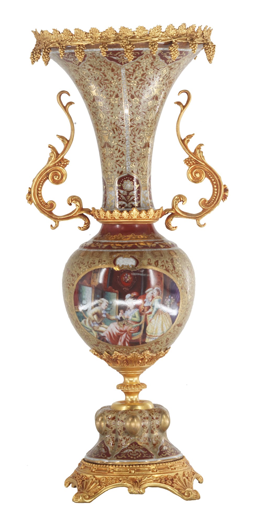 Crafted with care, the vase boasts a harmonious palette of gentle gold and brown tones that elegantly frame its intricate Rococo-style floral motif. The delicate detailing exudes a sense of refinement, while the addition of lustrous bronze handles enhances its visual allure, creating a perfect balance between opulence and understated beauty.