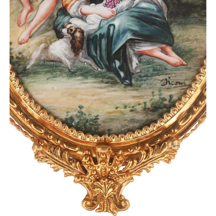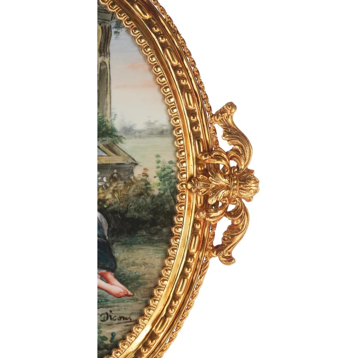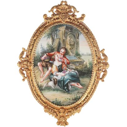 Embrace the timeless allure of the Rococo era with this stunning painting on porcelain. This beautiful artwork captures the essence of Rococo style, featuring a captivating scene of a couple immersed in nature's beauty, with subtle hints of ancient ruins in the background. The delicate brushstrokes and intricate details transport you to a world of refined elegance and artistic finesse.