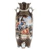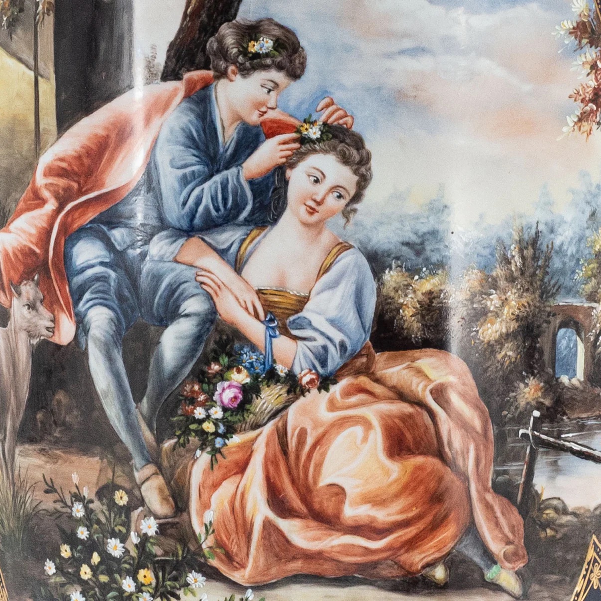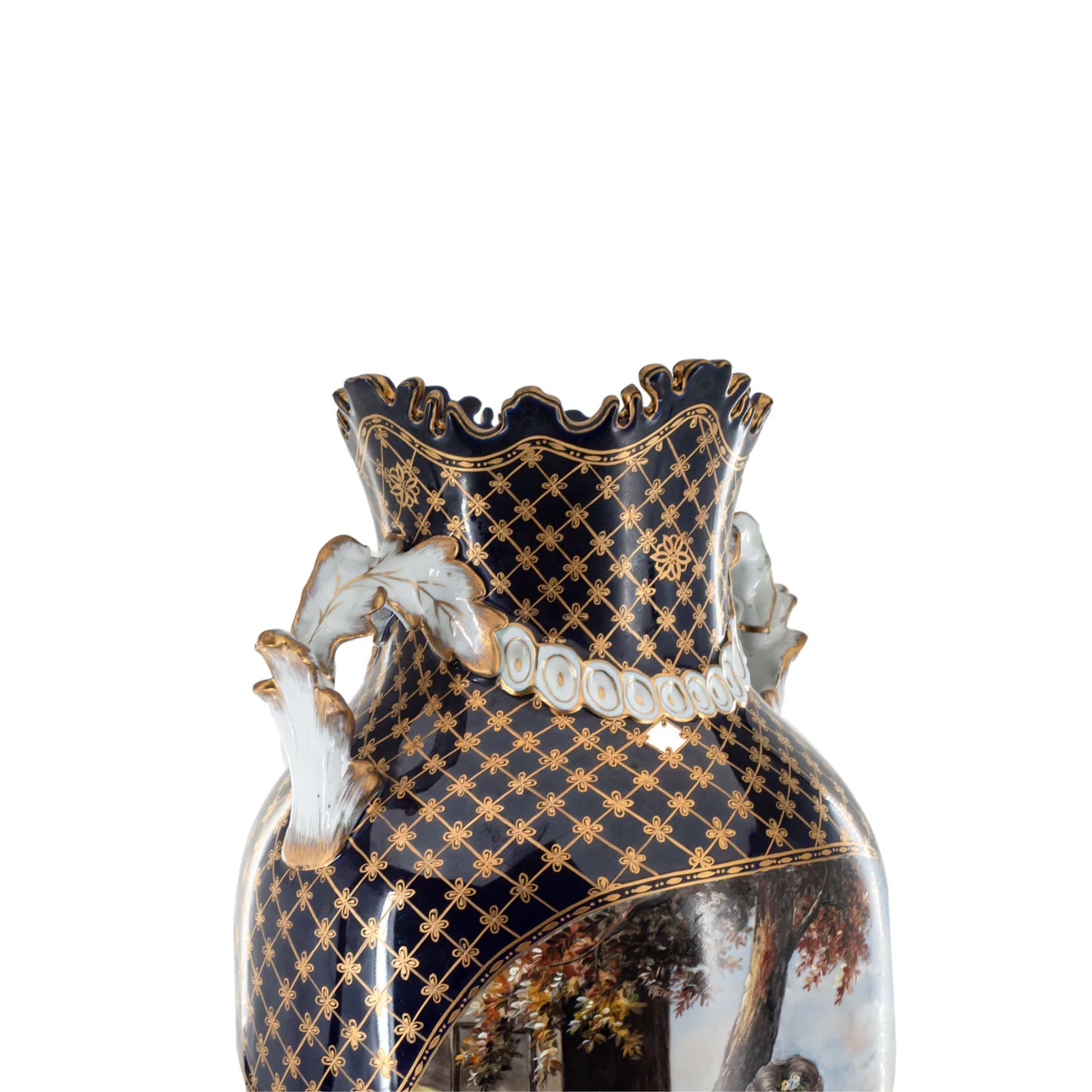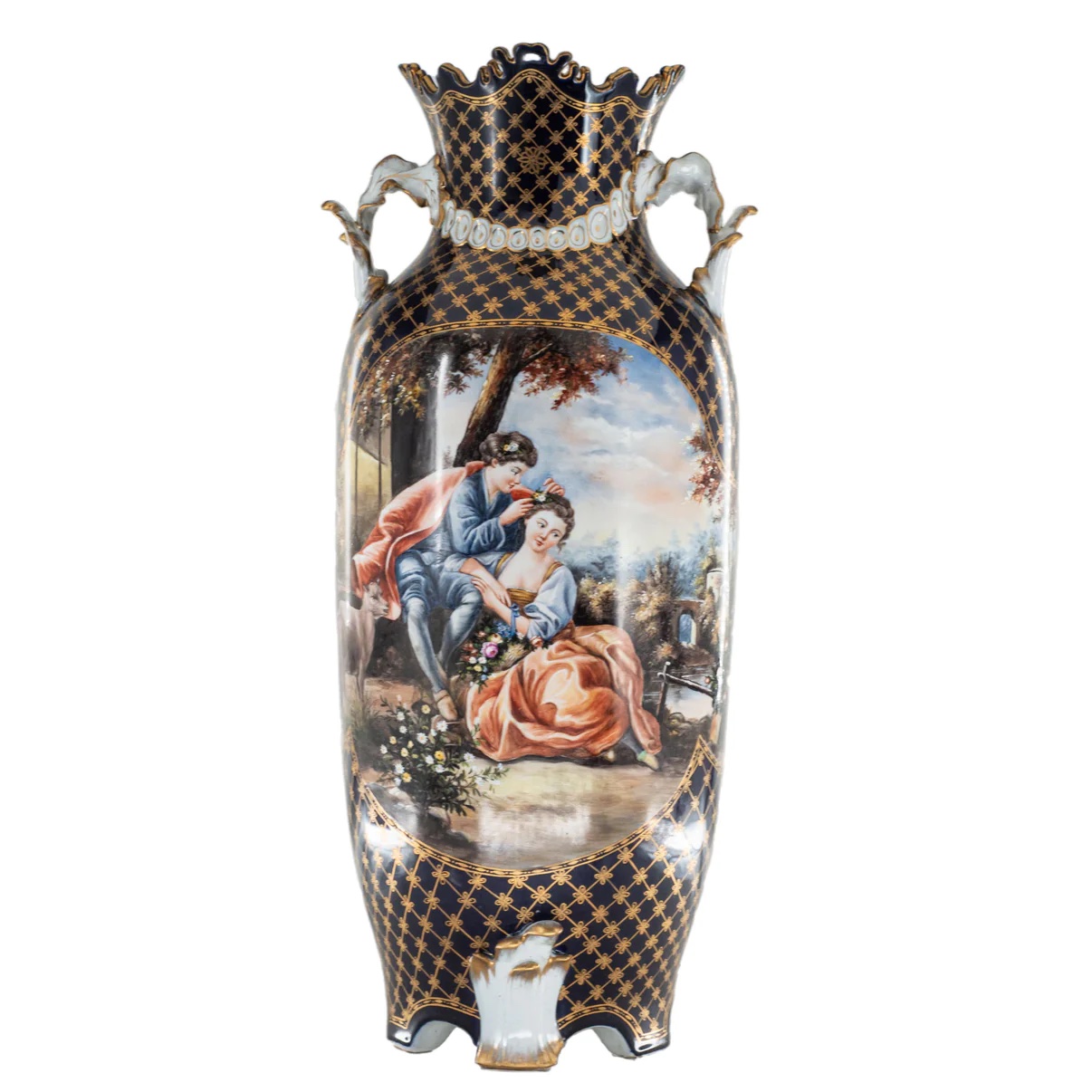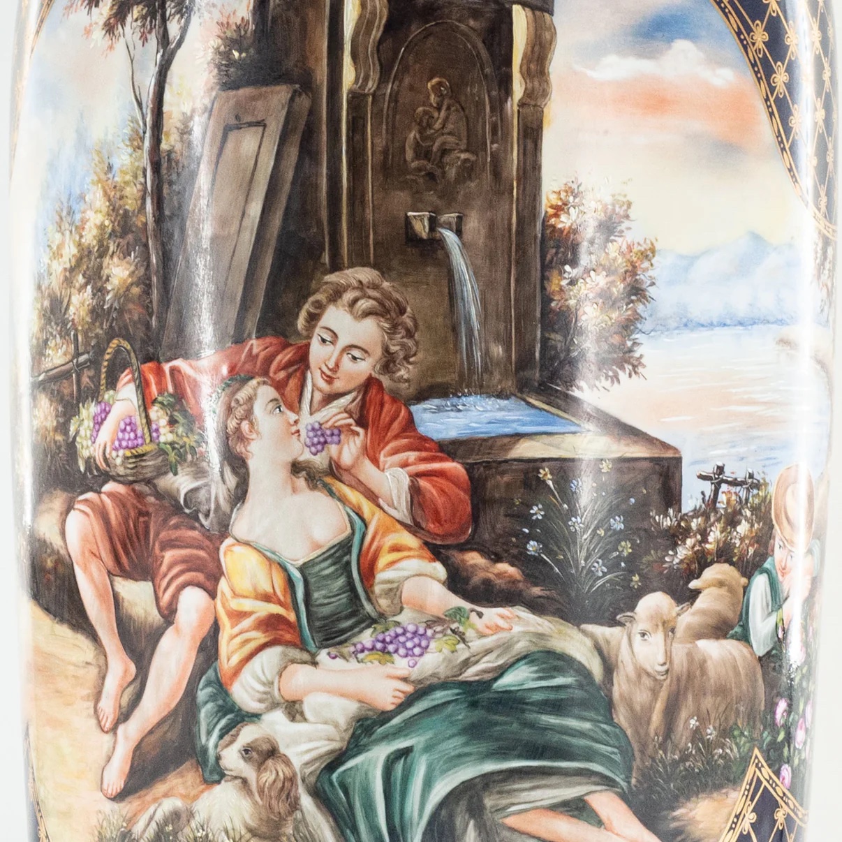 This piece is highlighted by the incredibly detailed natural bronze elements. The dark blue and gold accent color of the vase is striking and sophisticated, creating a vivid backdrop for the piece’s hand painted Rococo motif. Depicting a society scene in nature, this vase is executed in shades of blue, green, and red. It’s completely painted by hand and composed of porcelain.