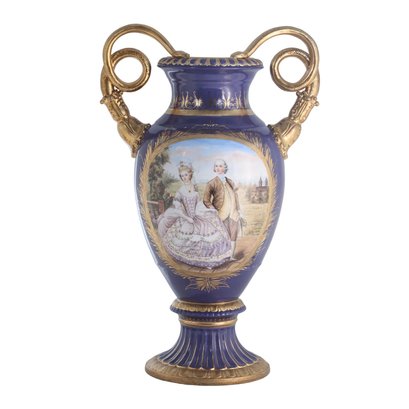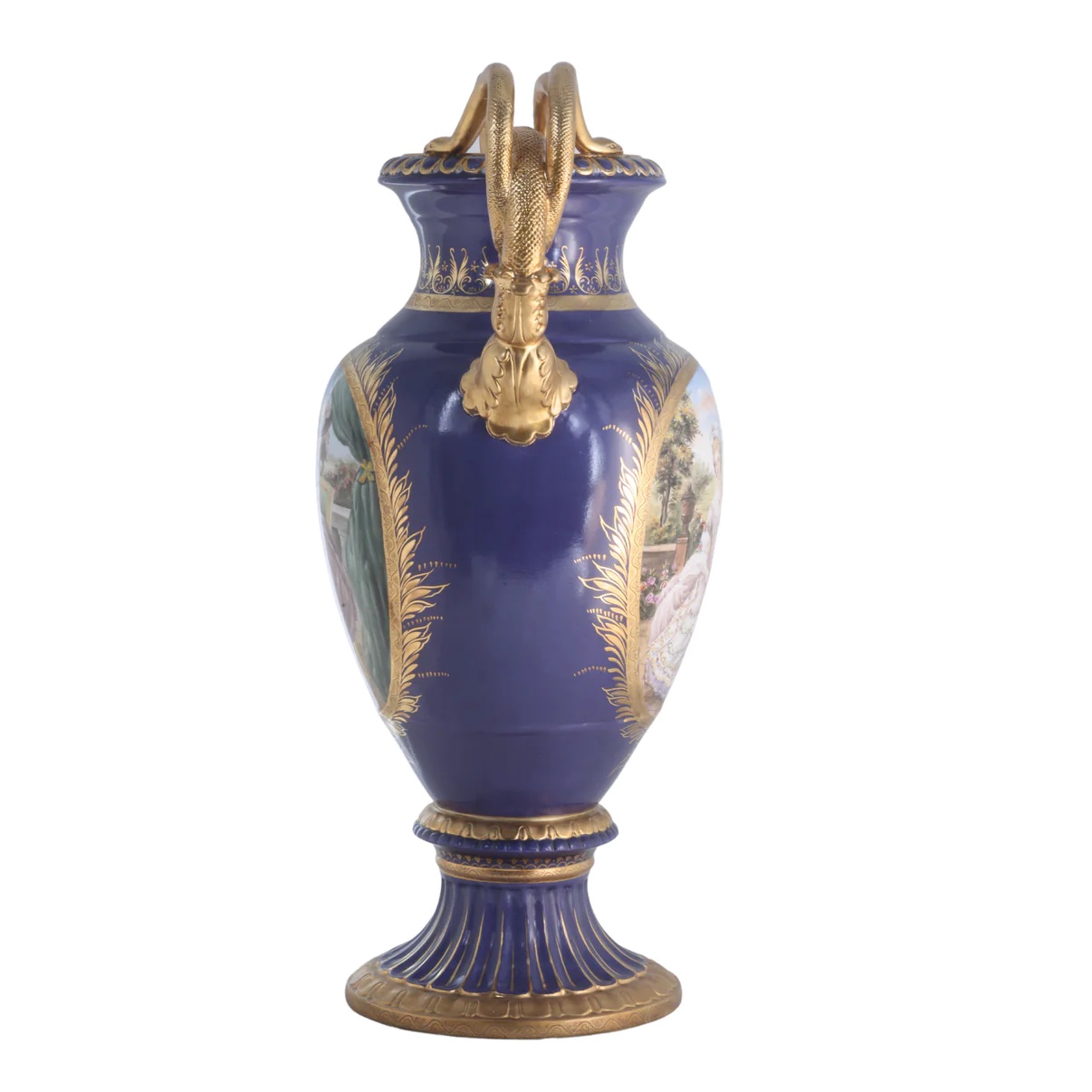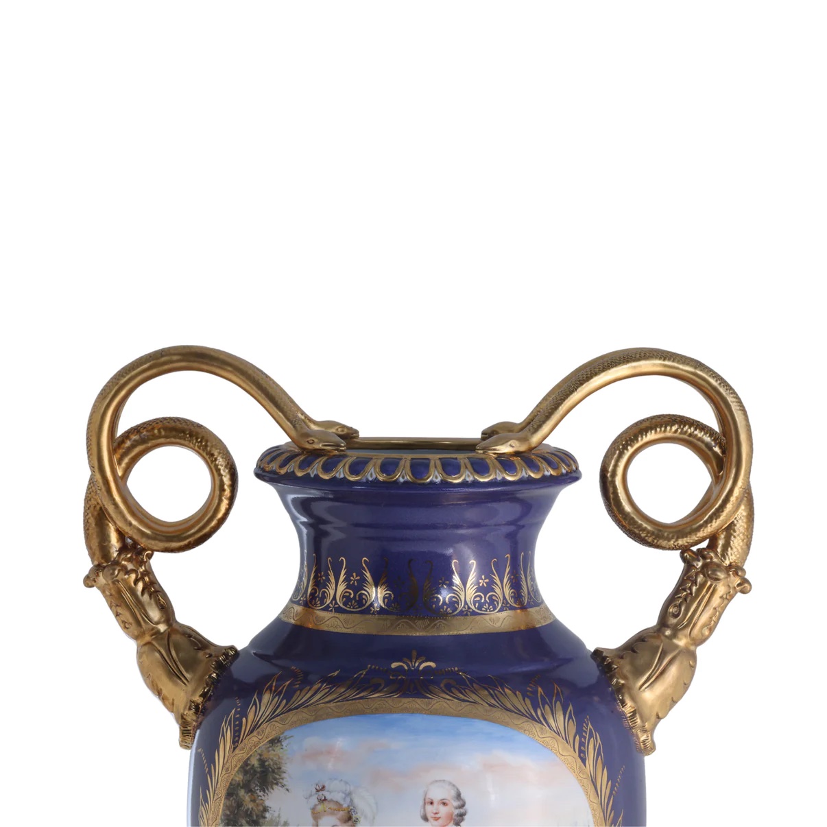 In its entirety, this vase is not just an object; it's a celebration of creativity and human expression. With its ornate base, intricate snake handles, and captivating Rococo motif, it narrates tales of artistry and culture. As it takes its place in a room, it brings with it a whisper of history, a touch of the extraordinary, and a reminder of the timeless power of art to inspire and enchant.
