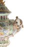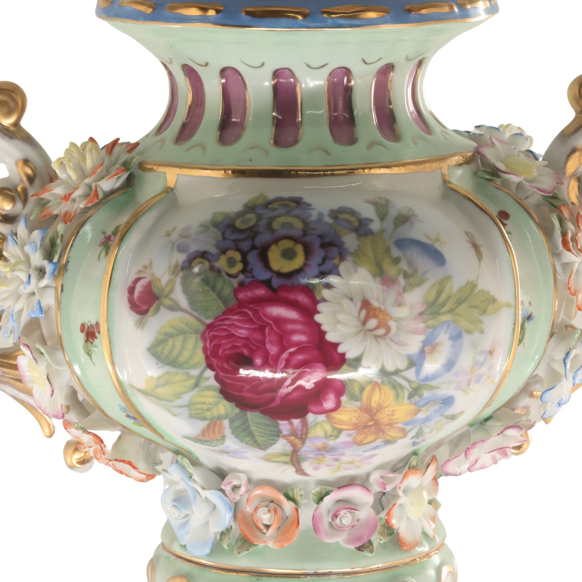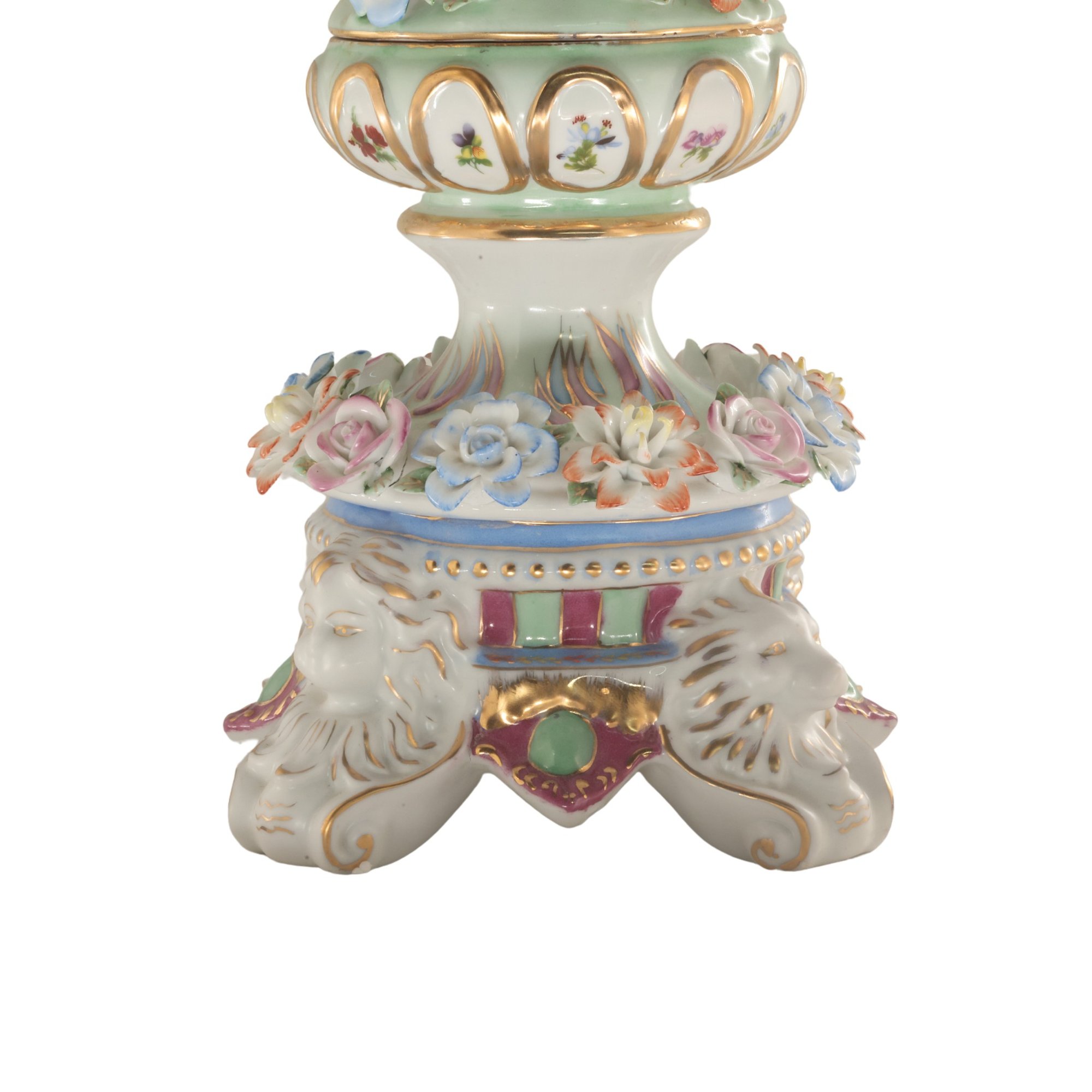 The vase's body sits on top of a flared stem, and a porcelain square base. The incredibly detailed three-dimensional porcelain flowers highlight this piece. The white color of the vase is gorgeous. The piece's hand-painted motif, Each side depicts classical Rococo scenes. The vase is executed in shades of blue, red, and yellow. It's entirely painted by hand and composed of porcelain. Adorned by three dimensional porcelain flowers throughout the piece. Such vivid detail from the lid all the way down to the base.