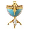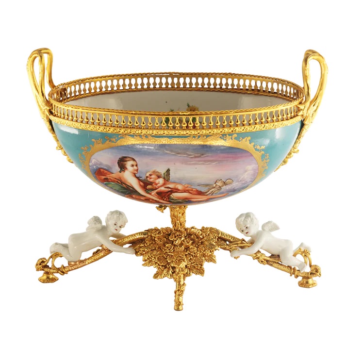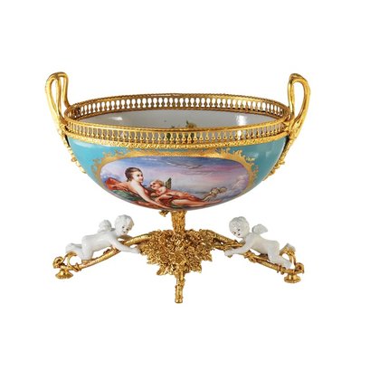 This romantic porcelain bowl is accented with Bronze details. It stands atop a flared stem with a bronze circular base adorned with porcelain cherubs on either side. It features a Rococo-style scene on each side depicting people in a natural setting.