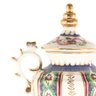 Resting atop a flared stem and an ornate square base, the jar exudes a sense of regal charm and sophistication. Every detail of the piece, from the base to the lid, has been carefully considered to create a harmonious composition.