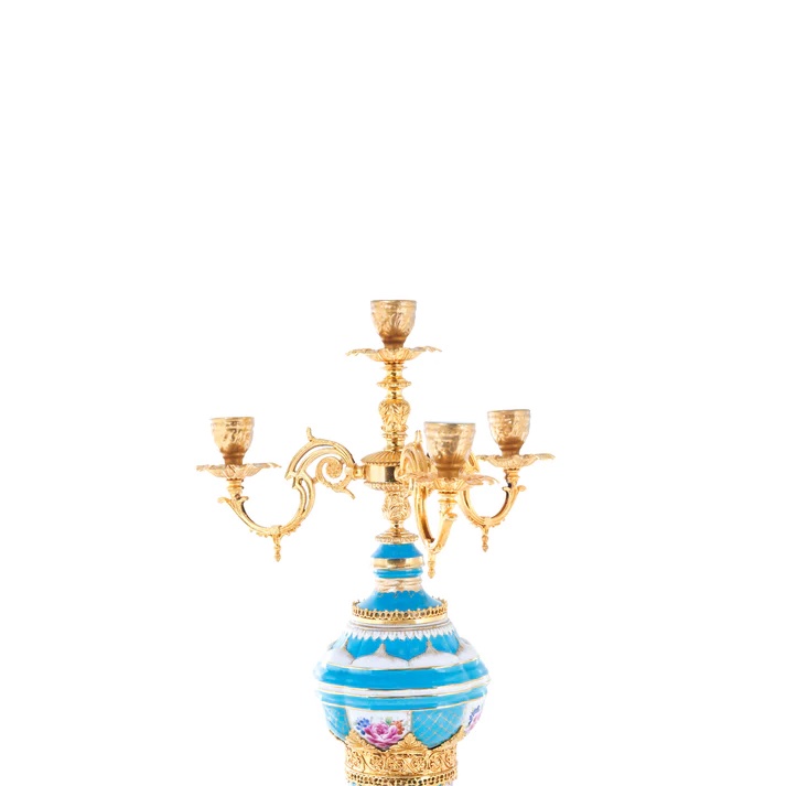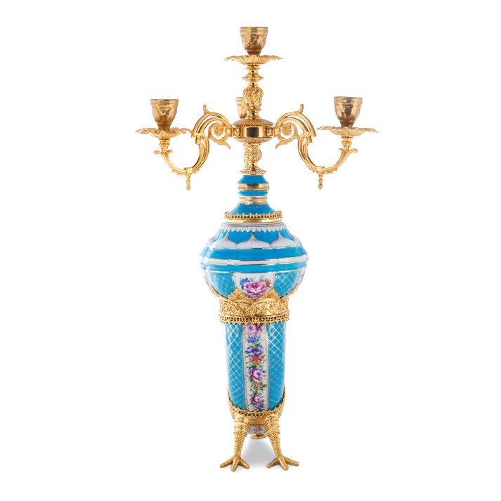 Introducing the exquisite Bronze & Porcelain Cornucopia Candelabra, a stunning fusion of craftsmanship and elegance. This candelabra features four cups and can serve as the perfect centerpiece or a decorative accent to enhance any room's ambiance. The striking contrast between the rich porcelain and vibrant bronze details adds depth and character to this piece. A delicate floral motif graces every inch of the candelabra, from the cups to the stem, infusing it with timeless beauty. The intricately finished bronze base, adorned with porcelain details, further elevates the candelabra's allure. Embrace the opulence and versatility of this magnificent piece.