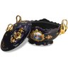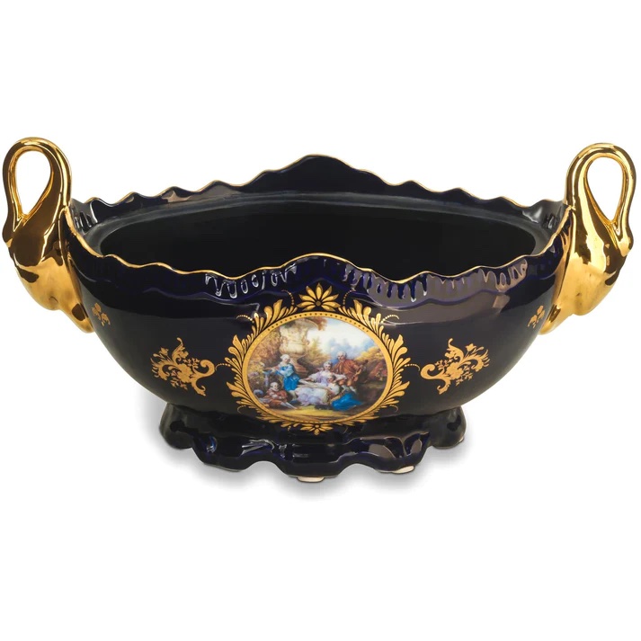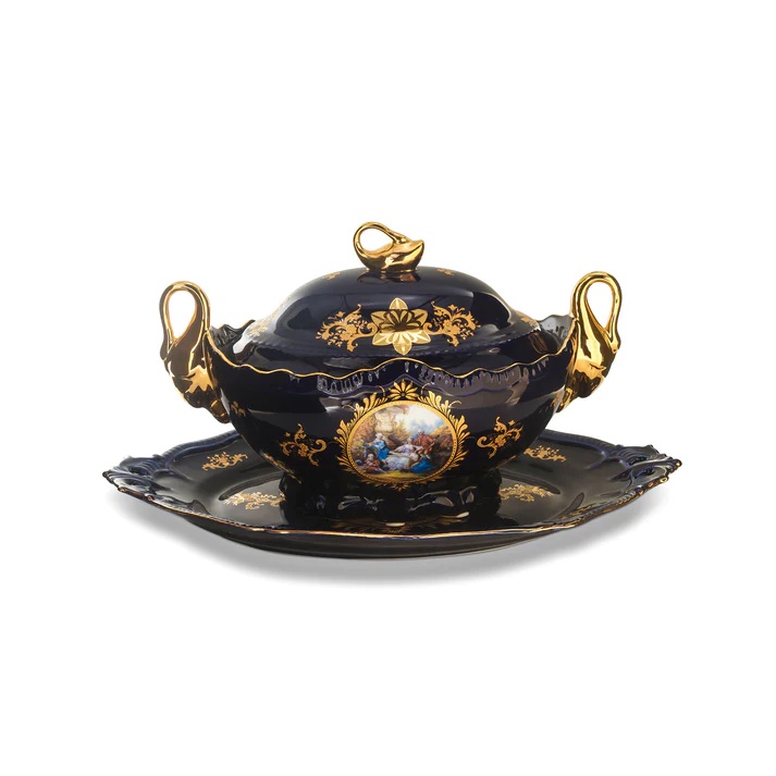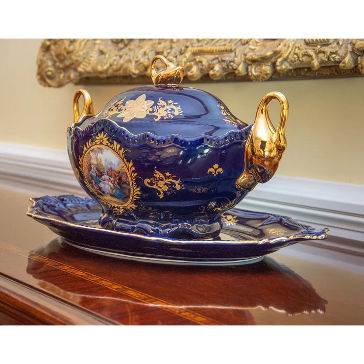 The striking royal blue color palette is nothing short of mesmerizing, creating a vivid and sophisticated backdrop for the pièce de résistance: intricate gold details that adorn every facet of the set. Within this porcelain canvas unfolds a Rococo-style scene, a tableau of timeless elegance punctuated by pops of gold that shimmer like a treasure trove.