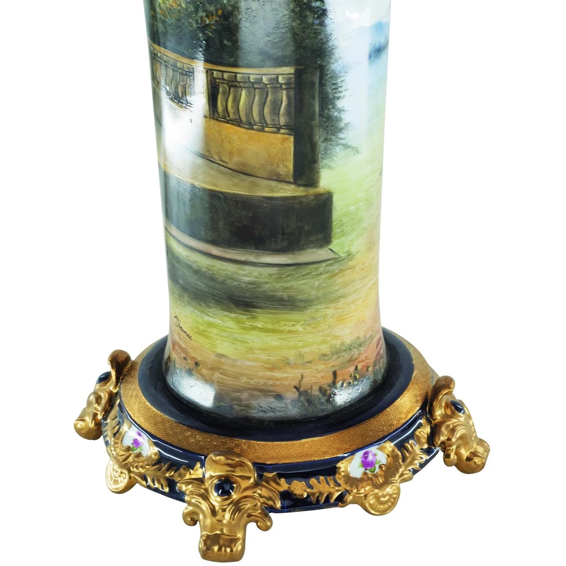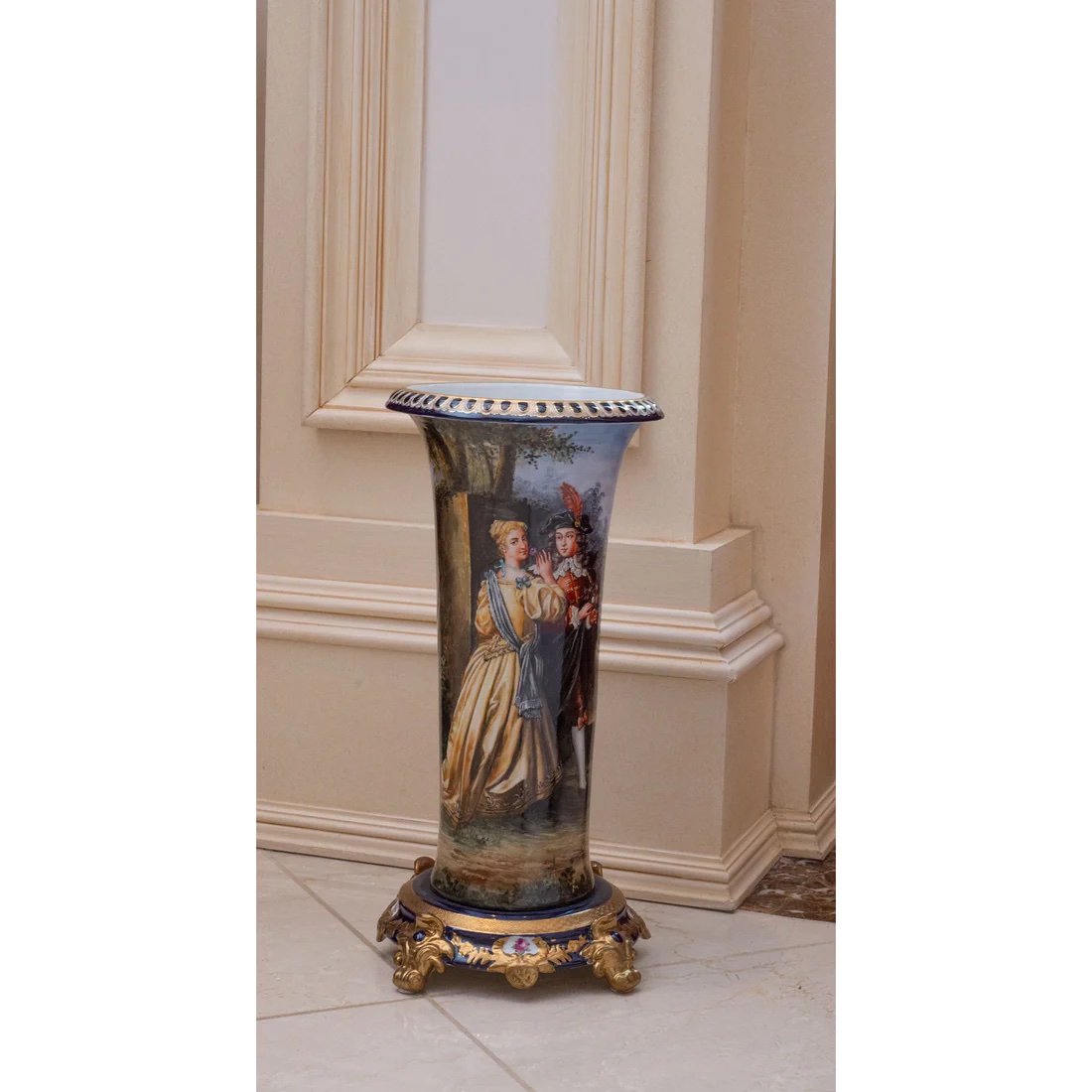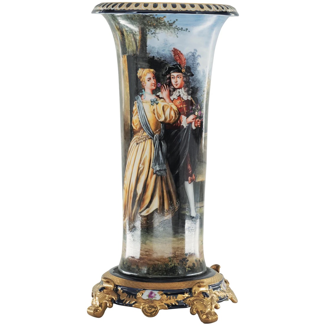 The vase comes to life with a hand-painted classic Rococo scene that tells a story of a couple in period attire strolling amidst the embrace of nature. This quintessential Rococo motif is a tribute to the era's fascination with romance and natural beauty.