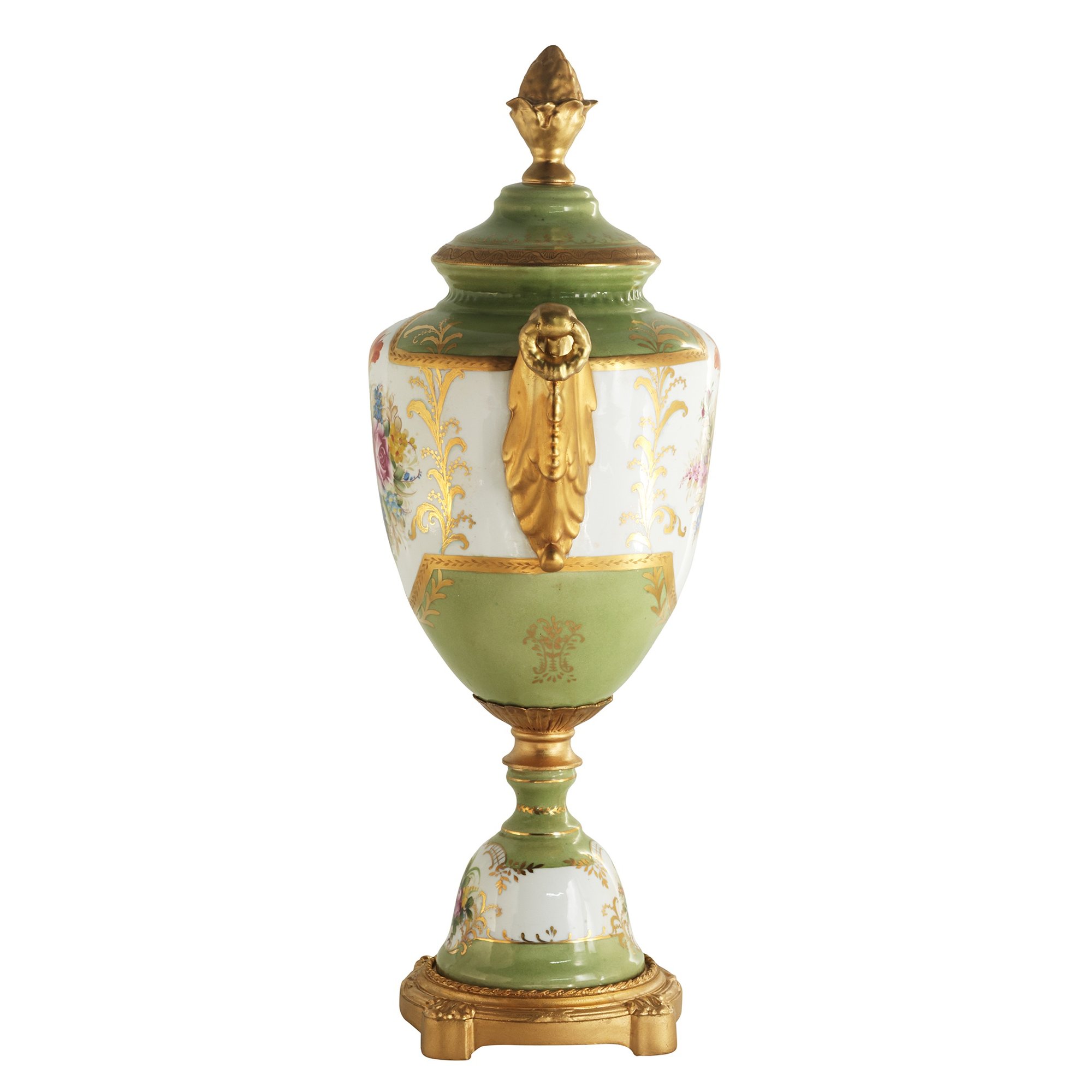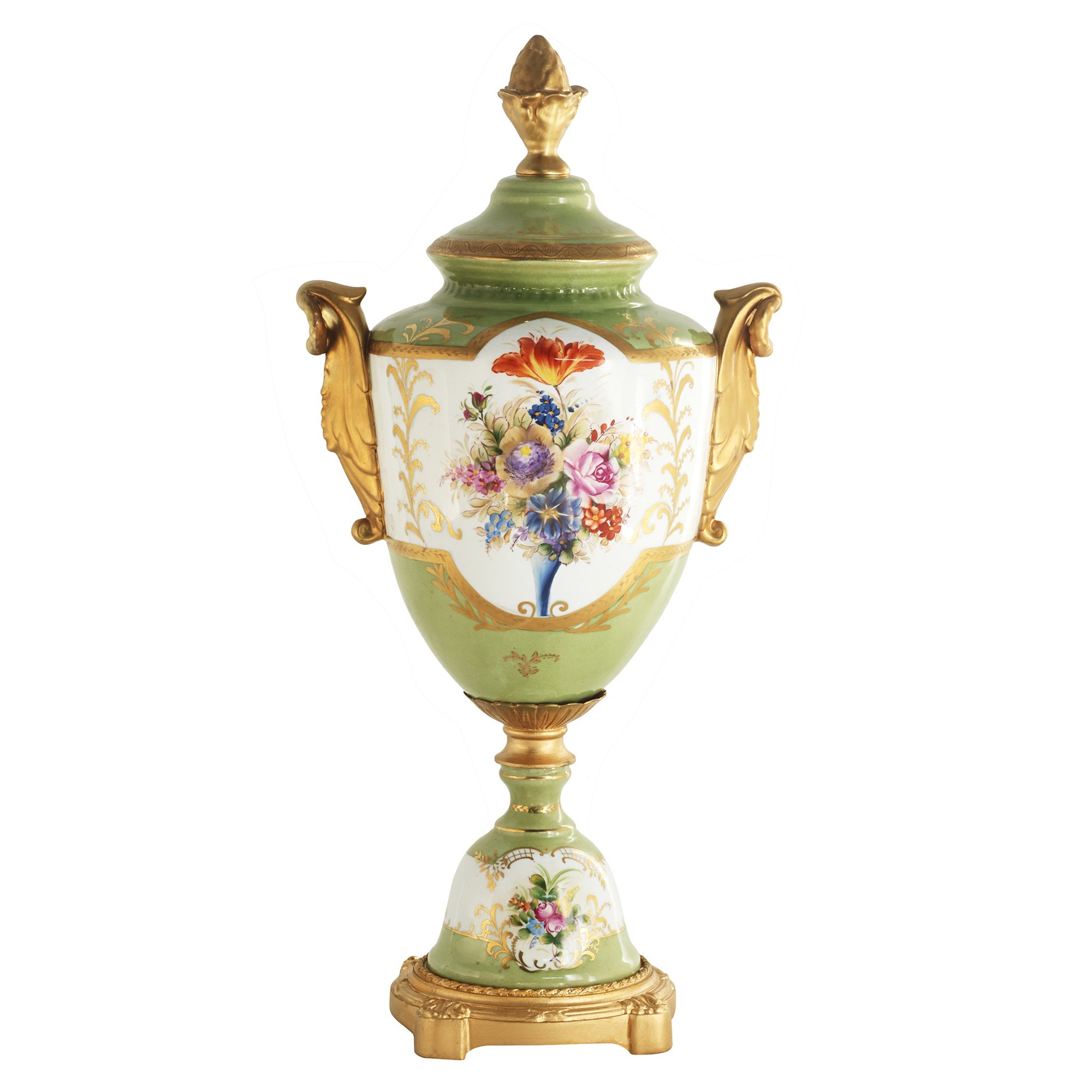 Elegance meets opulence in the Baroque Floral Porcelain Jar. Resting gracefully on an ornate flared stem and circular base, this piece harmonizes porcelain and bronze to perfection.