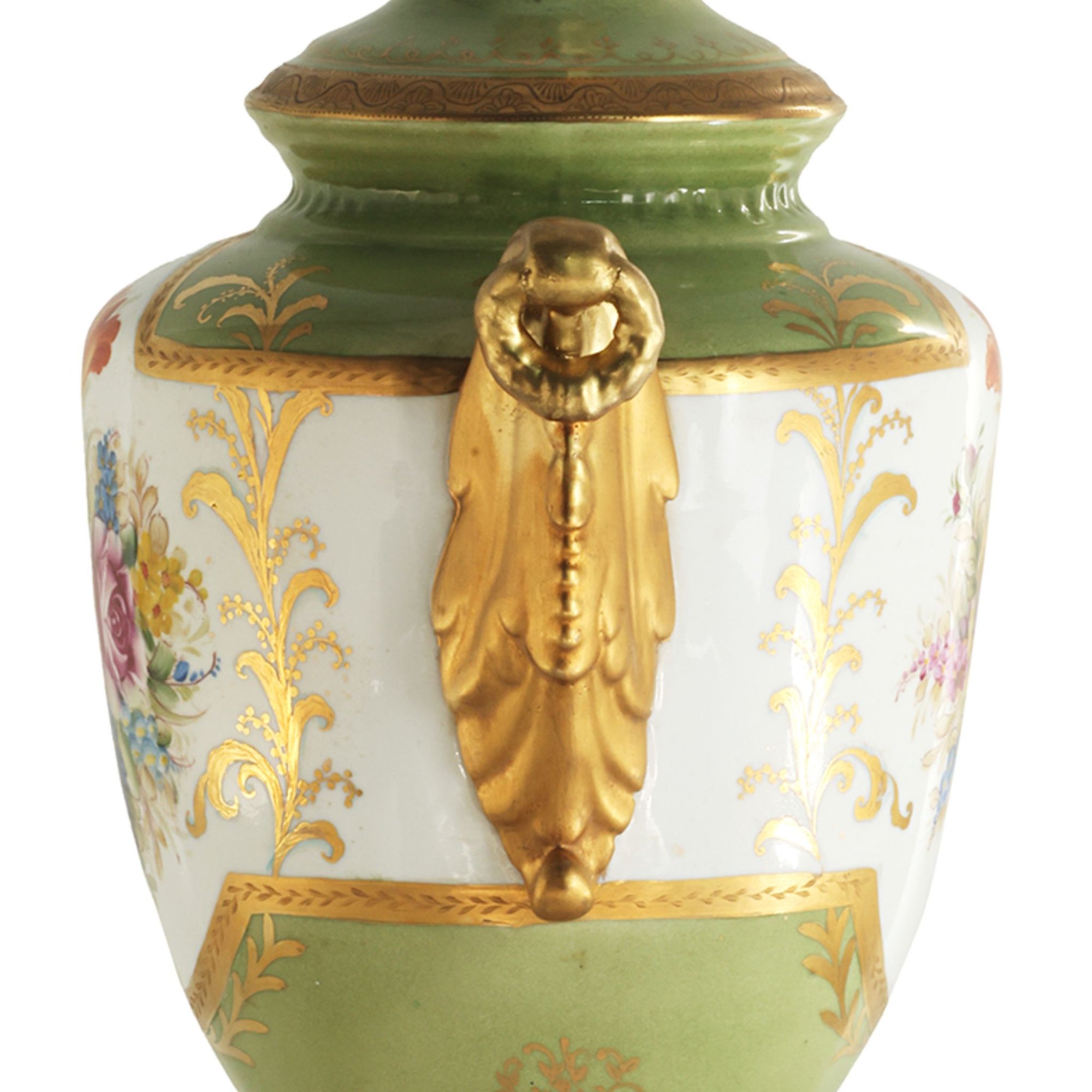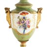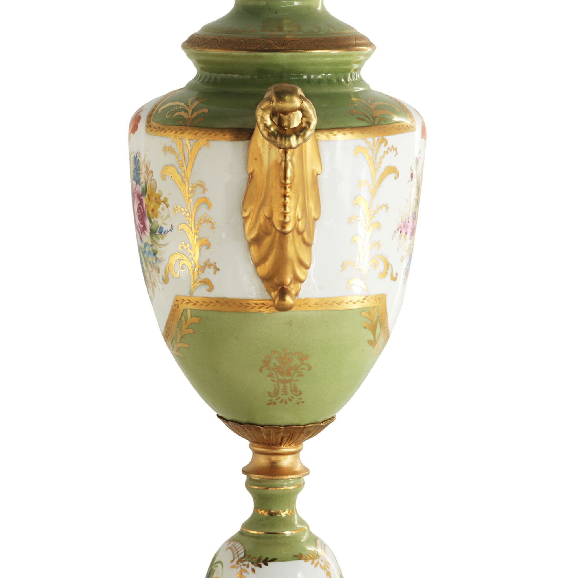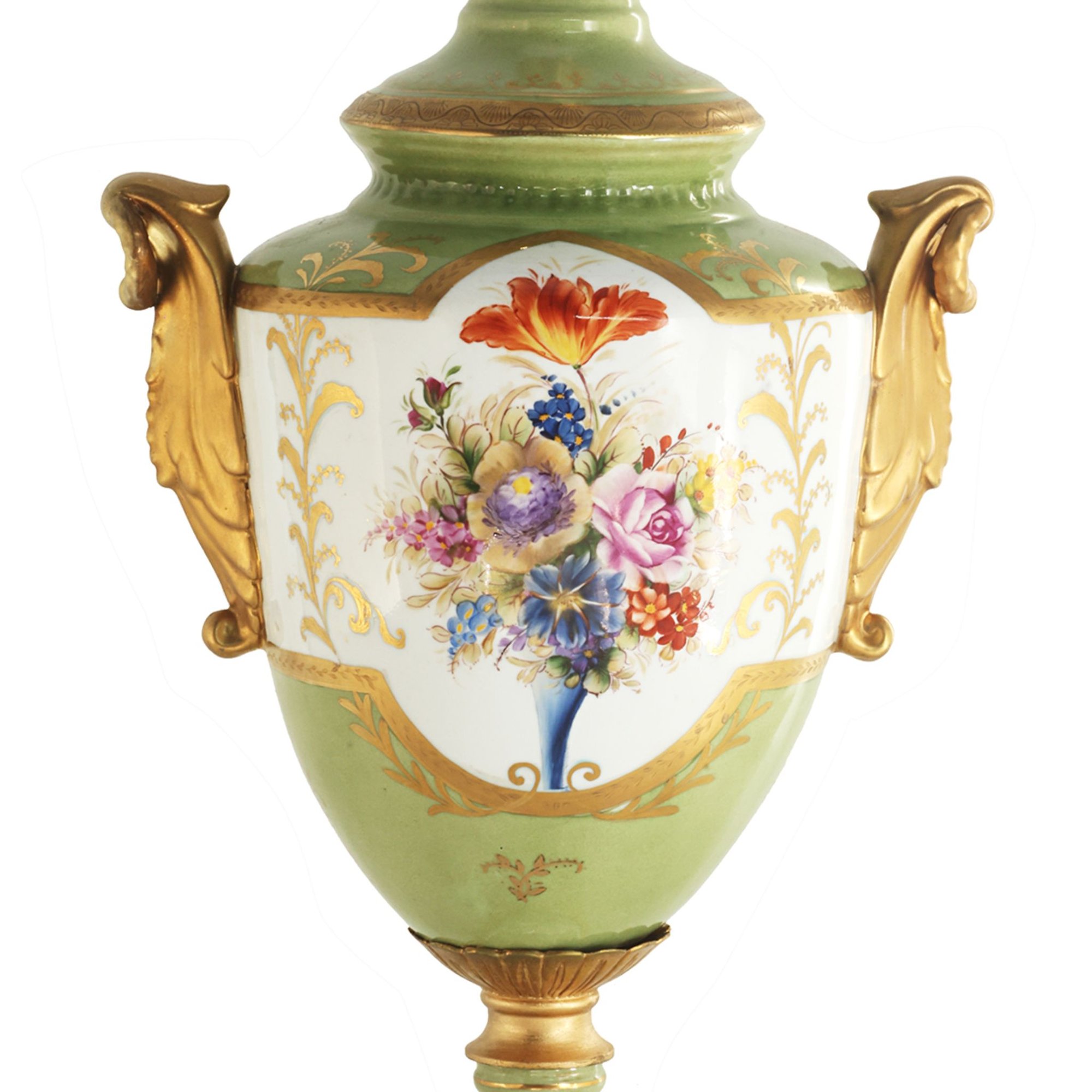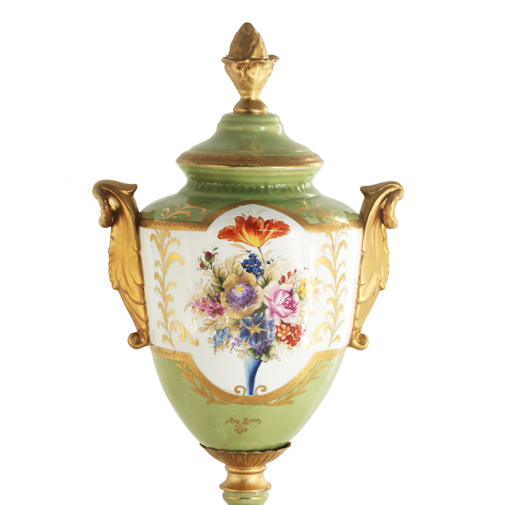 Porcelain handles, intricately detailed, elevate its allure. The delicate light green hue forms a soothing backdrop, accentuating the exquisite Baroque floral motif that graces its surface.