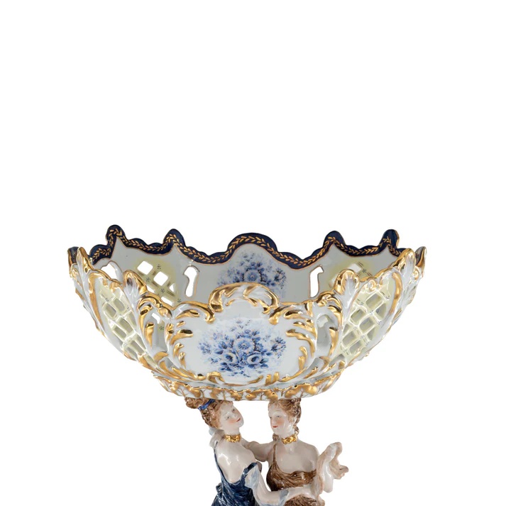 Against a backdrop of dark blue and white, the bowl's colors harmonize to create a striking and sophisticated canvas, setting the stage for a Baroque floral motif that dances like a symphony of nature's splendor. The bowl's body, resting atop this artistic tableau, is a canvas in itself, hand-painted with vibrant blue and brown hues, adorned with delicate perforations that add depth and texture.