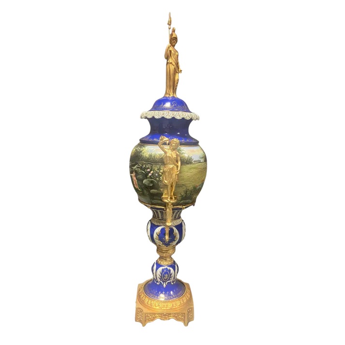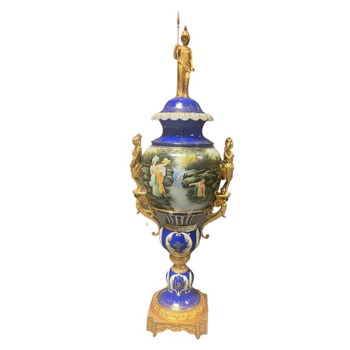 What sets this vase apart are the incredibly detailed bronze lady handles, adding a touch of sophistication and grace to its design. Completely painted by hand and composed of porcelain with bronze details, this vase is a one-of-a-kind creation that exudes timeless beauty.
