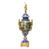 The vase's striking blue color serves as the perfect canvas for its hand-painted motifs. Each side of the vase depicts a different classical Rococo society scene, showcasing individuals in period clothing interacting with each other. The scenes are executed in shades of green, pink, yellow, and blue, creating a visual tapestry that resonates with both traditional and contemporary aesthetics.