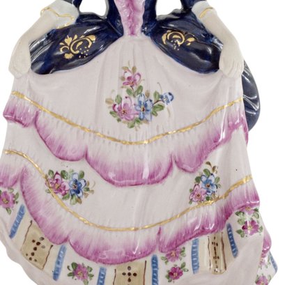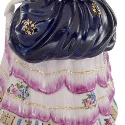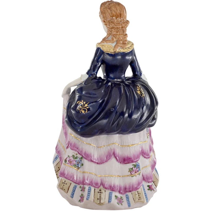 Up for auction is a hand painted porcelain figure depicting a woman in period clothing. Created in a classic Rococo style, this figurine is brand new and stands 9.5 inches in height.