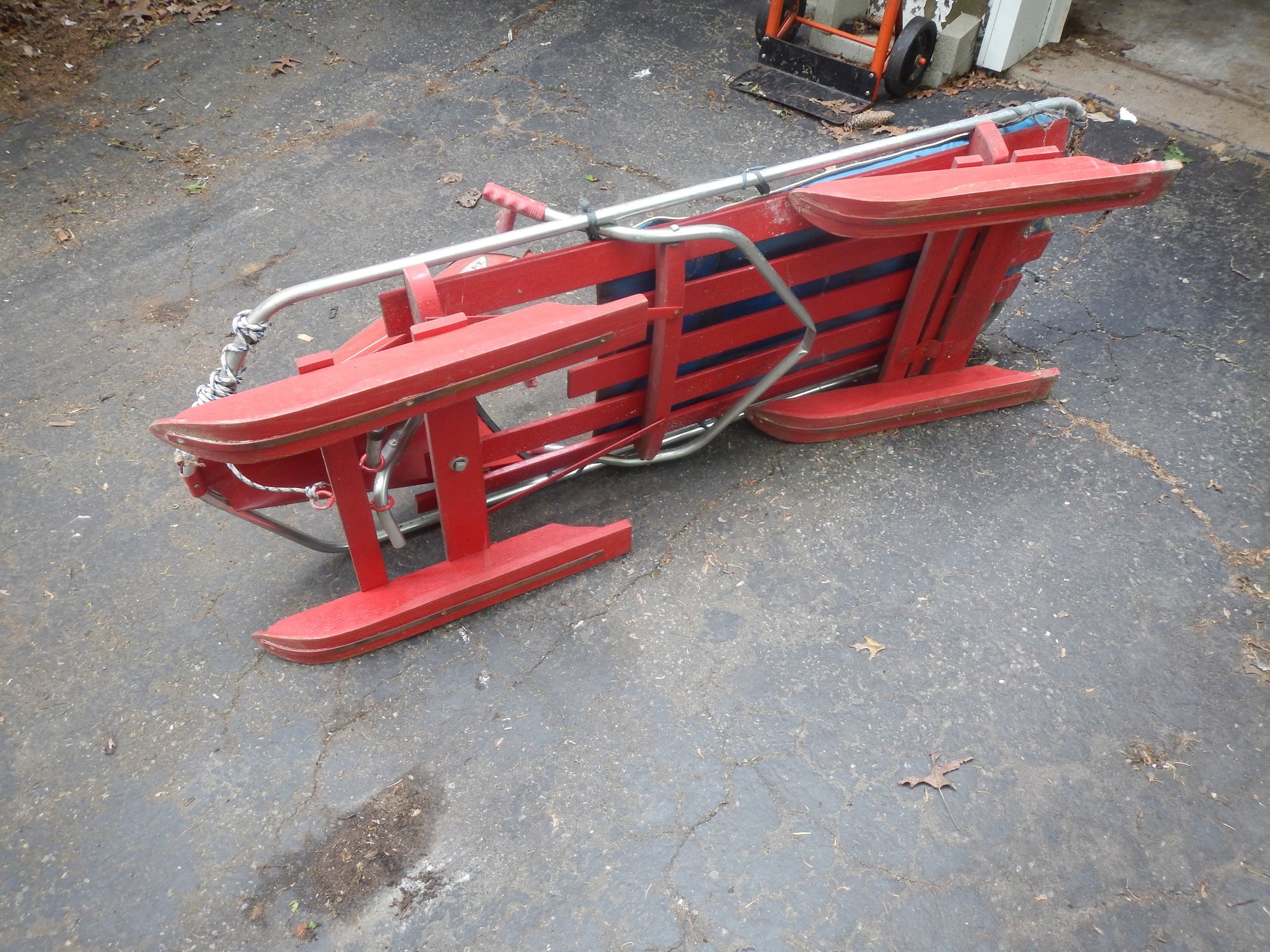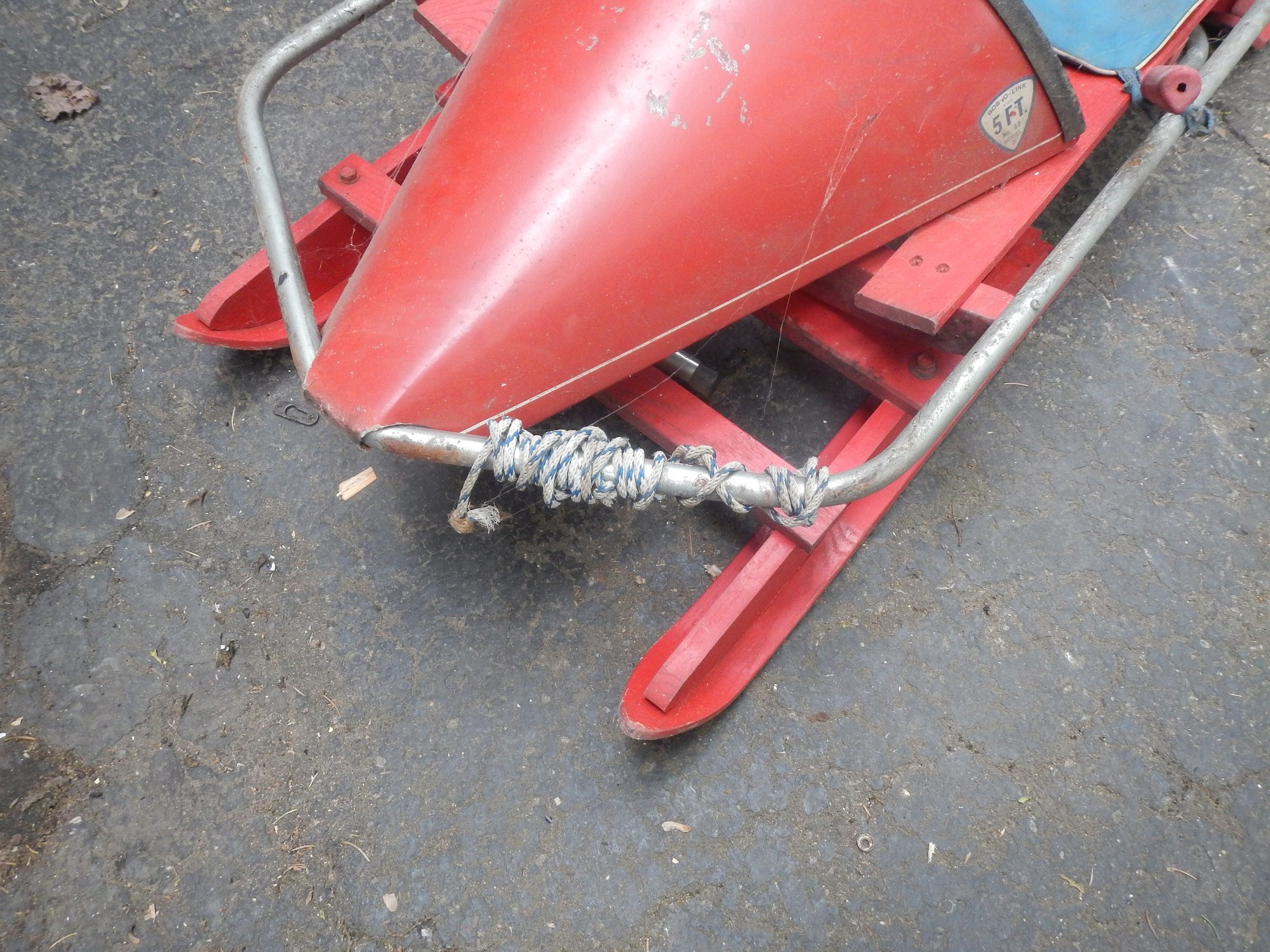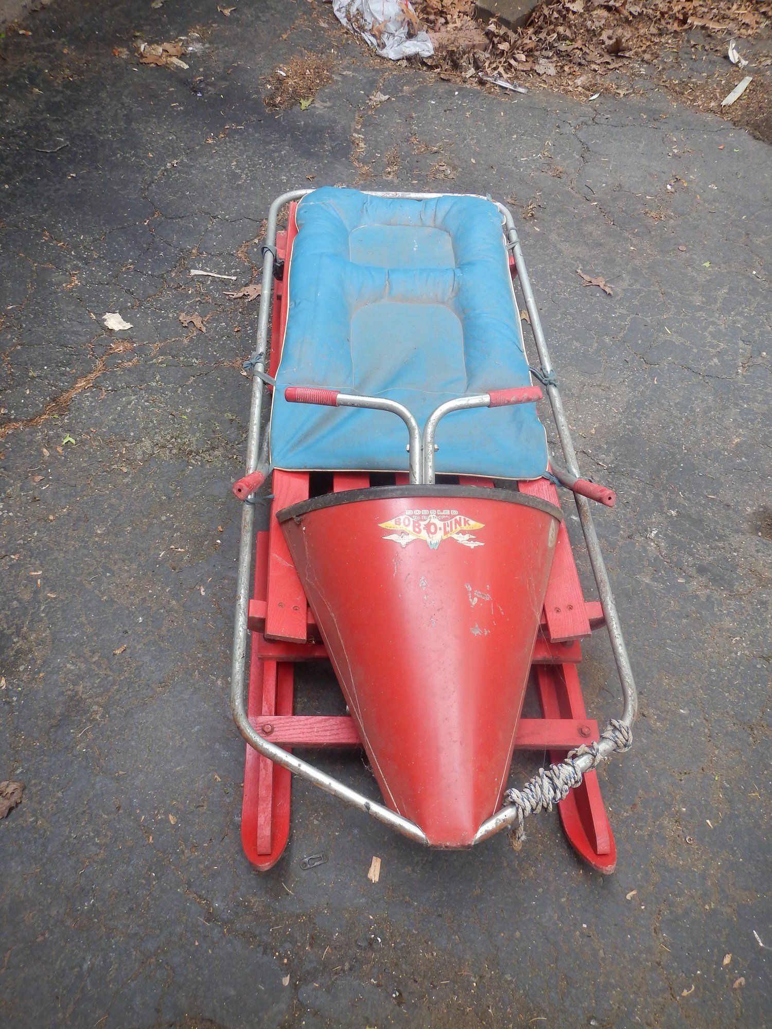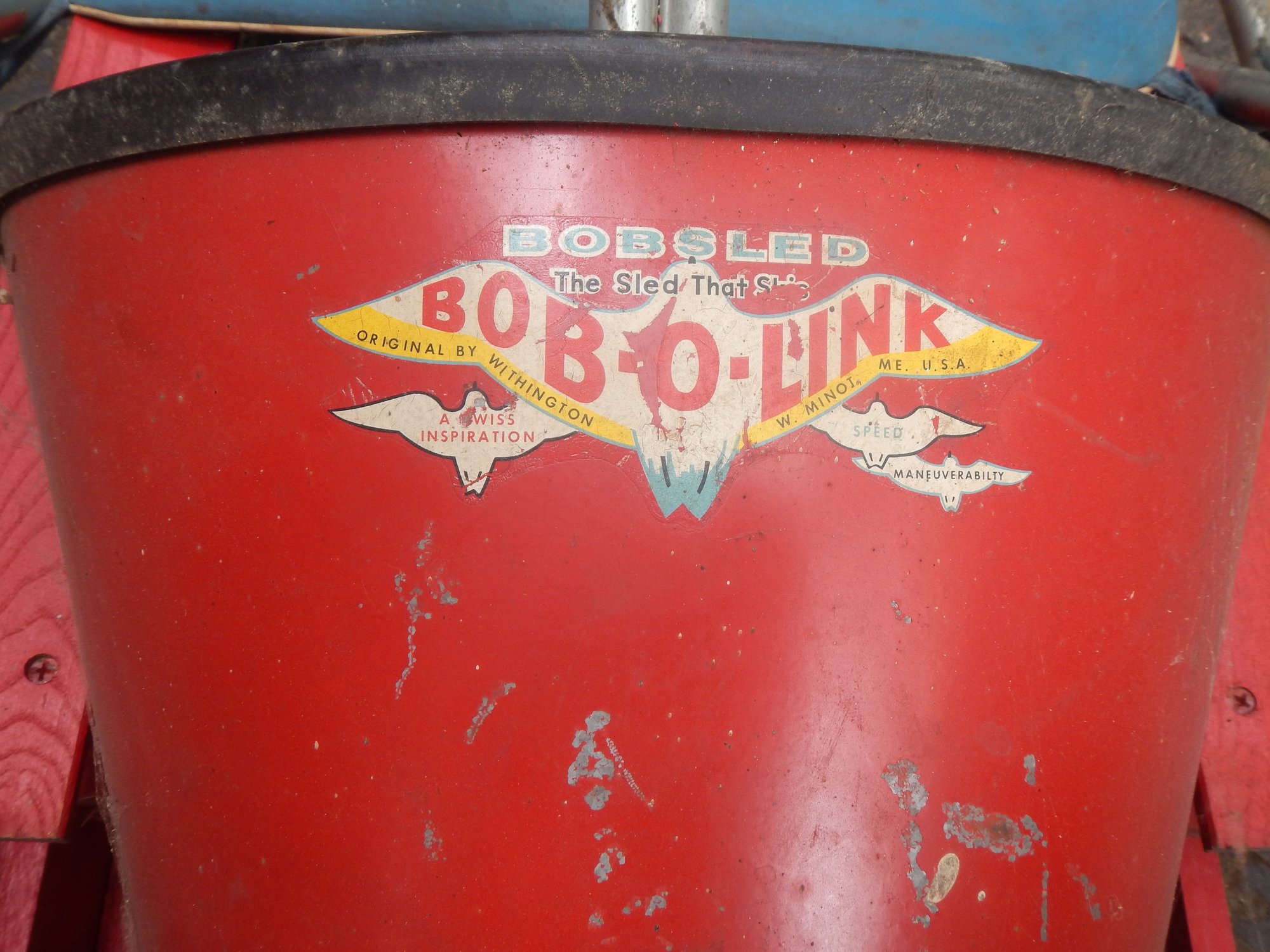 The Bob-O-Link bobsled is a classic vintage sled, known for its unique steering mechanism and "The Sled That Skis" slogan.