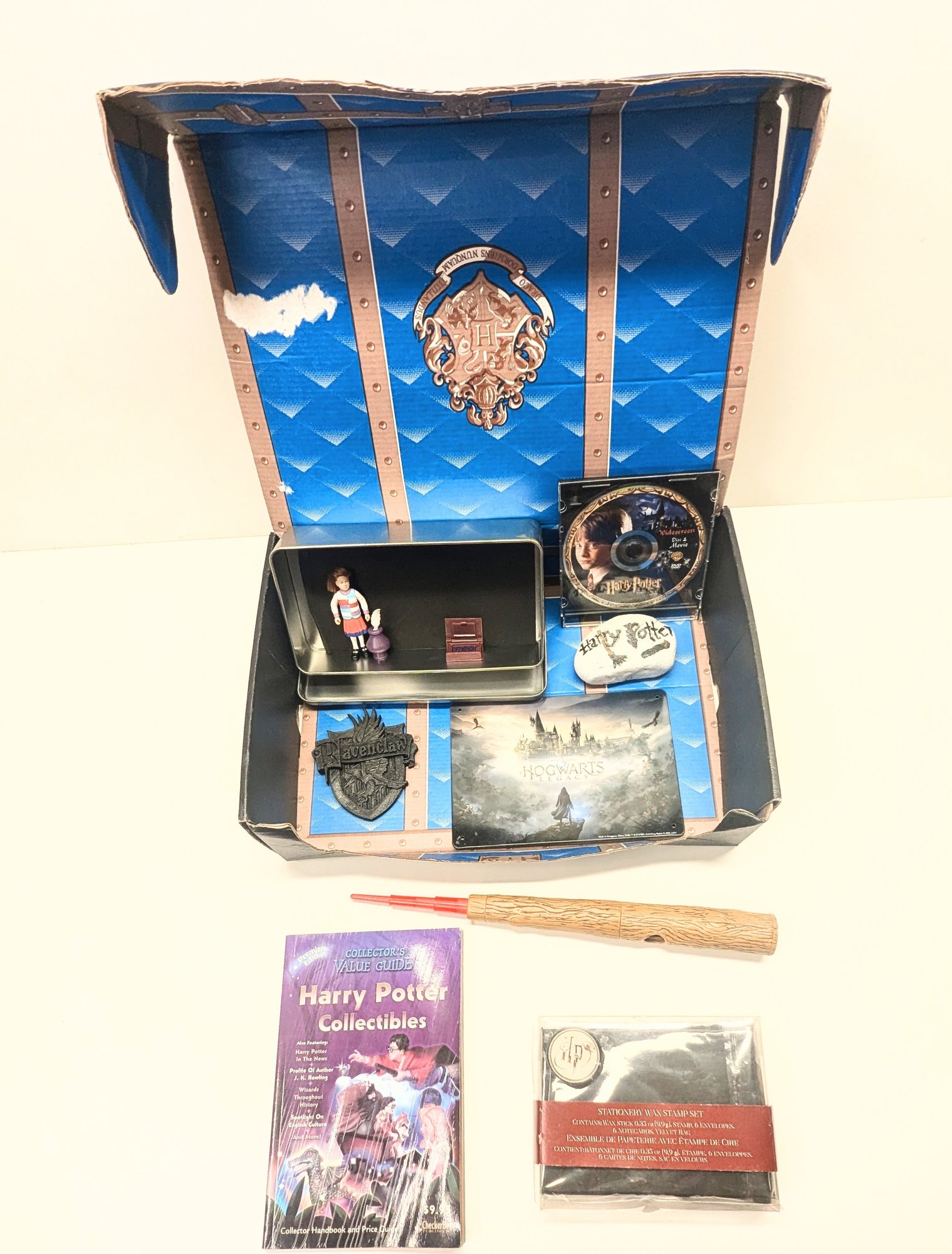 Harry Potter wand, Hogwarts tray, Harry Potter and the Sorcerer's Stone DVD Movie, Stationary Wax Stamp Set and more.