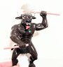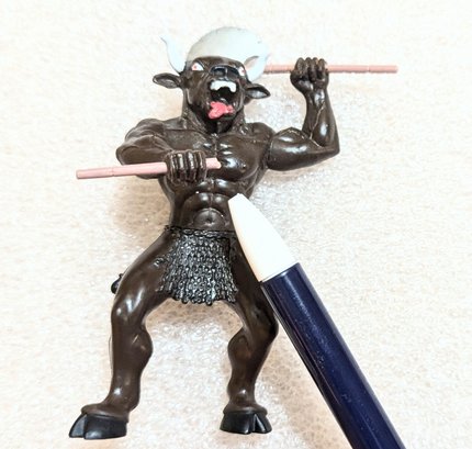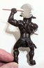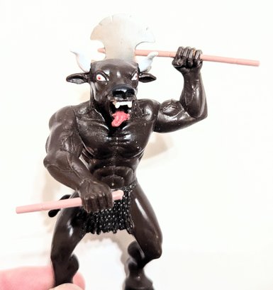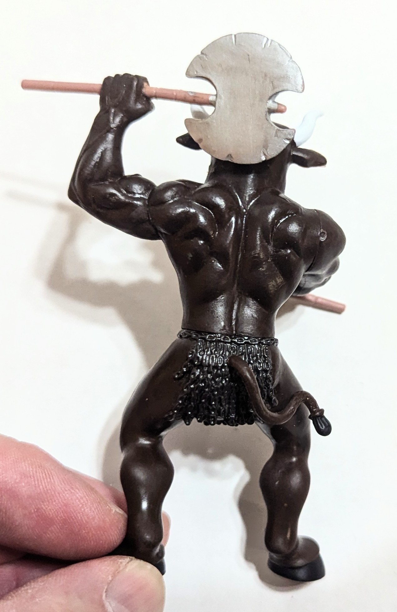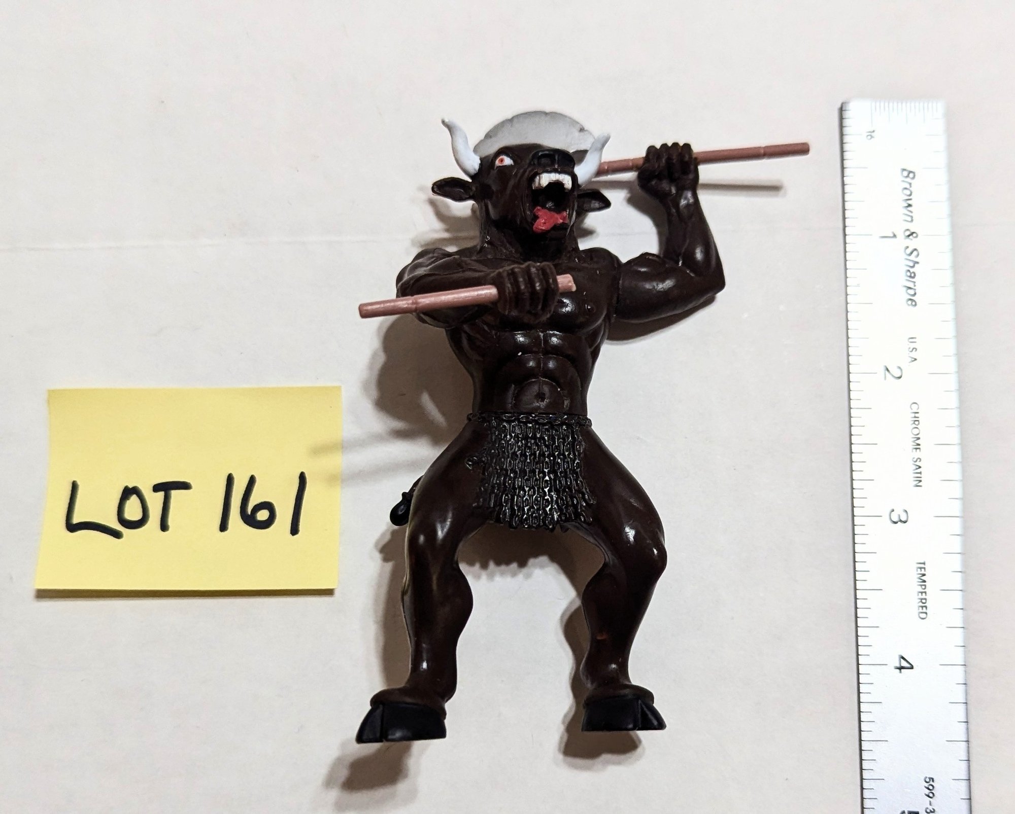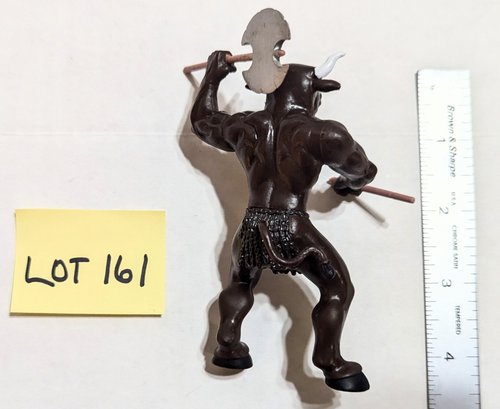 Has one battle axe. Looks like there is a handle for a second, but it is broken.