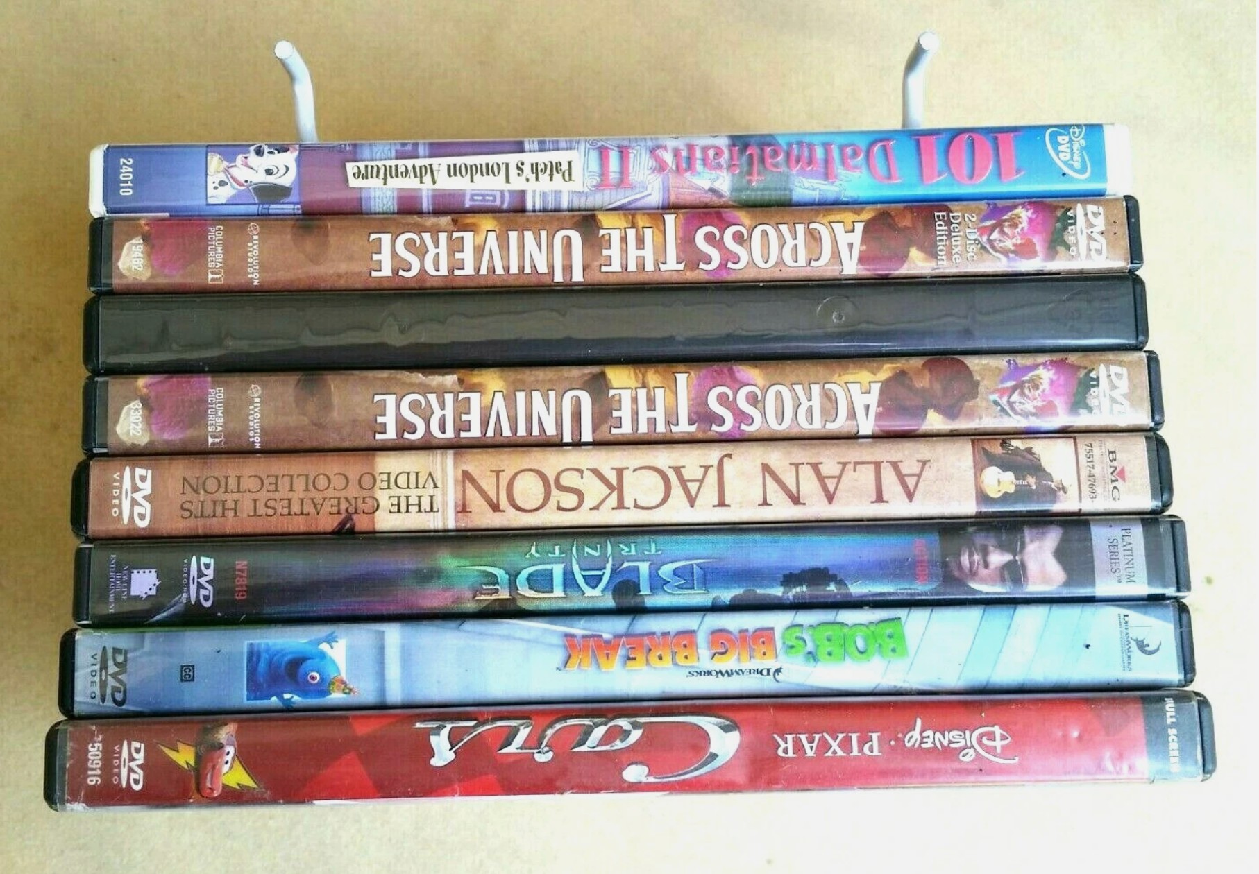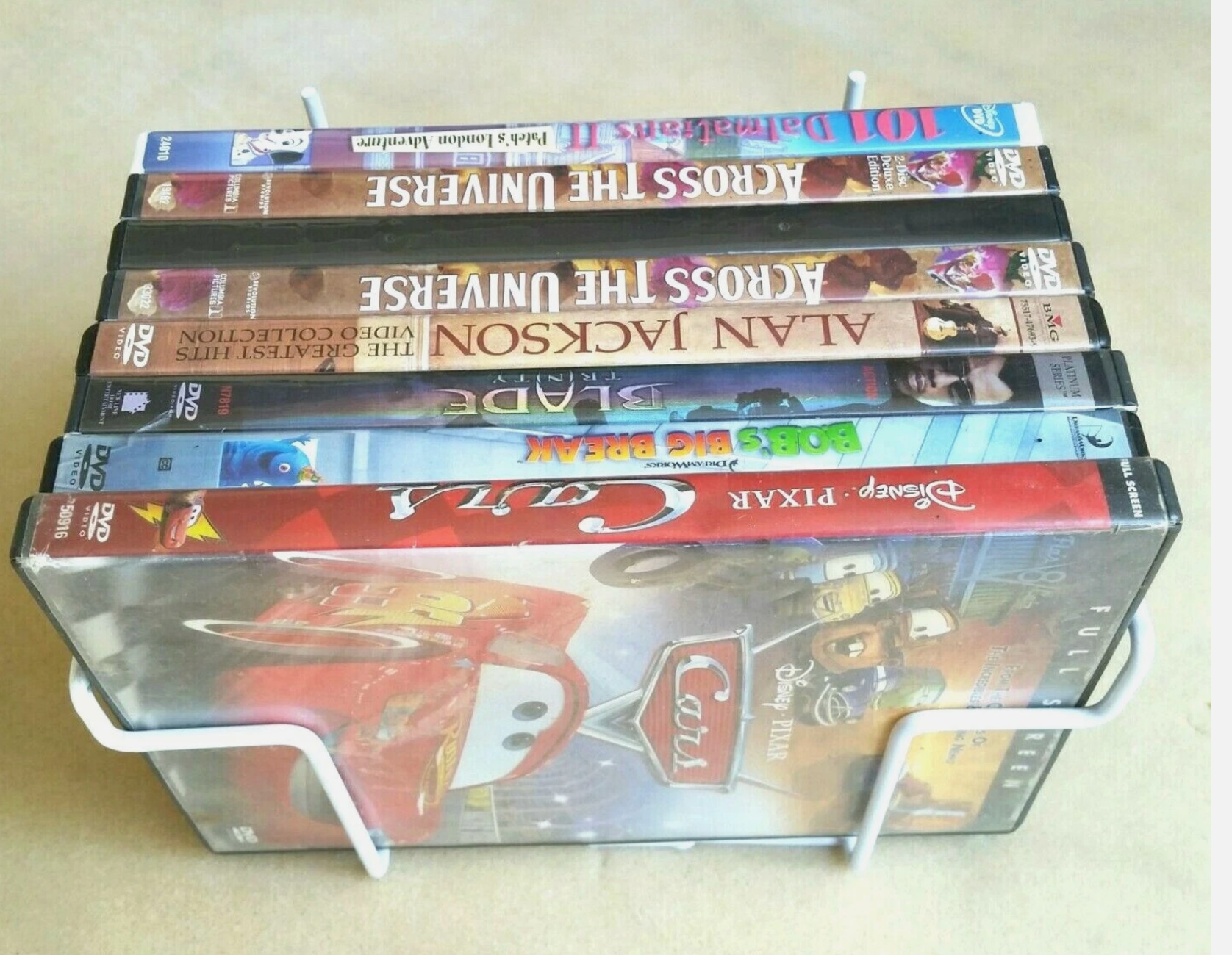 - White metal wire holders are designed for DVDs, but most Blu-rays and some Video Game cases will fit.