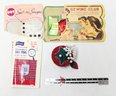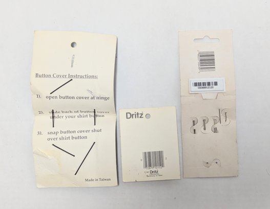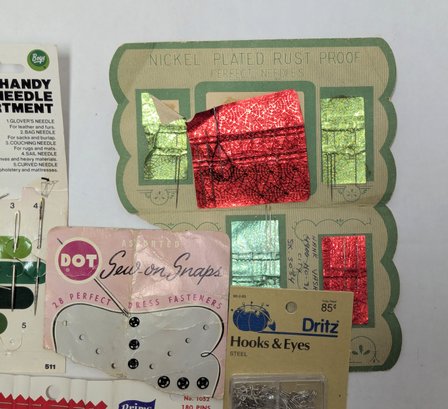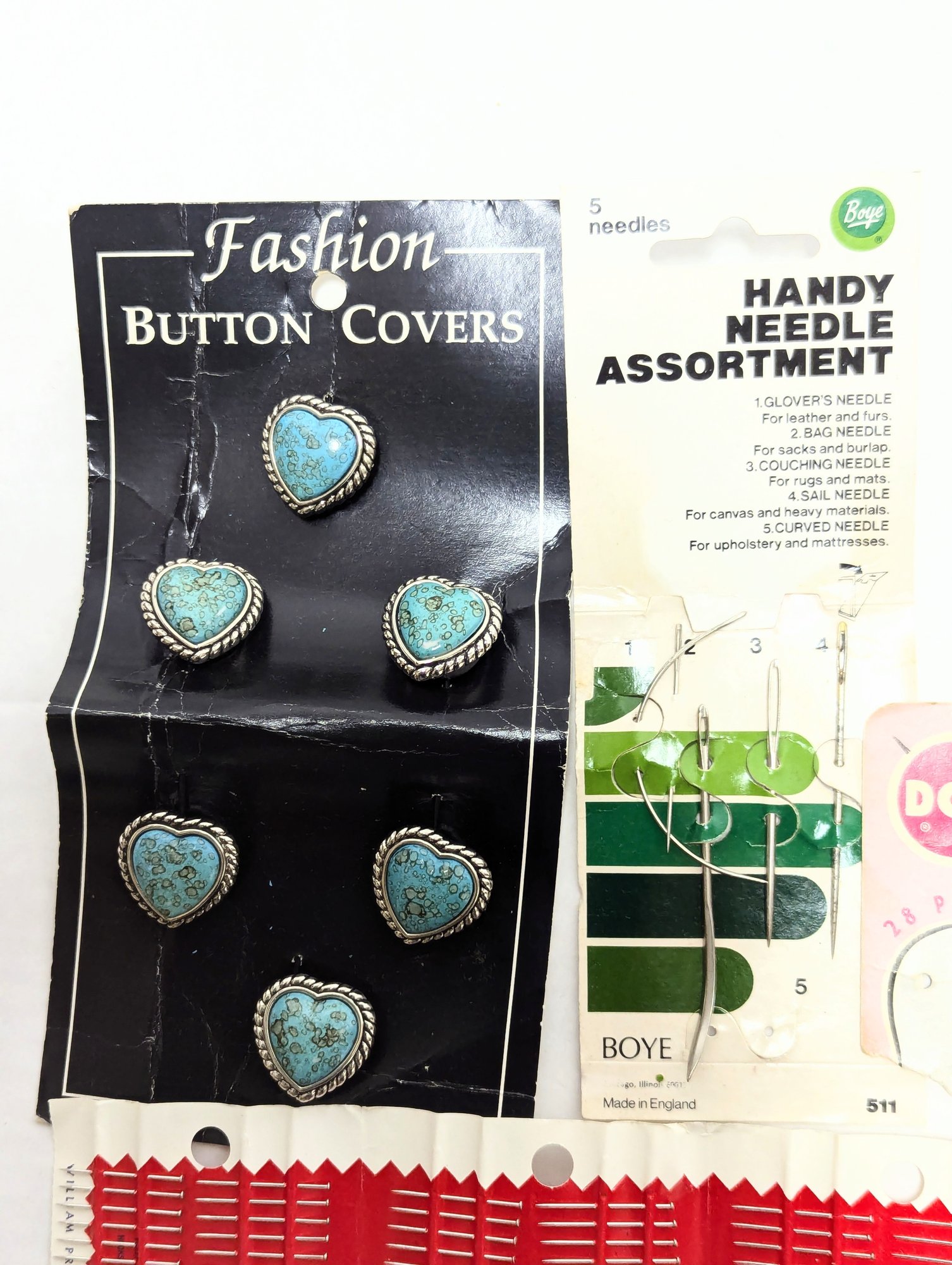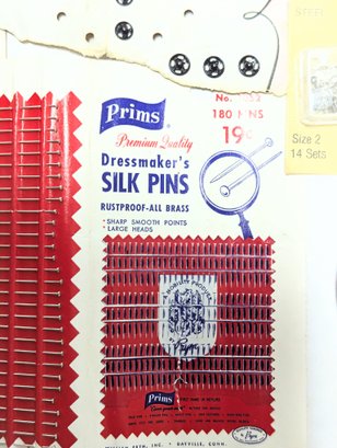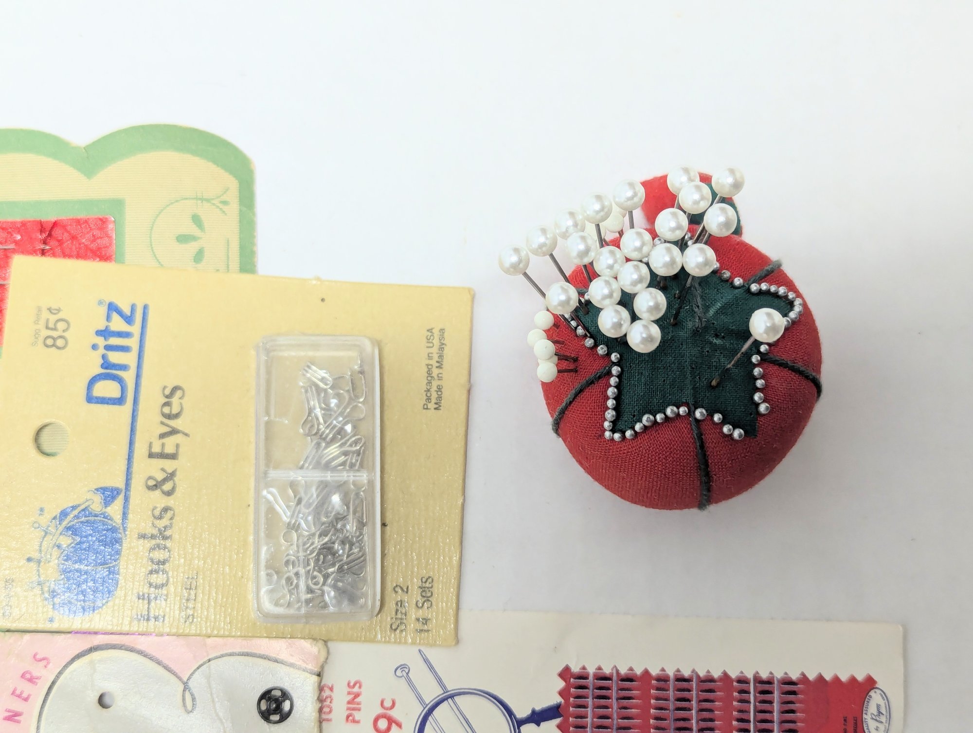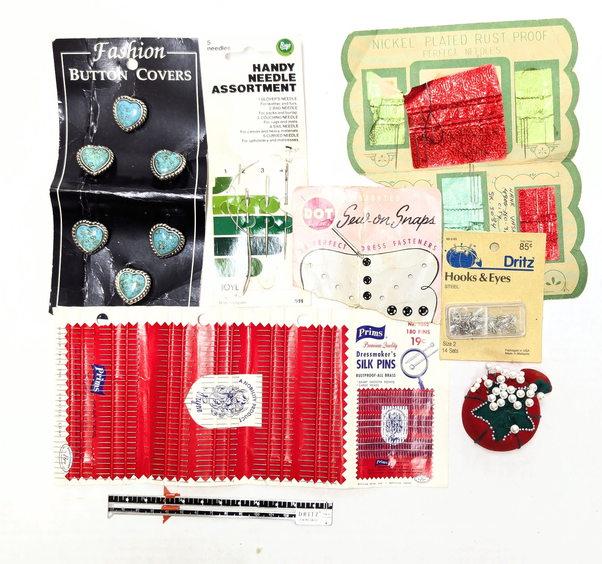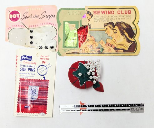 Vintage Notions: Silk pins, button covers, Dritz quilting gauge ruler, red tomato and strawberry pin cushion and more!
