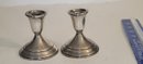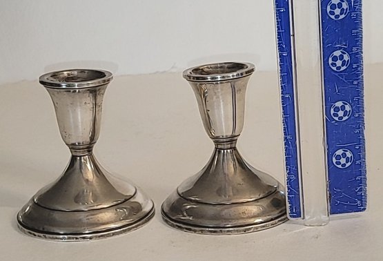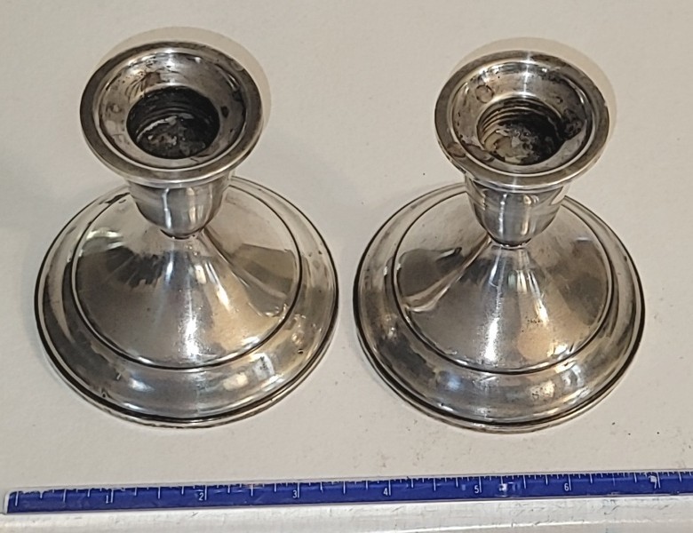 This pair of mid-century Towle Silversmiths sterling silver weighted candle holders, model #512, features a classic flared rim design with a base diameter of 3.75" and a height of approximately 3.6". Each piece is clearly marked on the protective black plastic base as "Towle Sterling 512 Weighted and Reinforced." Individually weighing 230g and 231g, the pair has a combined gross weight of 461g. In weighted items of this specific construction, the sterling silver shell typically accounts for 10-15% of the total mass, resulting in an estimated 46–69 grams (approx. 1.5–2.2 troy oz) of sterling silver for the pair. Based on the current silver spot price of approximately $79.90/oz, the estimated scrap melt value for the set is roughly $110–$165. However, representative retail listings for this model in excellent condition with no dings or dents typically range from $175 to $225 for the pair, as they hold higher value as functional decorative antiques than as scrap metal. Shipping: Add $7.00 to direct USPS costs within the USA. Buy more than one item and combine shipments. First item is at the highest USPS cost then all other items are $1.00 additional costs in the same box. Multiple boxes don't apply. A very nice item from original estate that it was signed over to. PICKUP!!! ALL ITEMS WON THAT ARE LESS THAN $50.00 SINGLE OR IN COMBINATION ARE CHARGED A $10.00 PICKUP FEE. NO EXCEPTIONS. TAKE ADVANTAGE OF THE OPPORTUNITY! WIN MORE ITEMS!!!