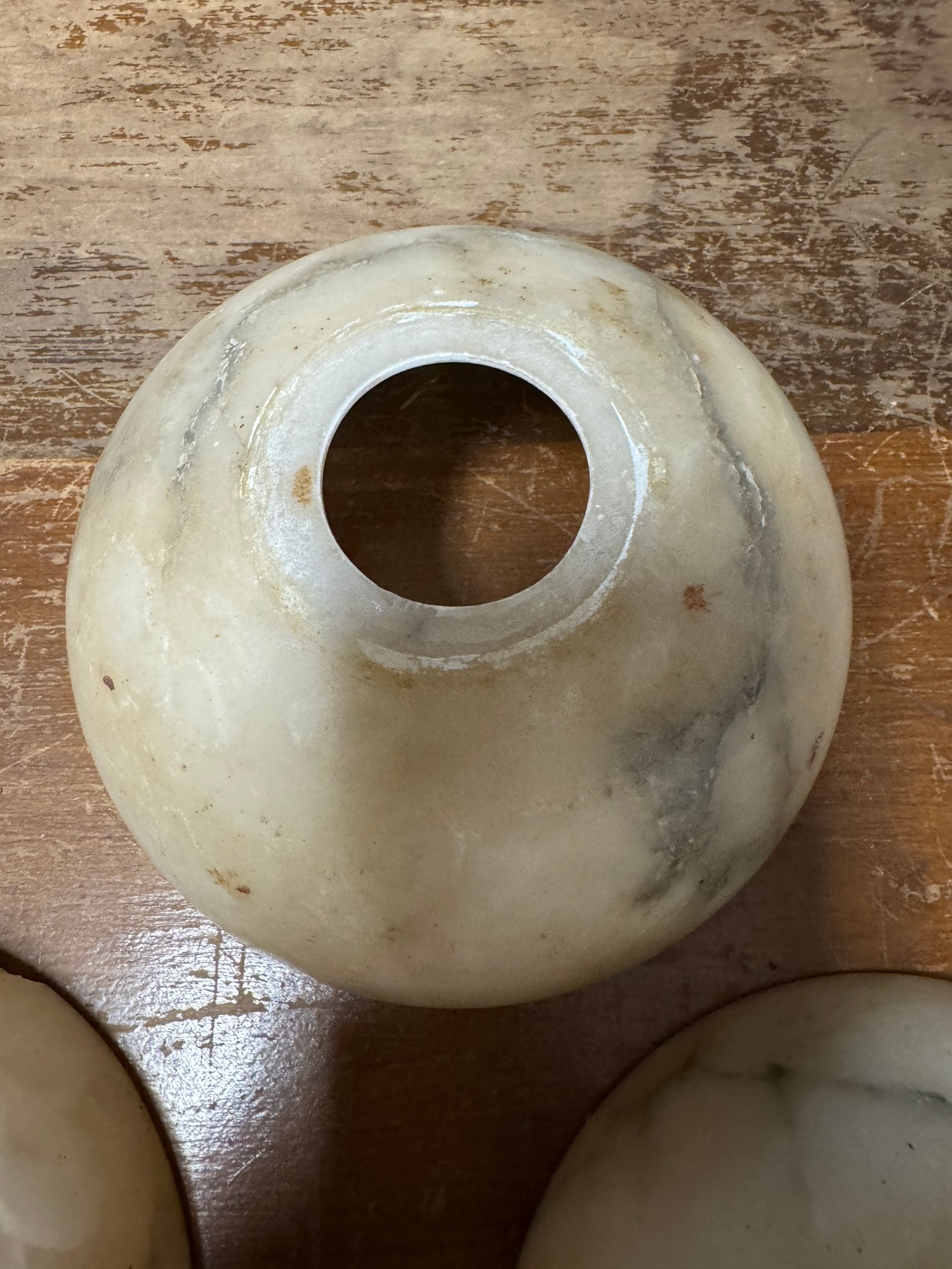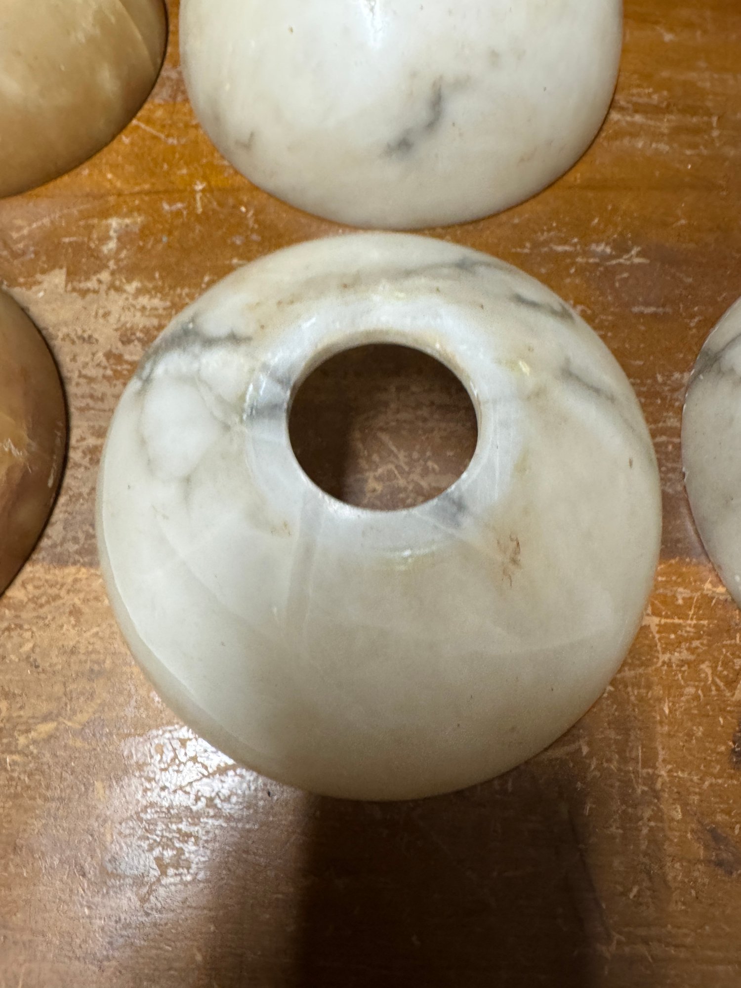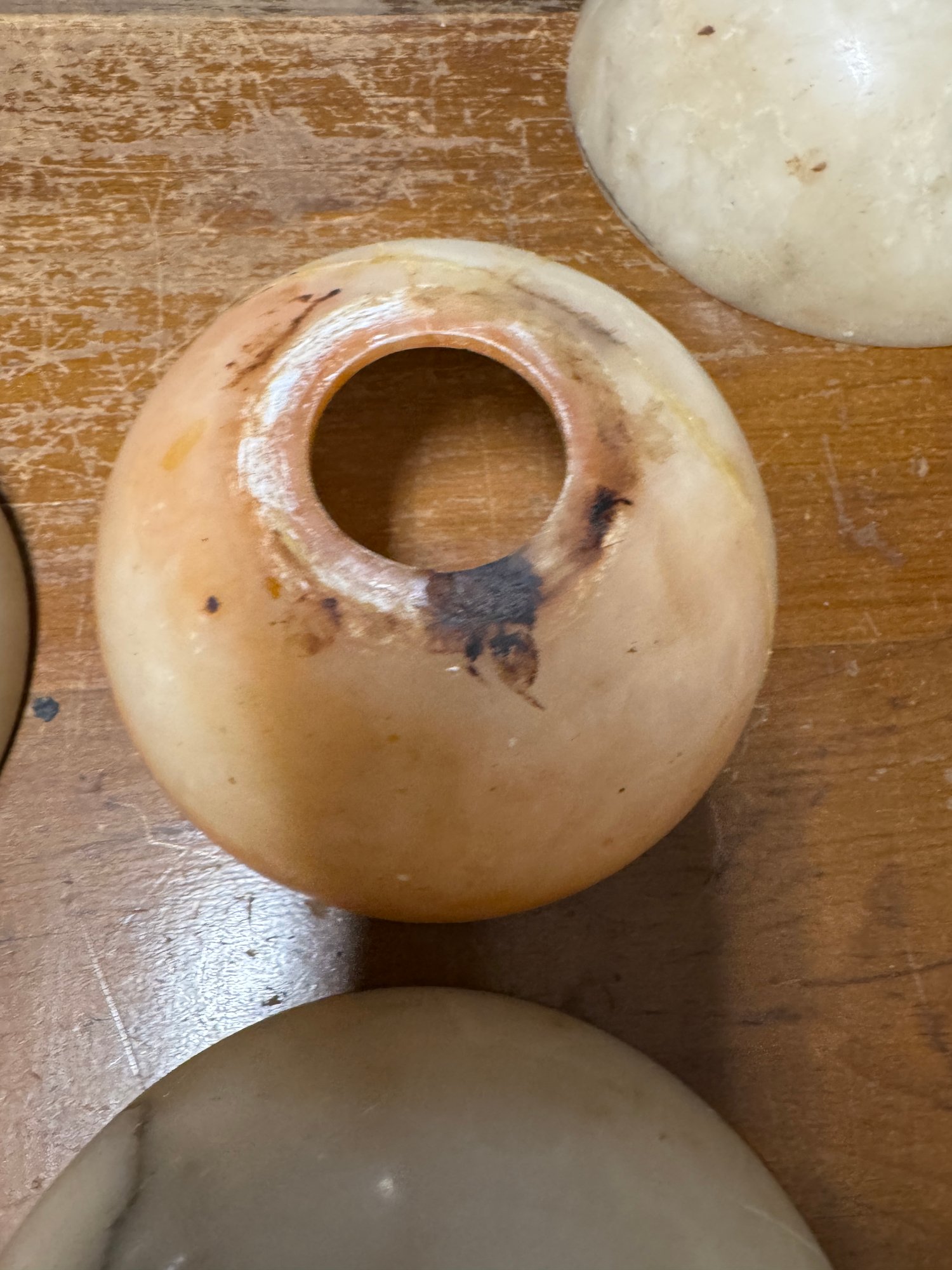 10 Antique Alabaster Shades. 9 are in pretty good condition, the reddish one has damage. See pics for size.