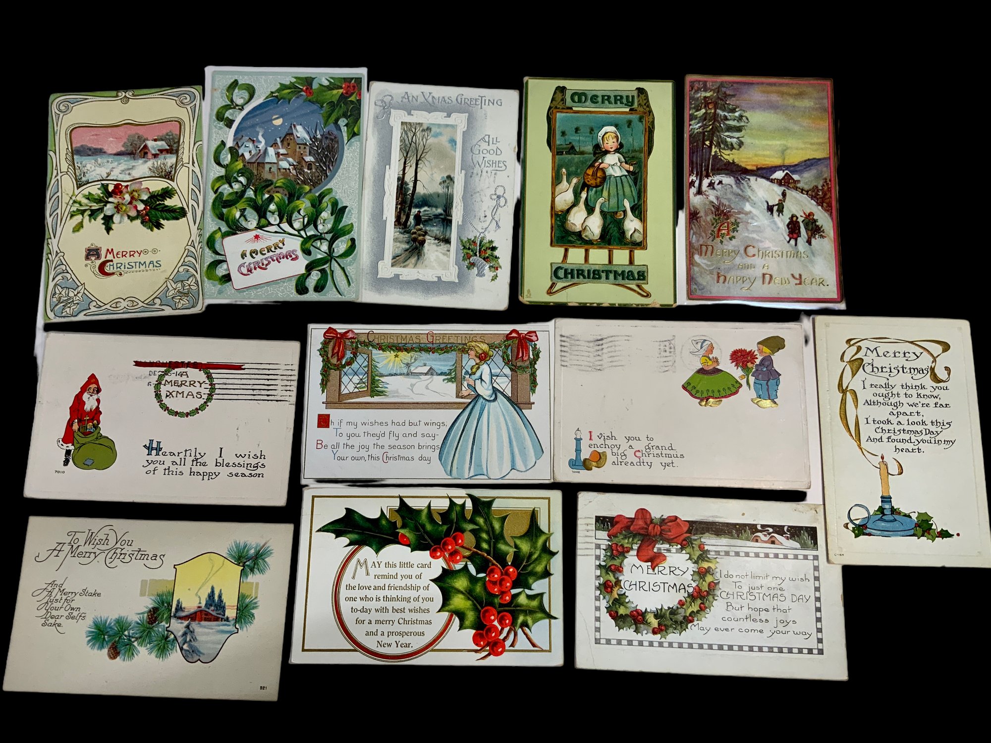 12 Antique Christmas Postcards, most with WOB.