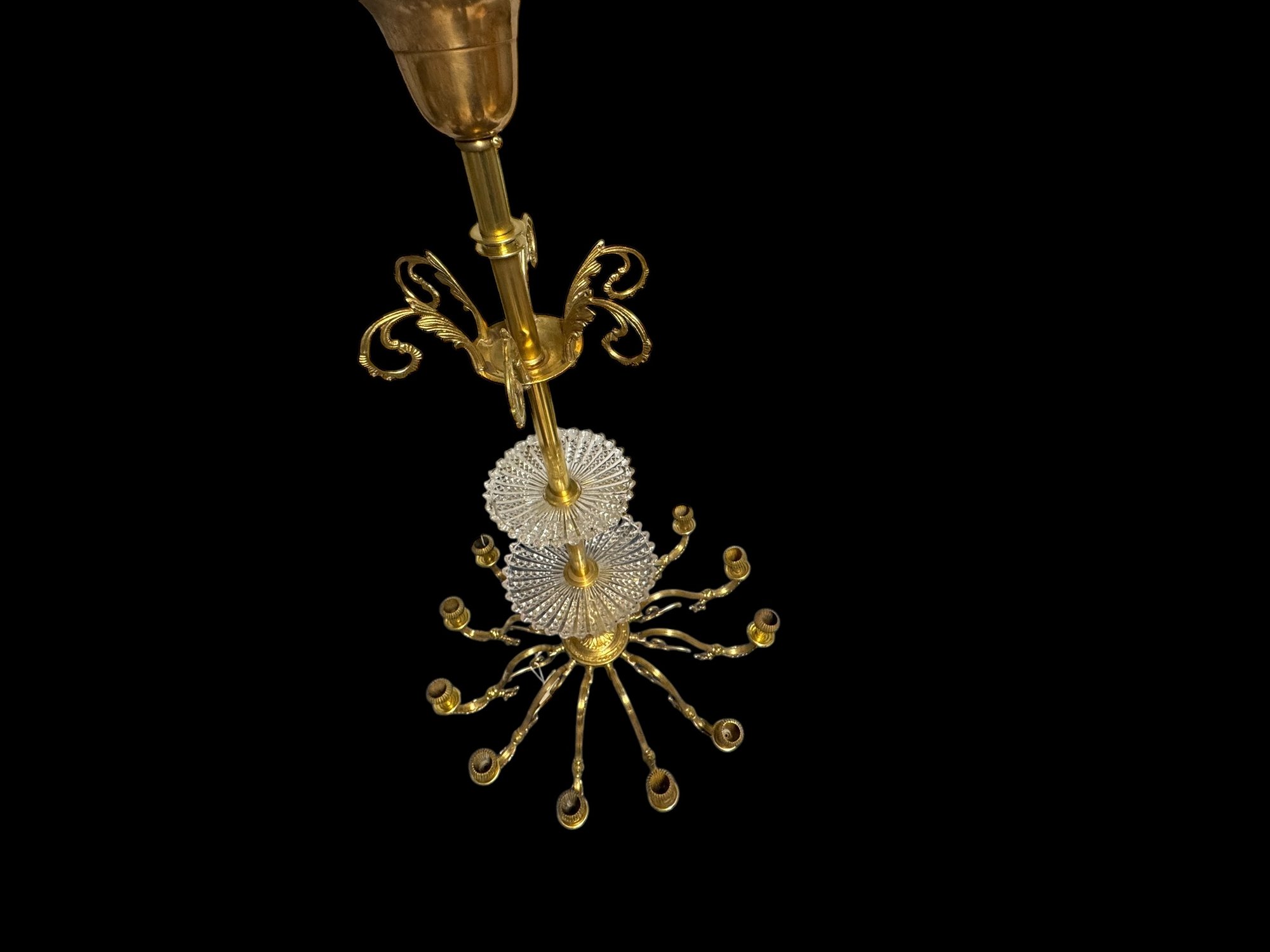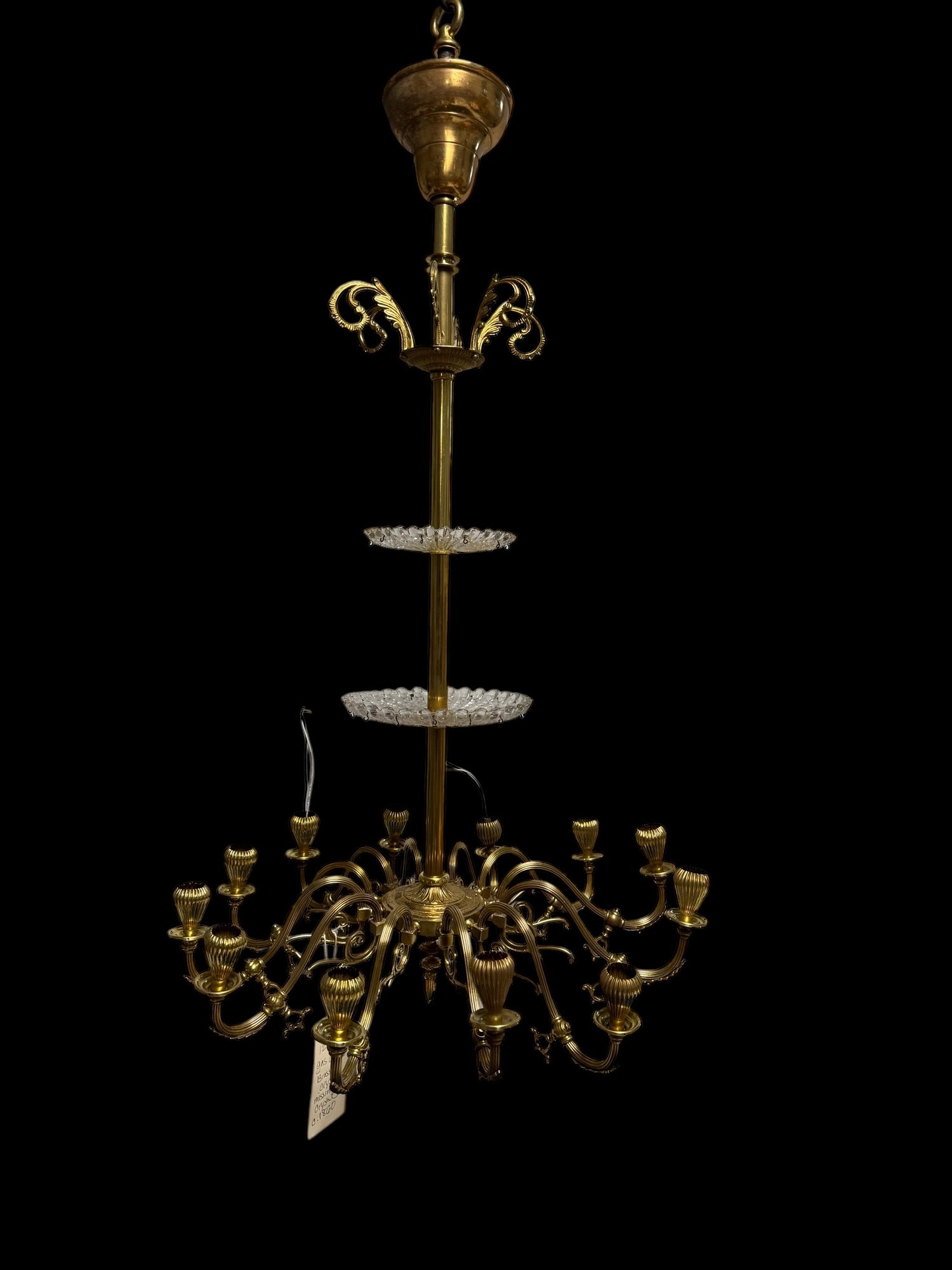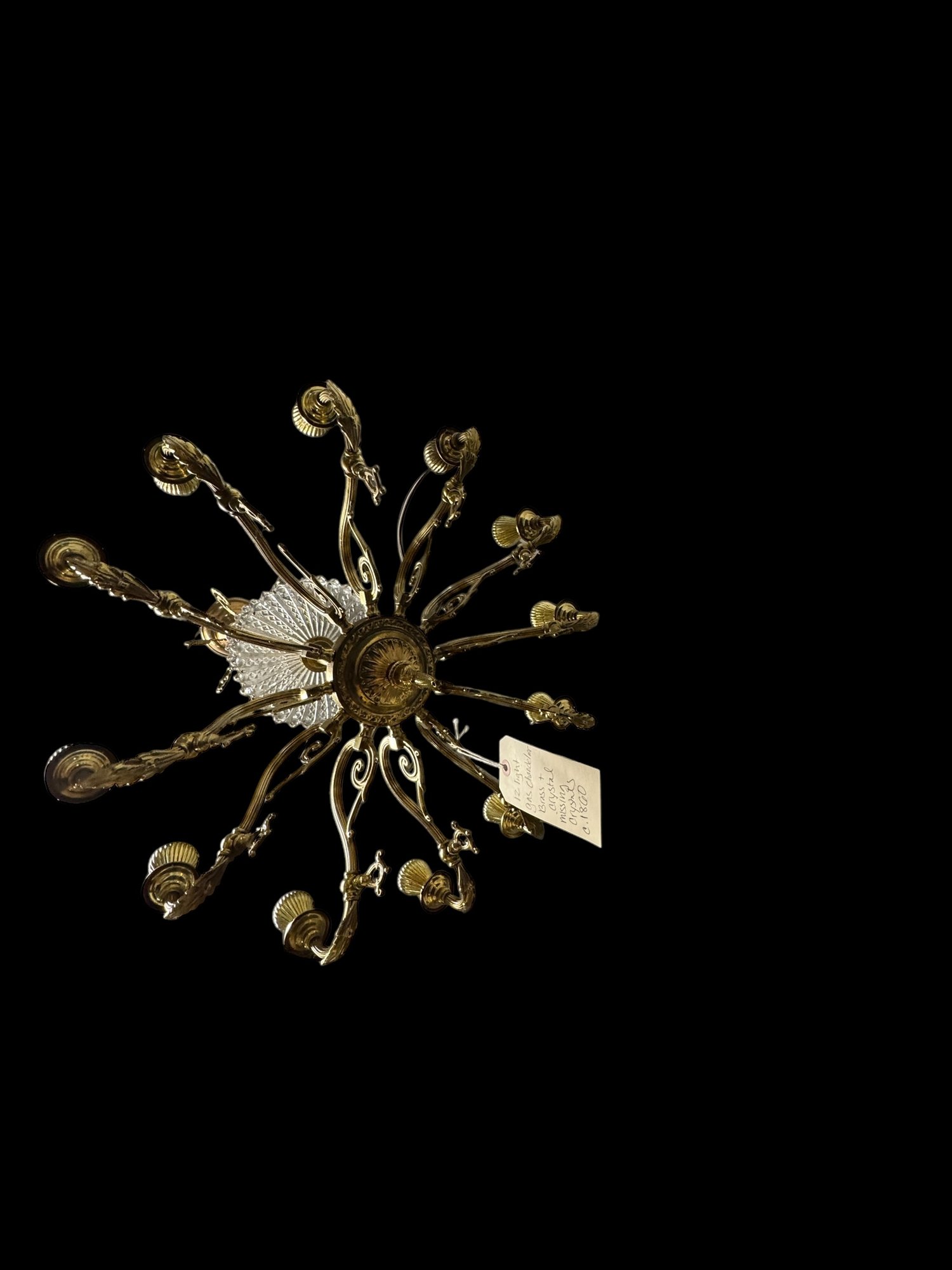 12 Light Gas Chandelier Brass c 1860. 41" drop x 22" diameter. Needs Crystals. Find yourself some crystals and you've got a room maker!