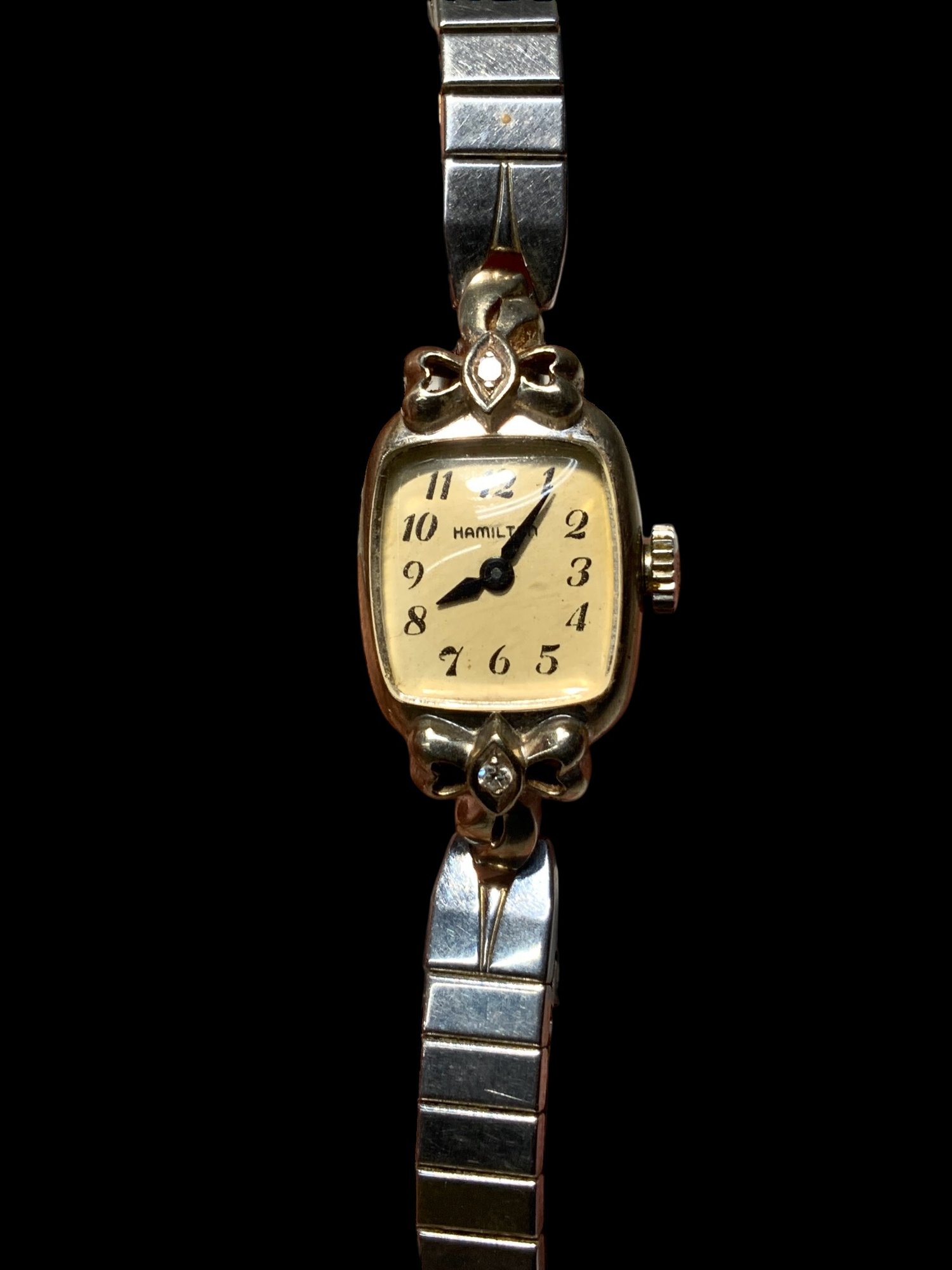 14K And Diamond Hamilton Lady’s Wristwatch Mid Century, marked 14K, band is gold plate. Winds, currently running but not timed for accuracy. Very minimal if any scratches on the glass.