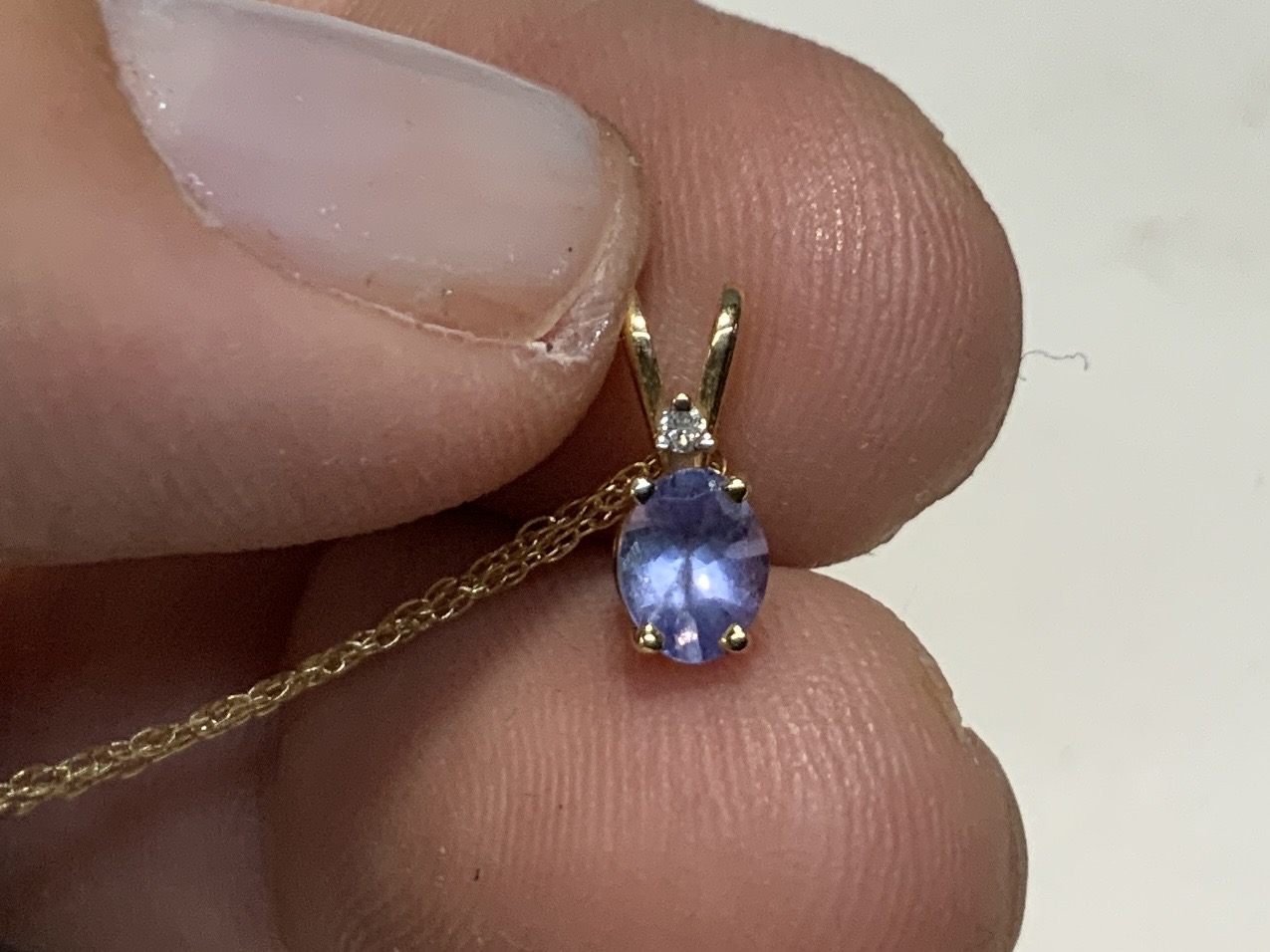 14K gold And Tanzanite Pendant Necklace, .59 DWT, marked 14K. Chain measures 18 inches in length.