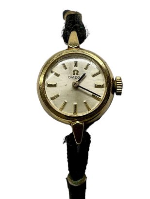 14K Working Omega Lady’s wristwatch with original omega band. Watch face is solid 14K, band is not. See photos for serial number. This has some scuffs and minor scratches but no deep ones. Has not been timed for accuracy. Engraved “LES 5-25-68”