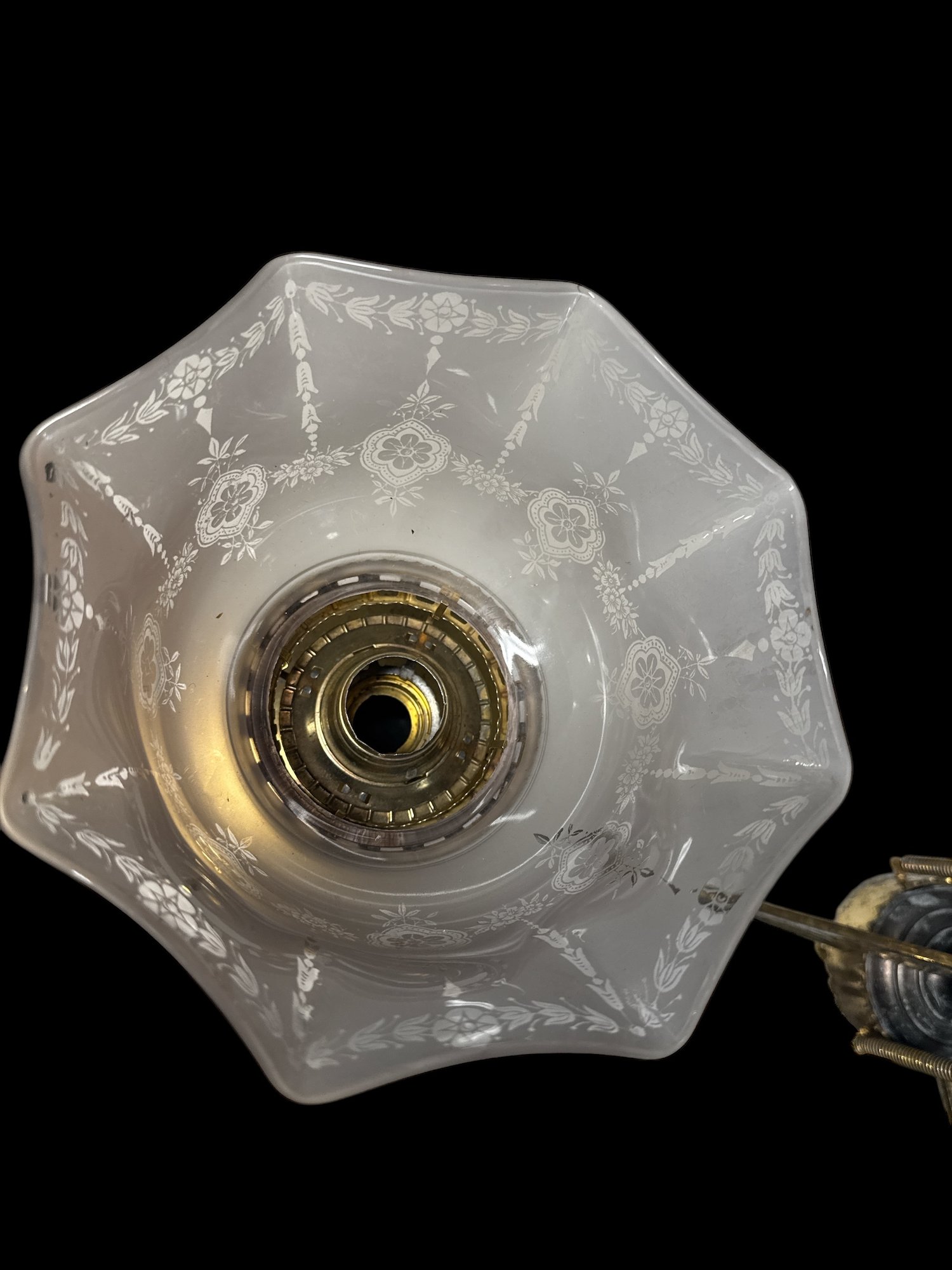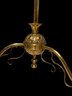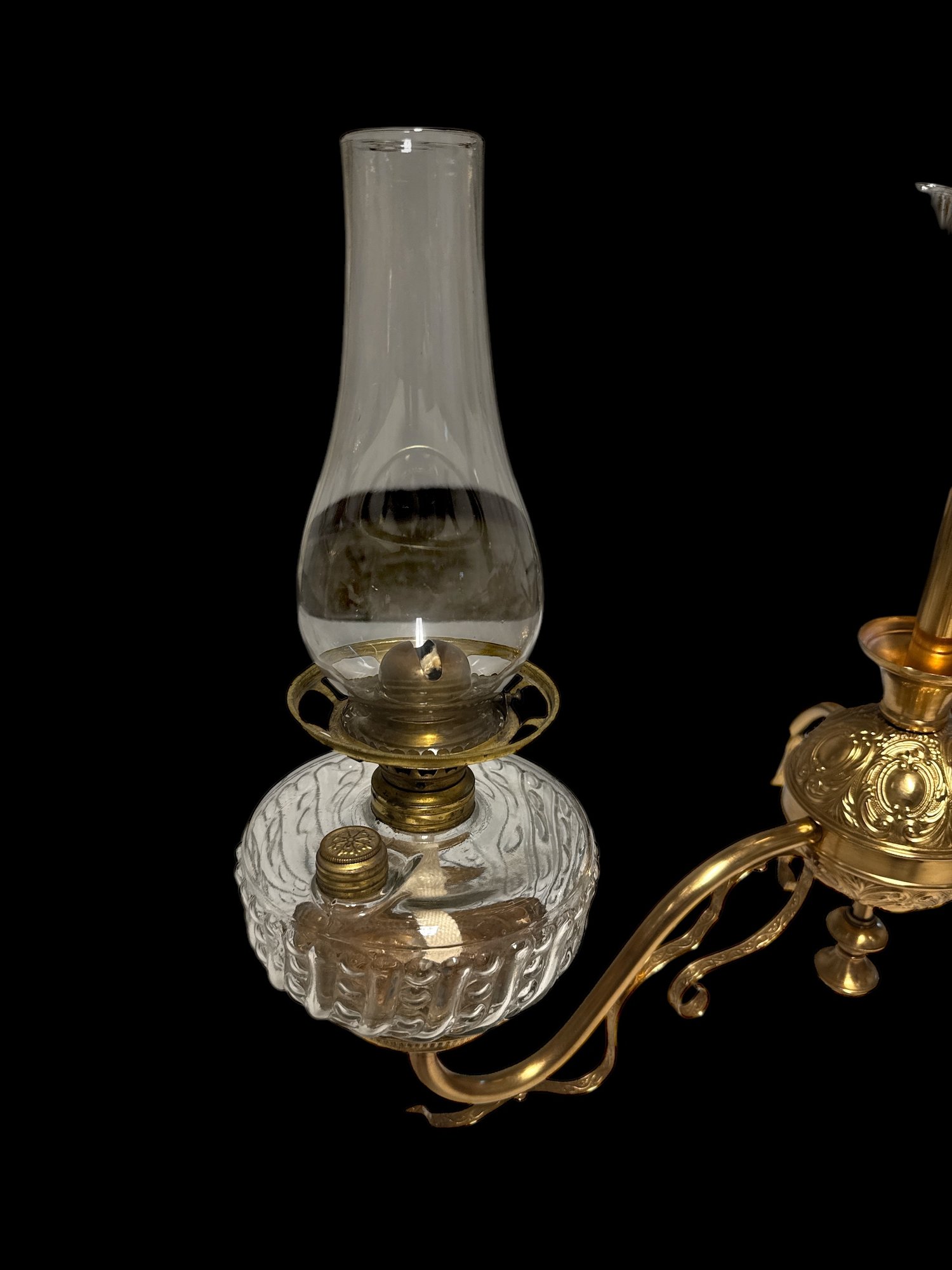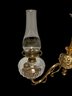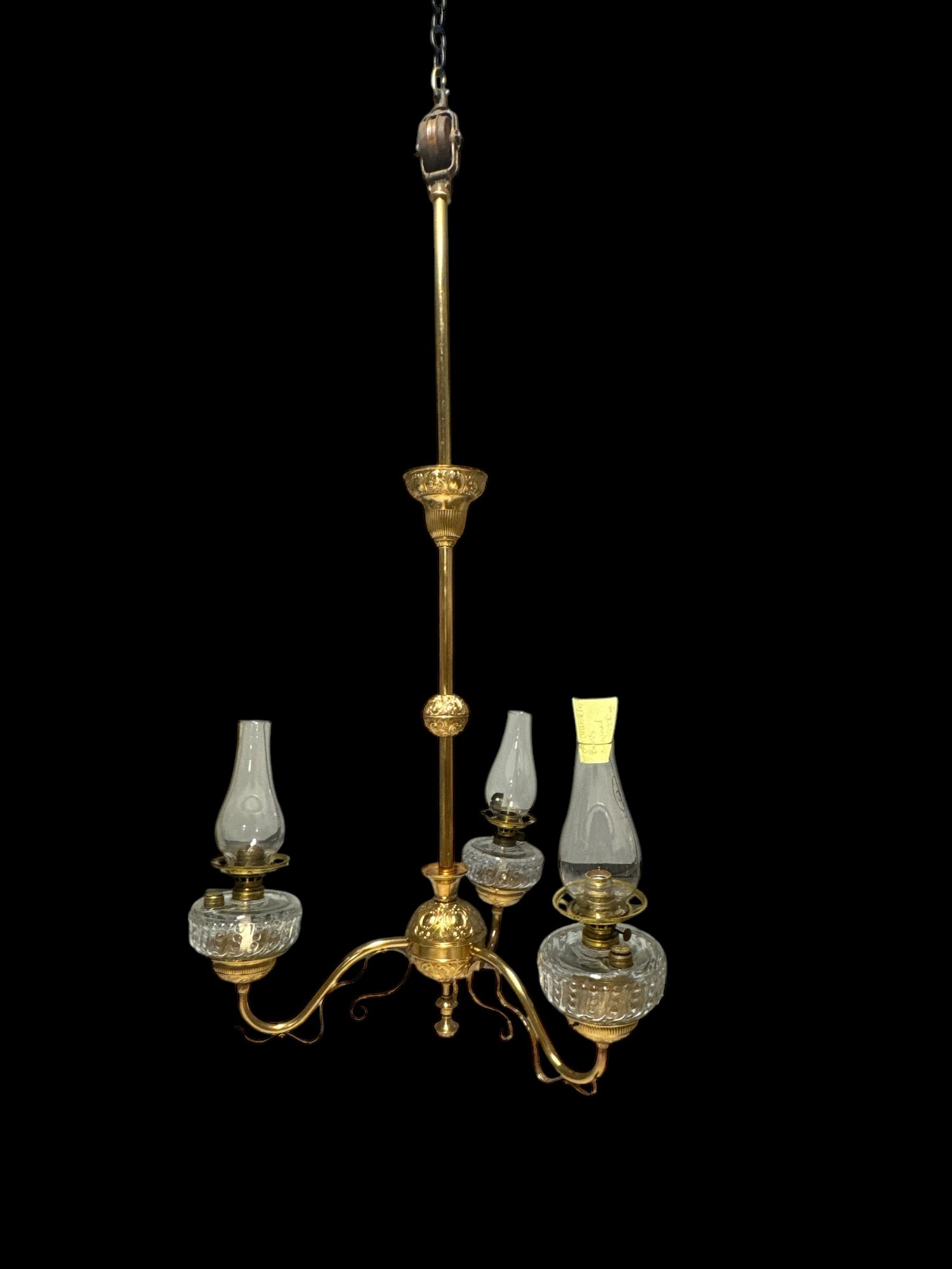 1870s Brass Oil Chandelier Original Chimneys Marked Acme Lead Flint. Burners have been hollowed out, but it has not been drilled for electricity. It measures 55" x 28"